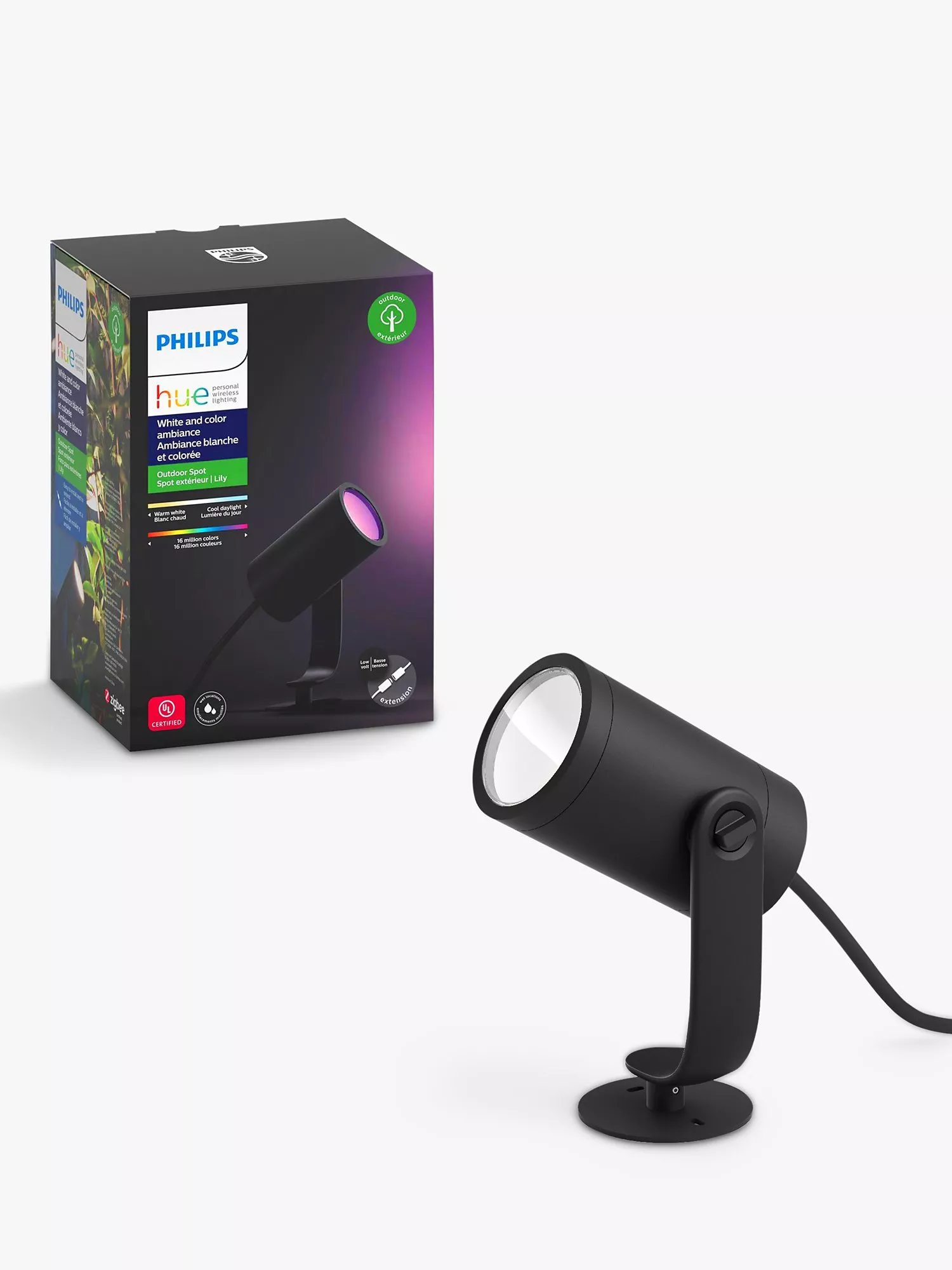 Plug in the Philips Hue Lily Spotlight extension and enjoy 16 million colours of shades of white light to highlight the beauty of your outdoor spaces. This extension includes one light point and requires the Lily base unit, or a 40/100W power supply unit to operate. The included detachable shield helps to reduce glare. It also requires a Philips Hue Bridge.