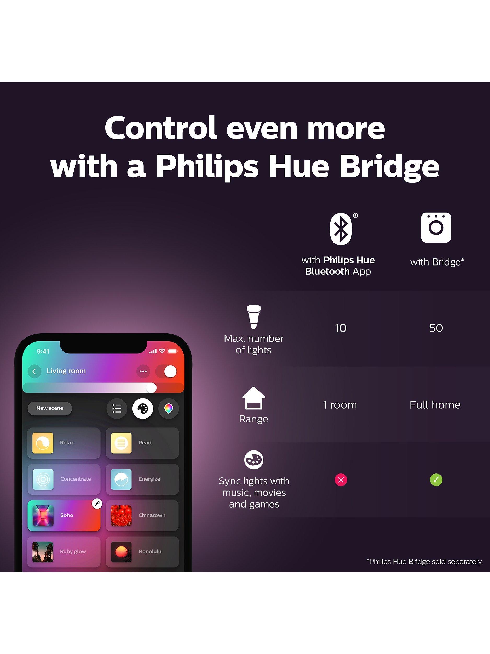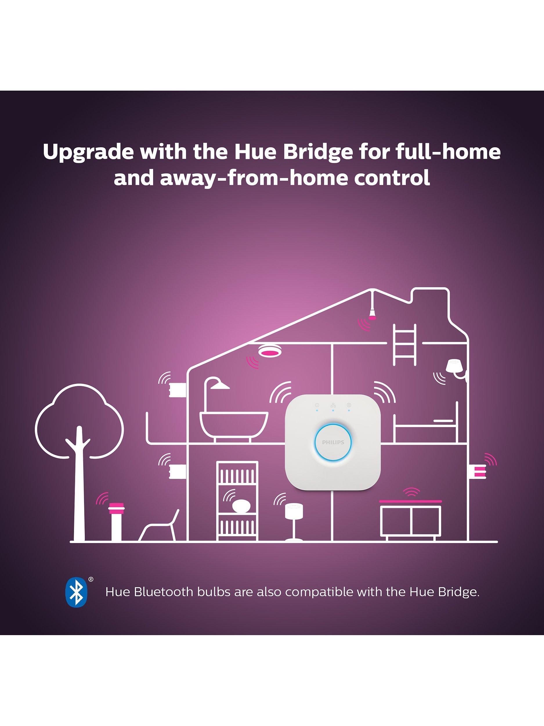 Please note: Hue bulbs require a separate Hue Bridge to connect to your home network for the full suite of available features. Hue Bridge can be purchased as part of a Hue Starter Kit.