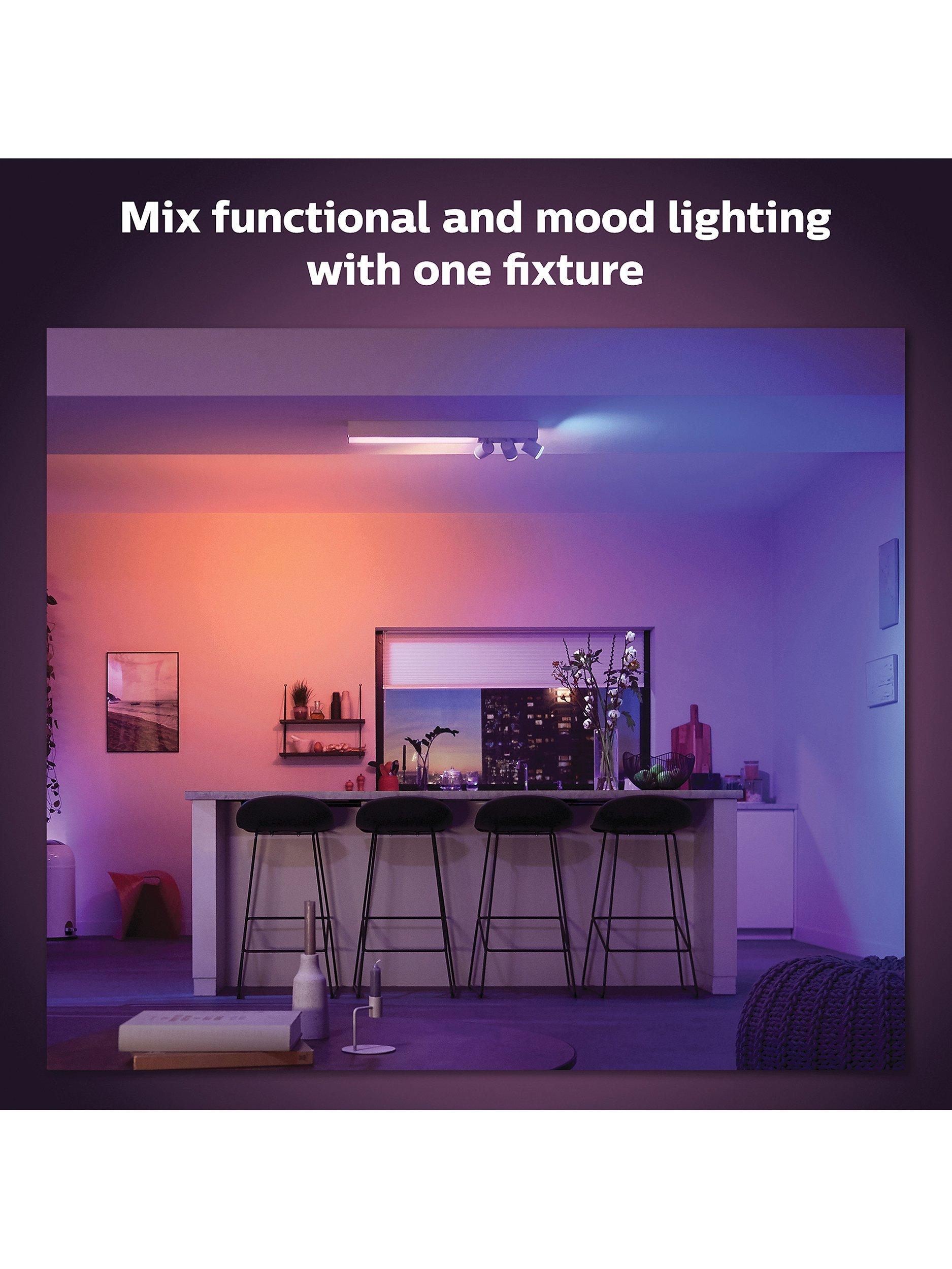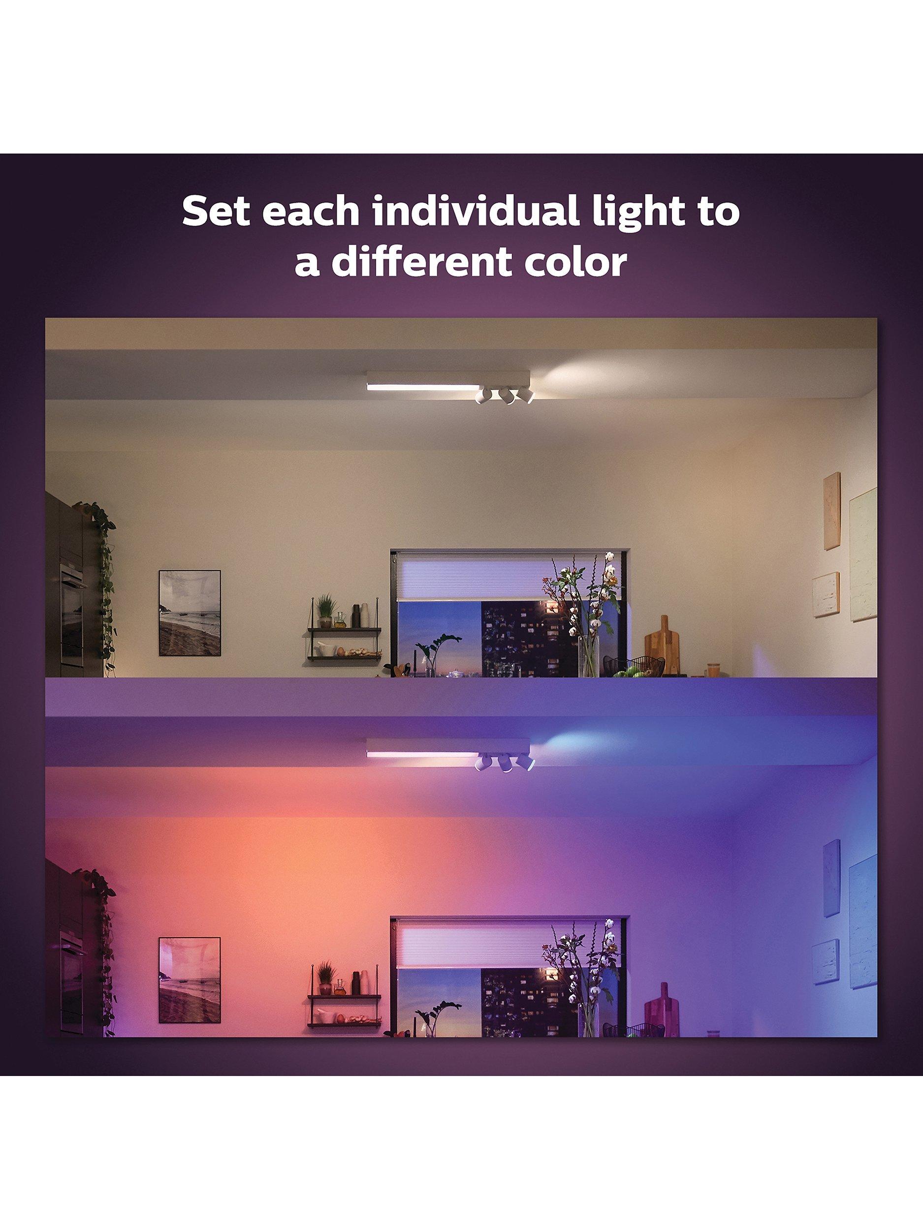 Get both functional and mood lighting in a single fixture. The white Centris has a fixed ceiling light and three spotlights that can be angled individually. Set each light in the fixture to any of millions of colours for a truly unique look. Part of the Philips Hue range.