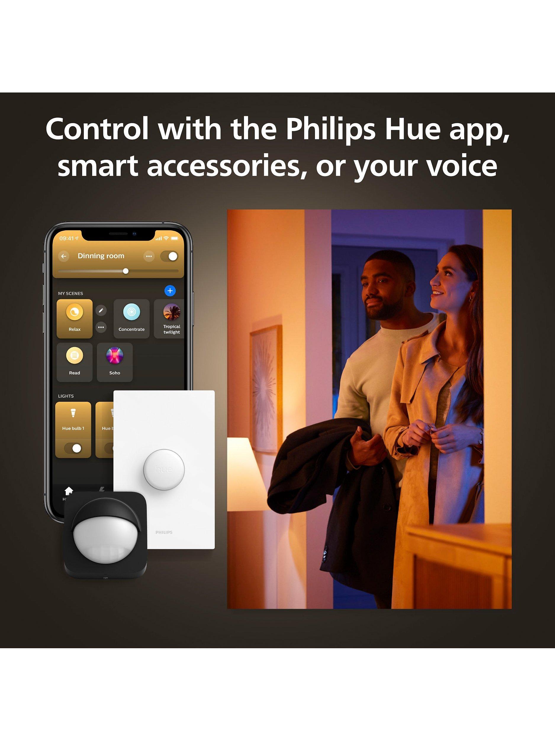 With the free 'Hue' app you can control your lights with movies and music from anywhere through your iOS and Android smart devices. And what's more, additional iOS and Android apps can get even more out of your Hue. Ambilight+hue (iOS and Android) can expand your TV viewing experience by extending your Ambilight TV colours to your Hue light bulbs, creating a more immersive experience. Ambify for iOS and hue Disco for Android make Hue react to music, providing you with an instant dance floor.