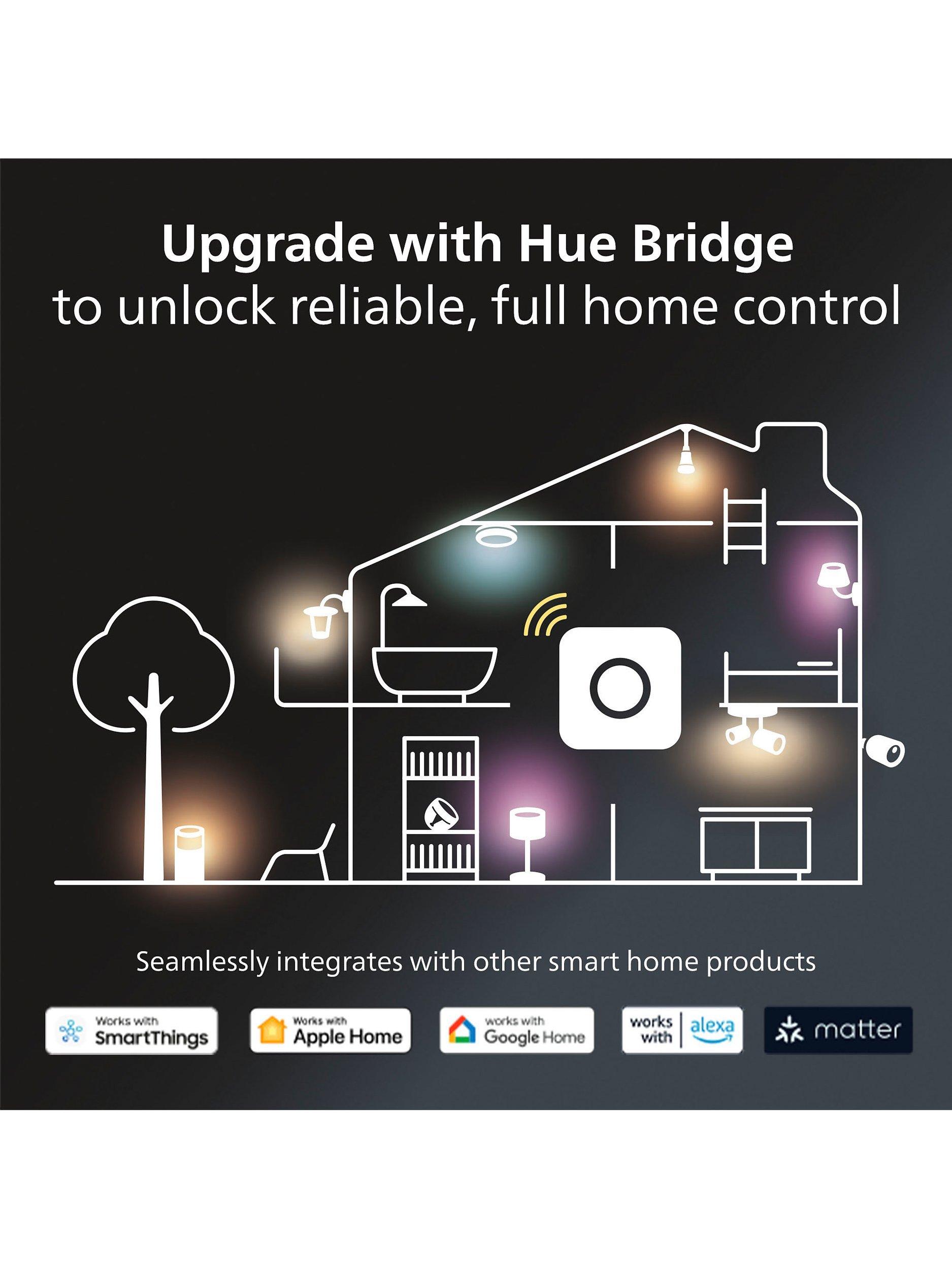 Please note: Hue bulbs require a separate Hue Bridge to connect to your home network for the full suite of available features. Hue Bridge can be purchased as part of a Hue Starter Kit.