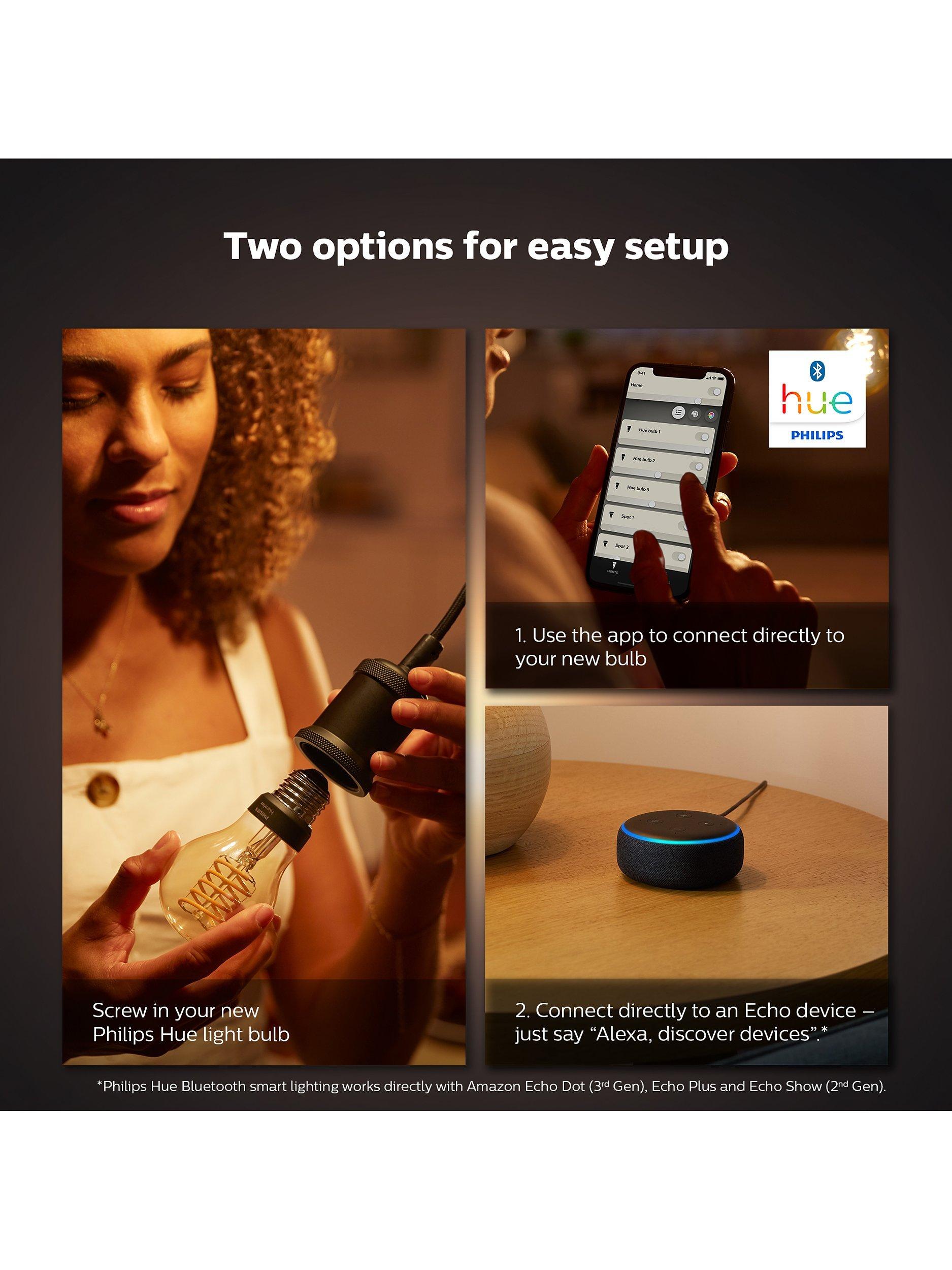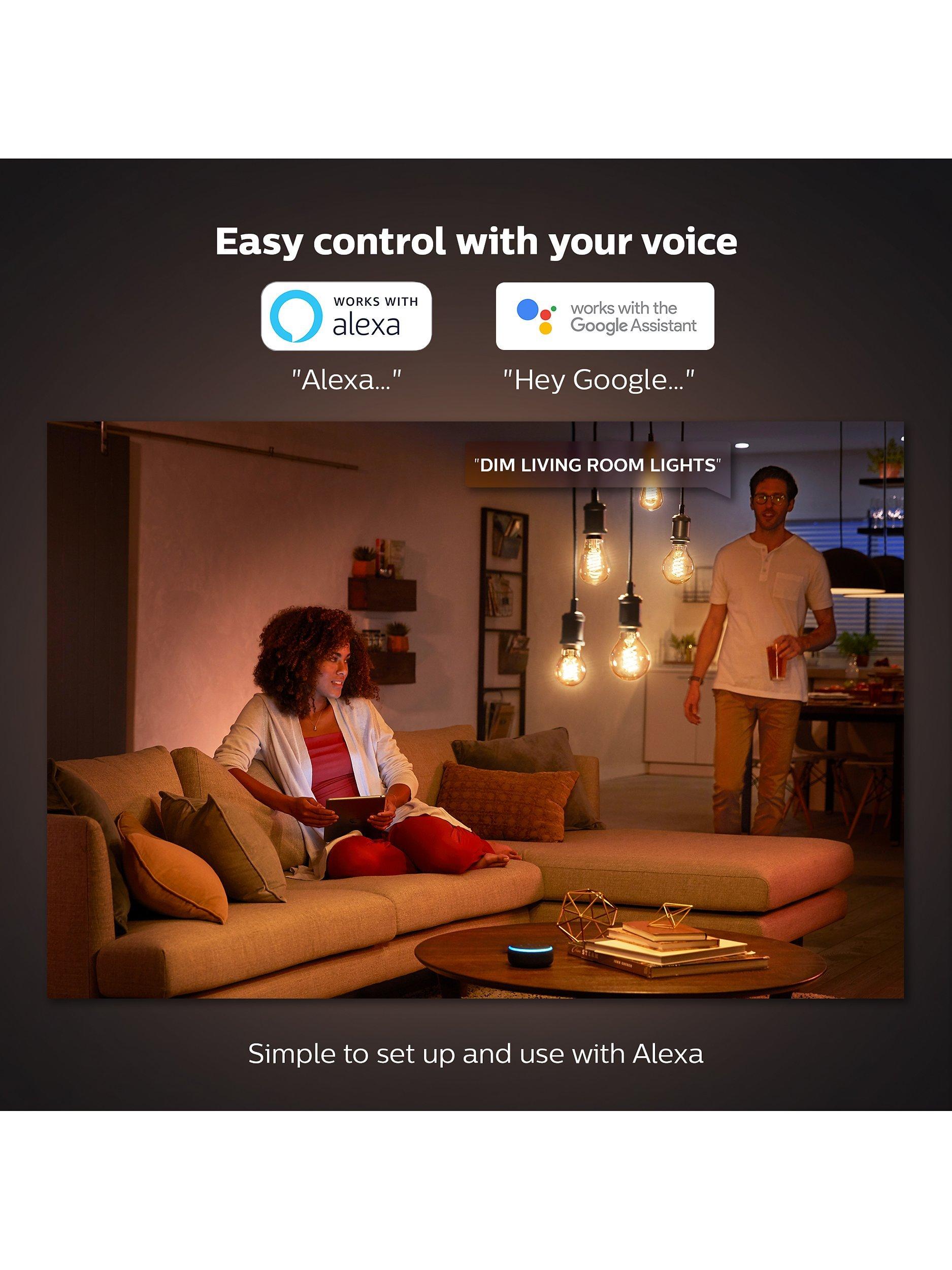 This Philips Hue LED smart light bulb allows you to play with light settings that suit your lifestyle. Easy to control from your smart device, it has a classic shape and retro inner filament coil, making it ideal for styling industrial-inspired interiors.