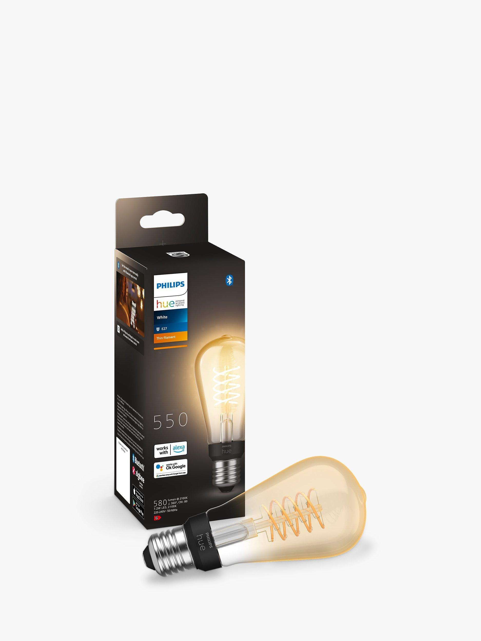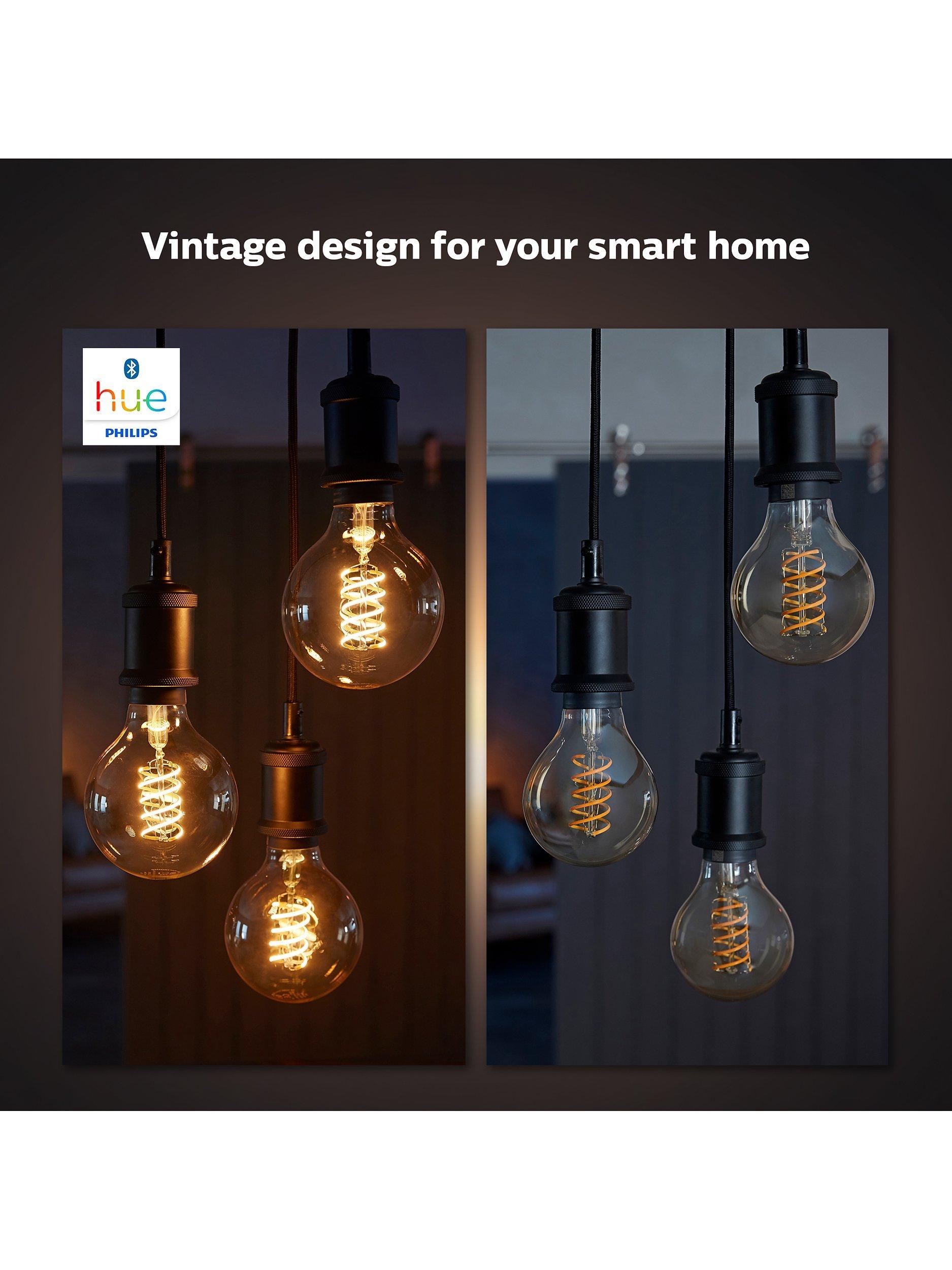 This Philips Hue LED smart light bulb allows you to play with light settings that suit your lifestyle. Easy to control from your smart device, it has a classic shape and retro inner filament coil, making it ideal for styling industrial-inspired interiors.