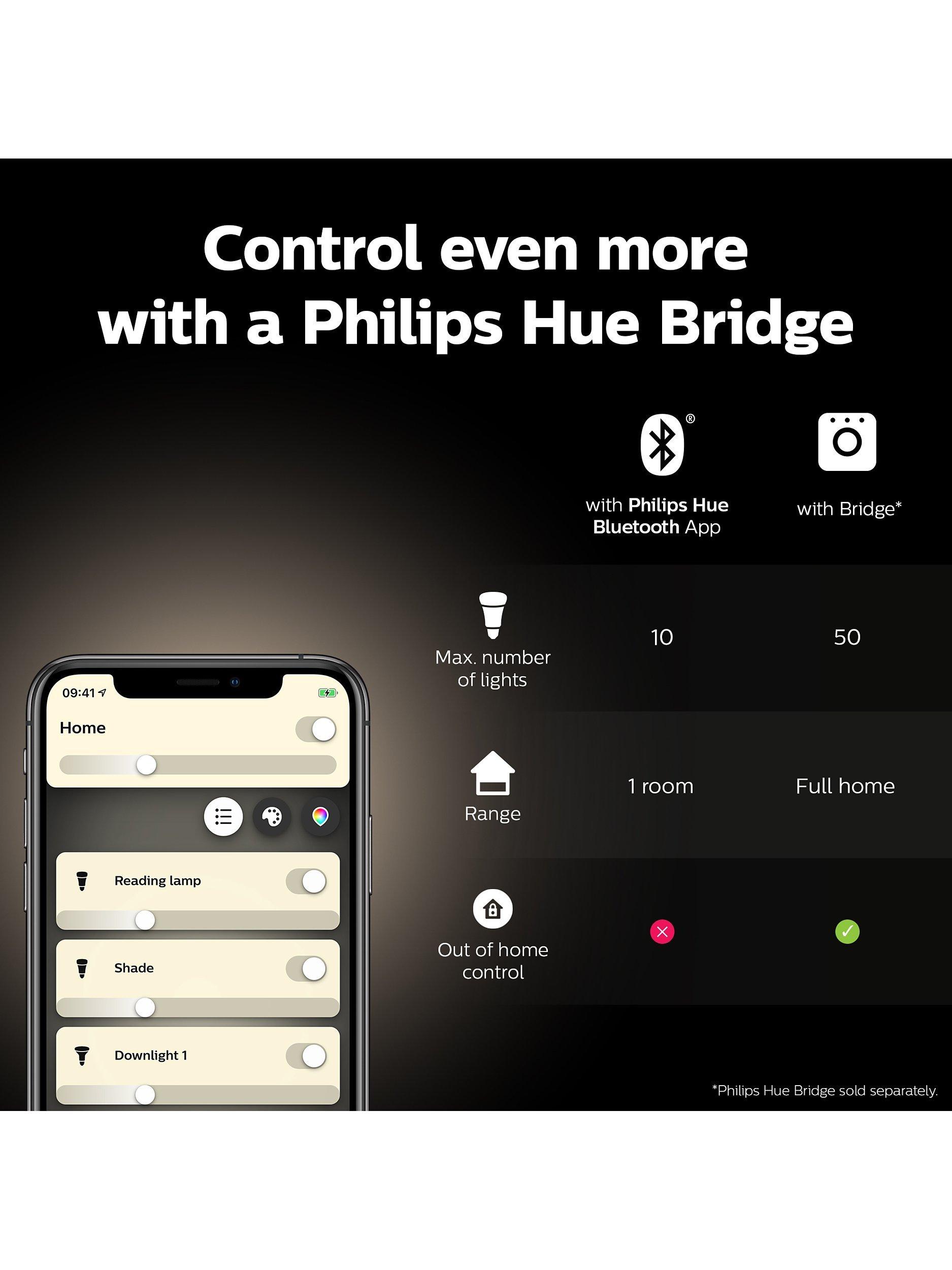 To experience the full potential of this smart light, connect to a Philips Hue Bridge (optional extra, available to purchase separately). Additional Philips Hue features include: setting timers and routines with light, controlling your lights remotely and automating your entire smart home lighting set up. There's also the option to add other accessories, including motion sensors and smart switches.