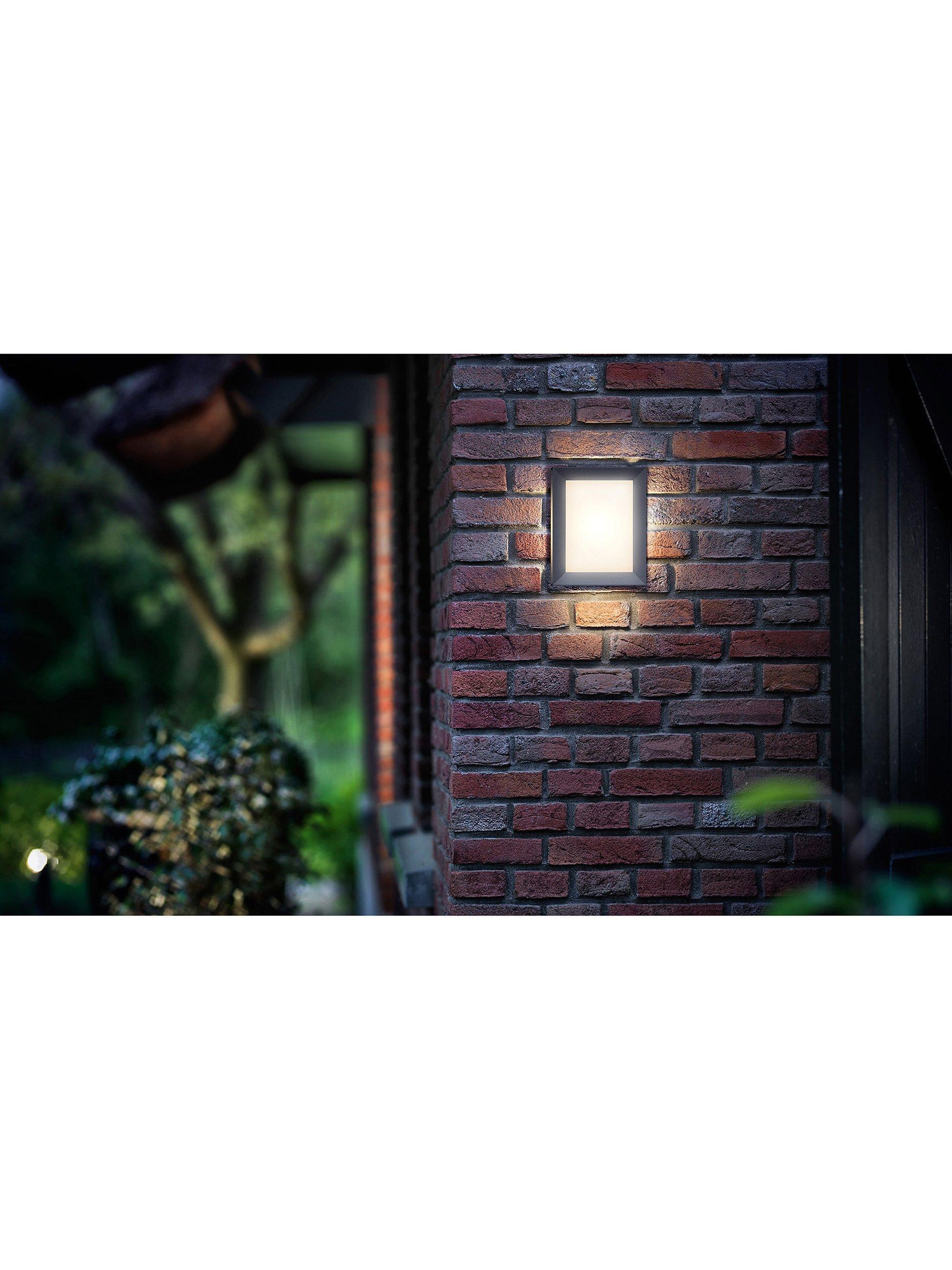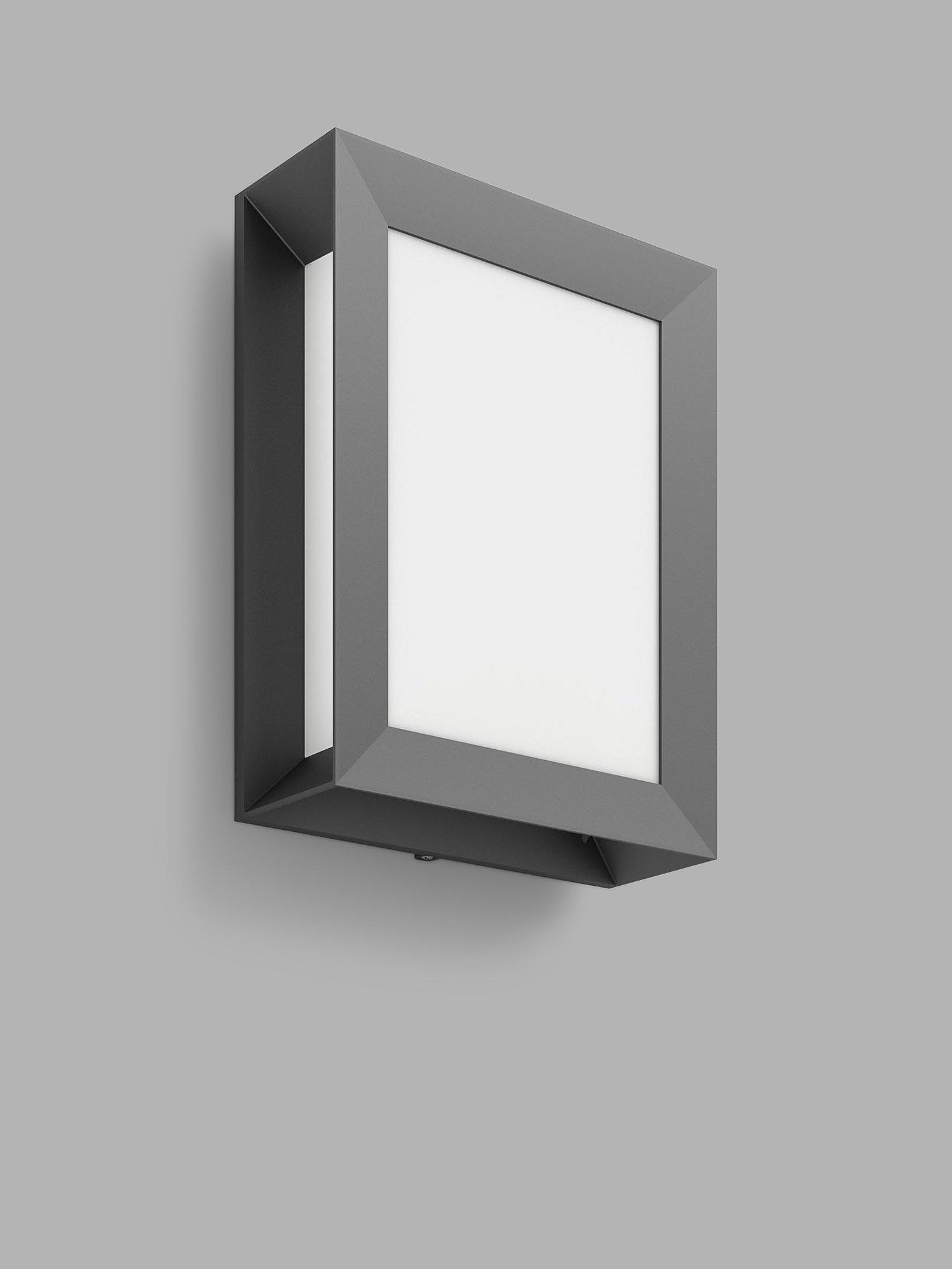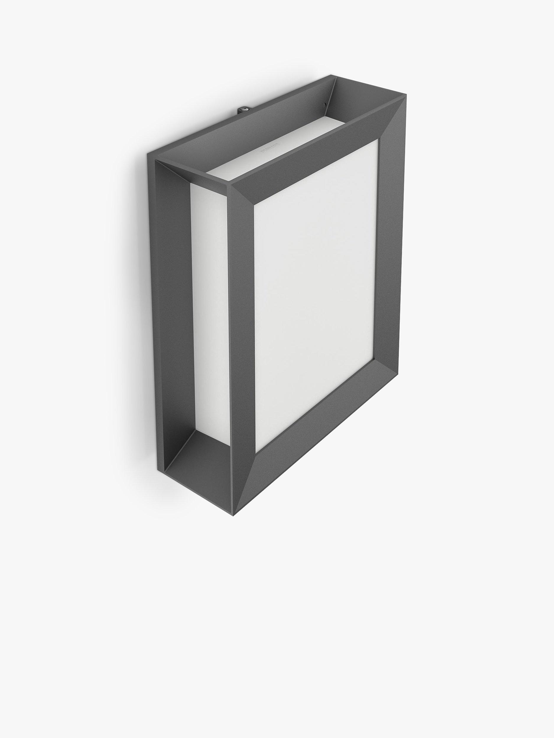 The Philips Karp LED outdoor wall light in anthracite grey suspends a large panel of diffused white light in an elegant frame of durable die cast aluminium.
