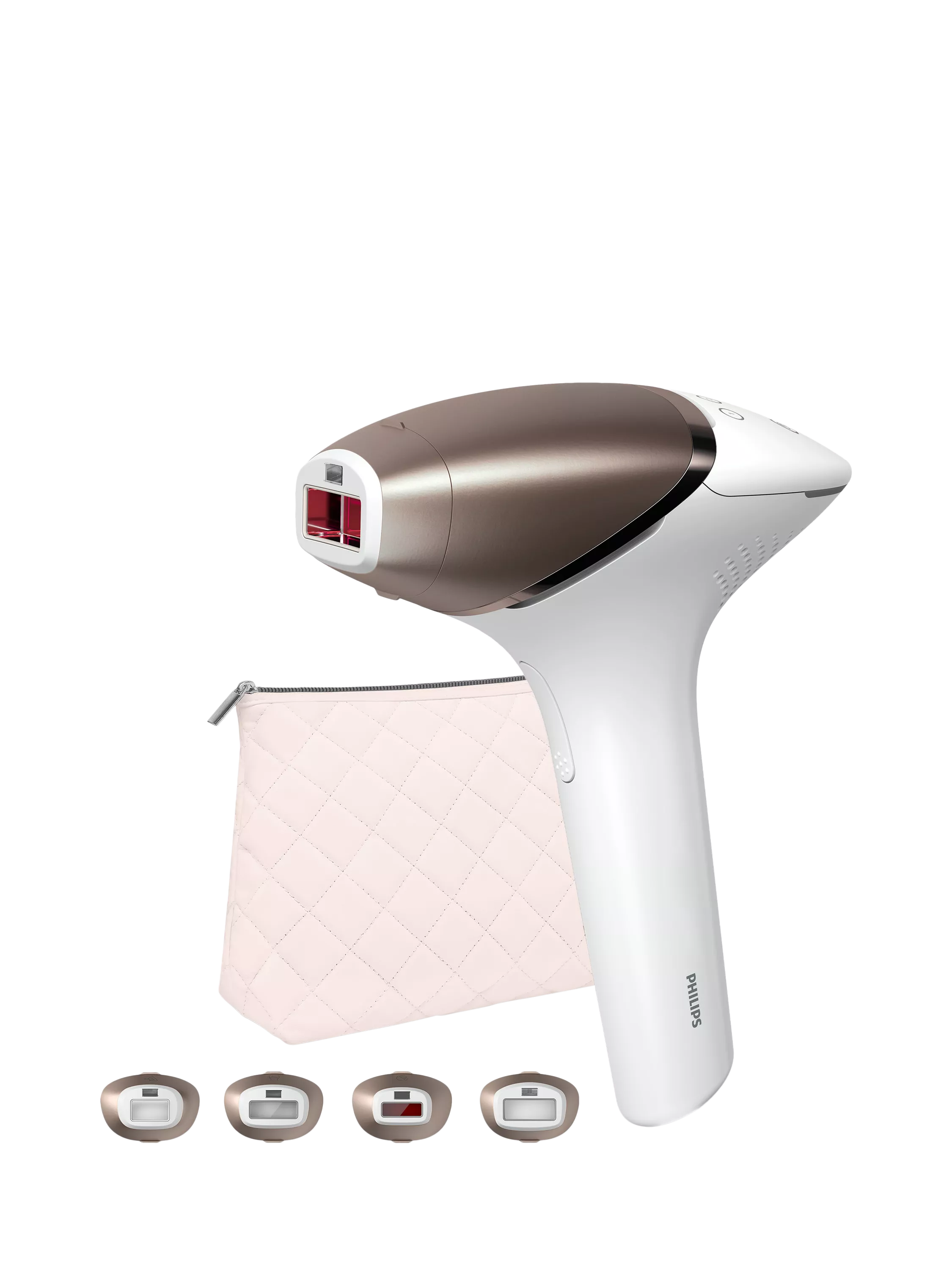 What's in the box? 1x Philips Lumea IPL hair removal 9900 Series (BRI951/01), 4x curved intelligent attachments for face, body, bikini and underarms, 1x luxurious pouch, 1x adapter, 1x cleaning cloth.