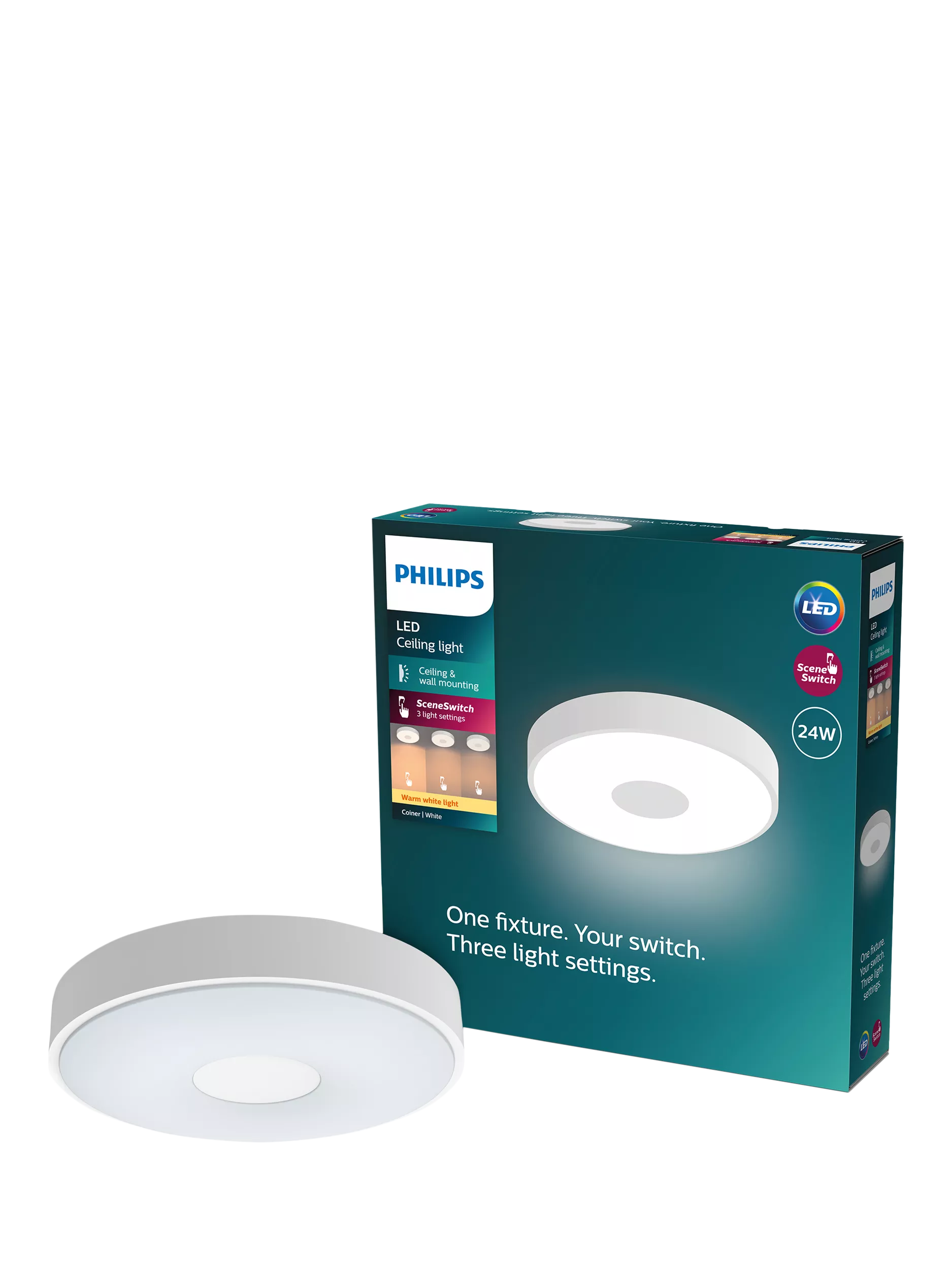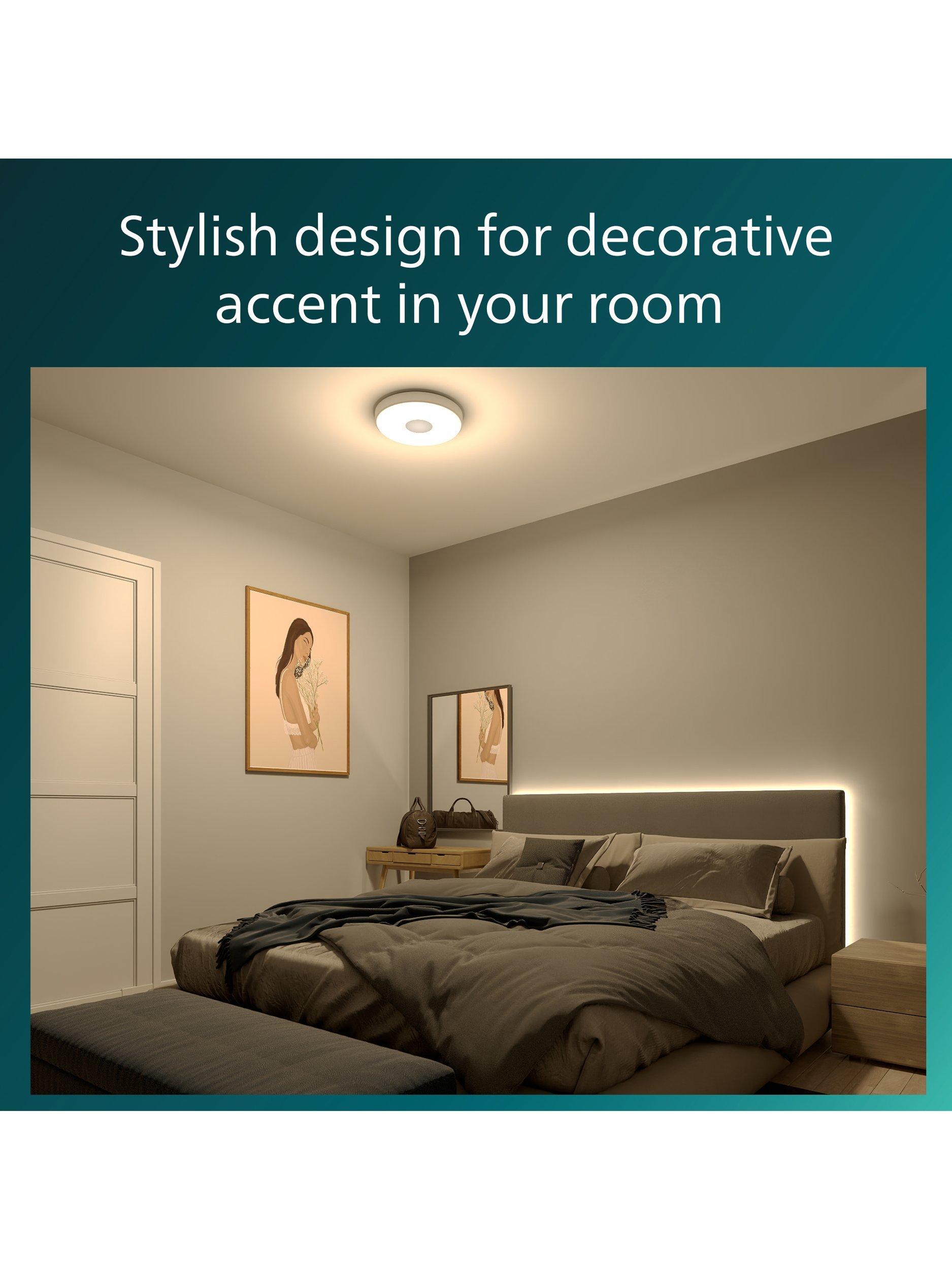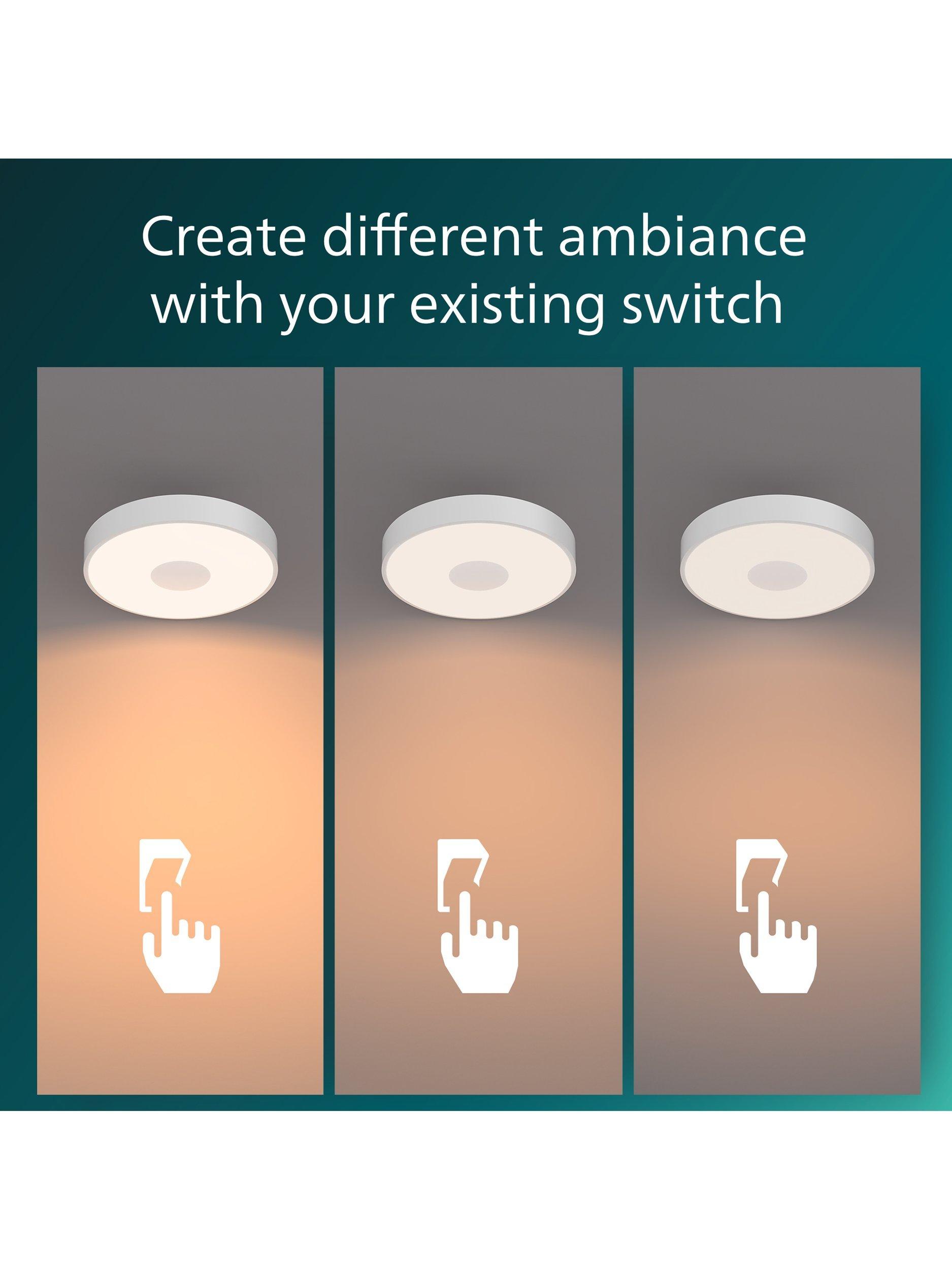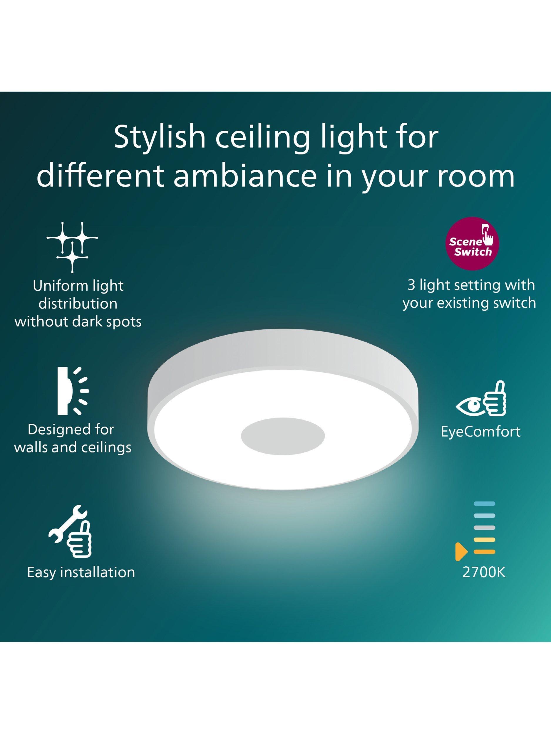 Create the right mood by changing brightness. The Philips SceneSwitch LED ceiling light lets you enjoy three warm white light brightness settings. Great for every moment. No dimmer or additional installation is required. All you need is your existing switch. Can be ceiling or wall-mounted.