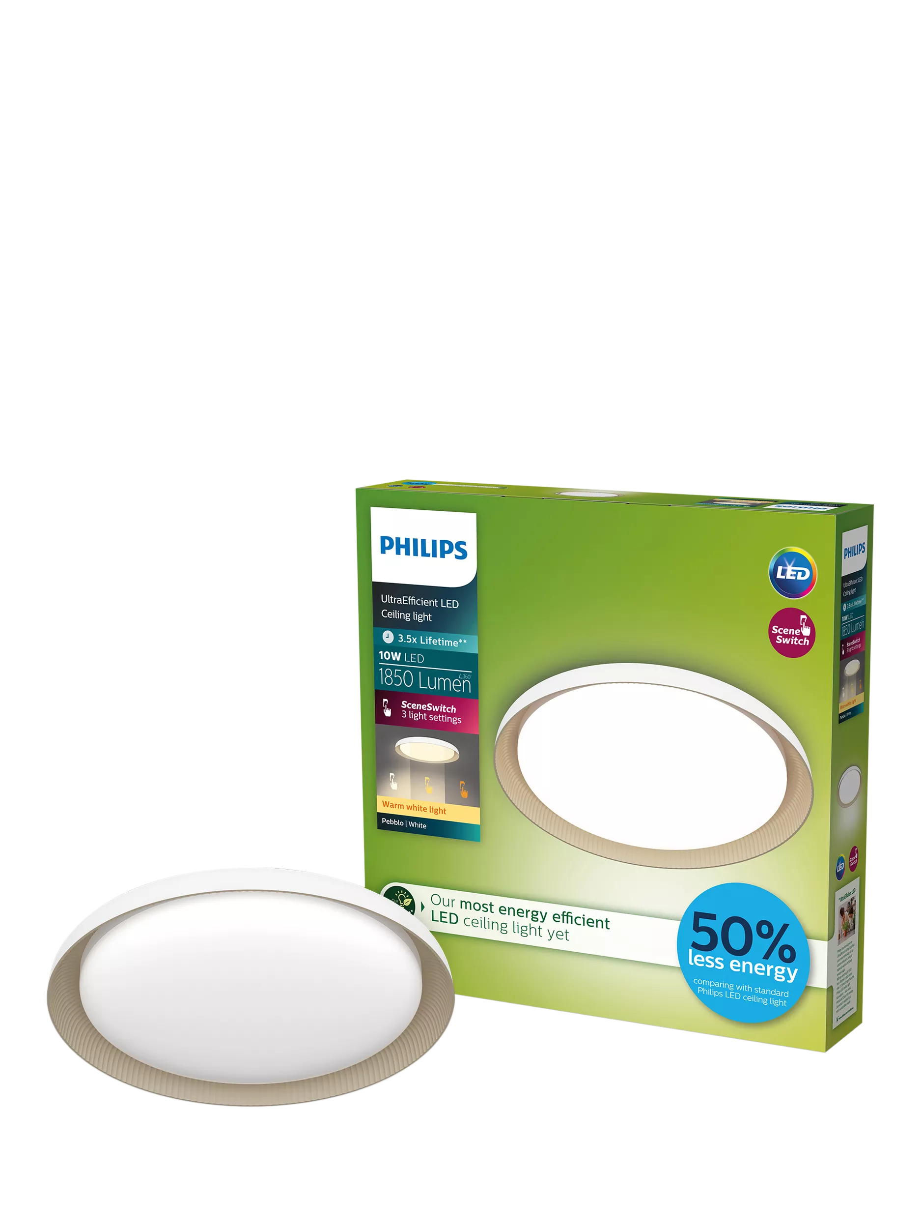 Part of Philip's Ultra Efficient range of LED bulbs, this light uses 50% less energy when compared with a standard Philips LED ceiling light.