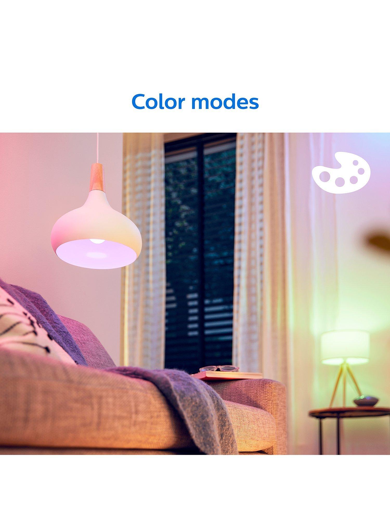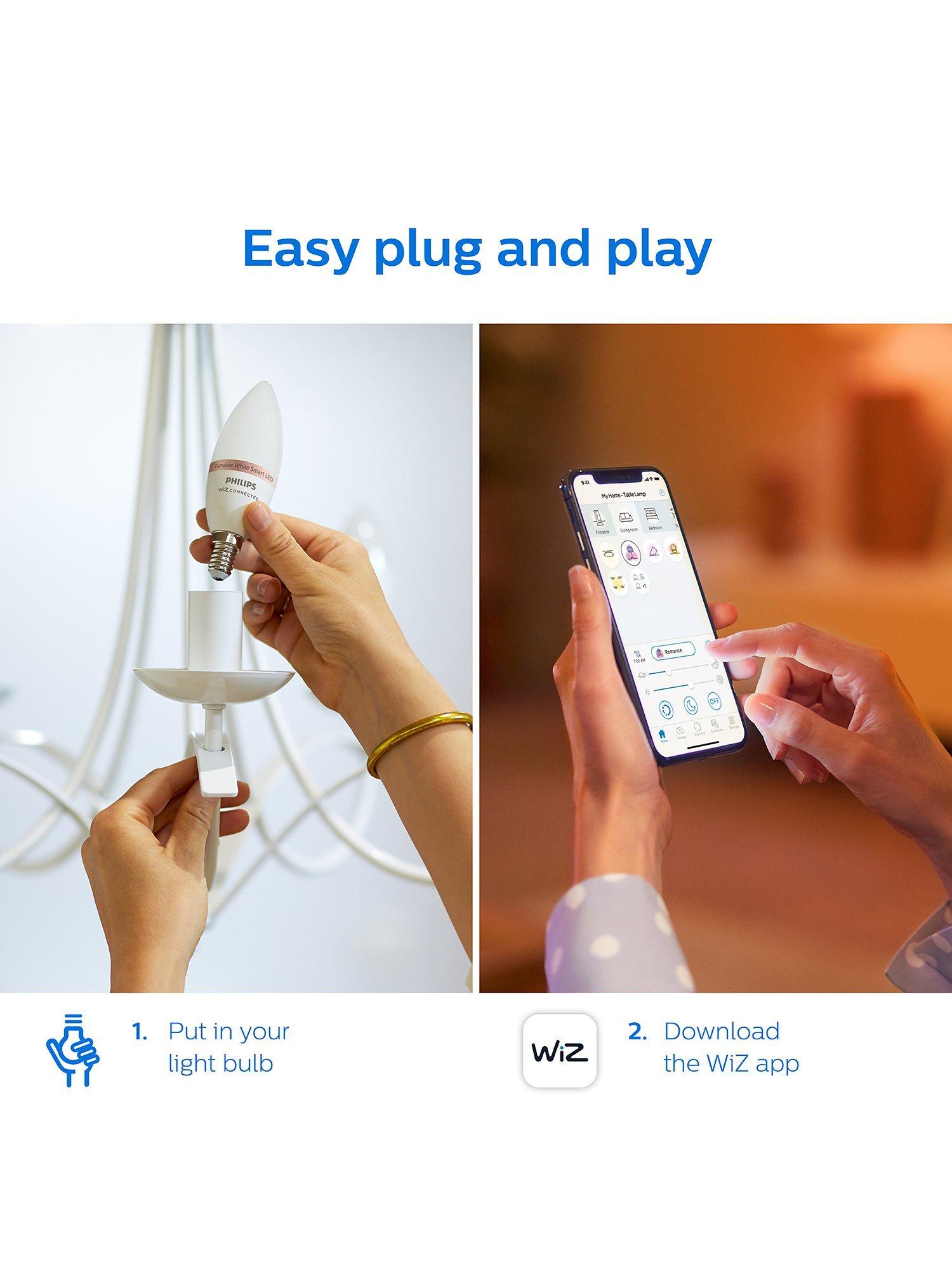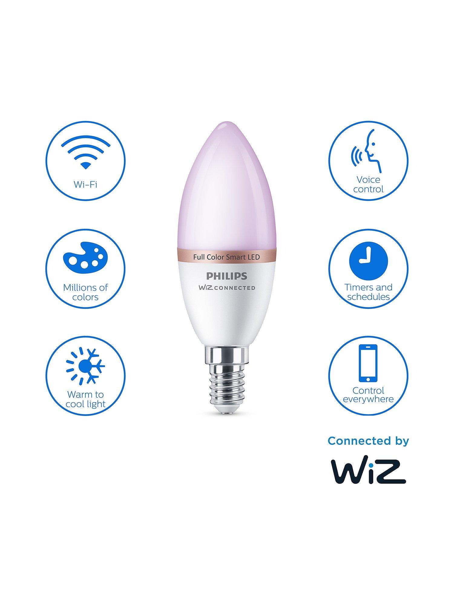 Enjoy more convenience in everyday life with this Philips E14 Smart LED light bulb connected by WiZ. These bulbs give 16 million colours that dim to your desired brightness level via app or voice. Pack of two.