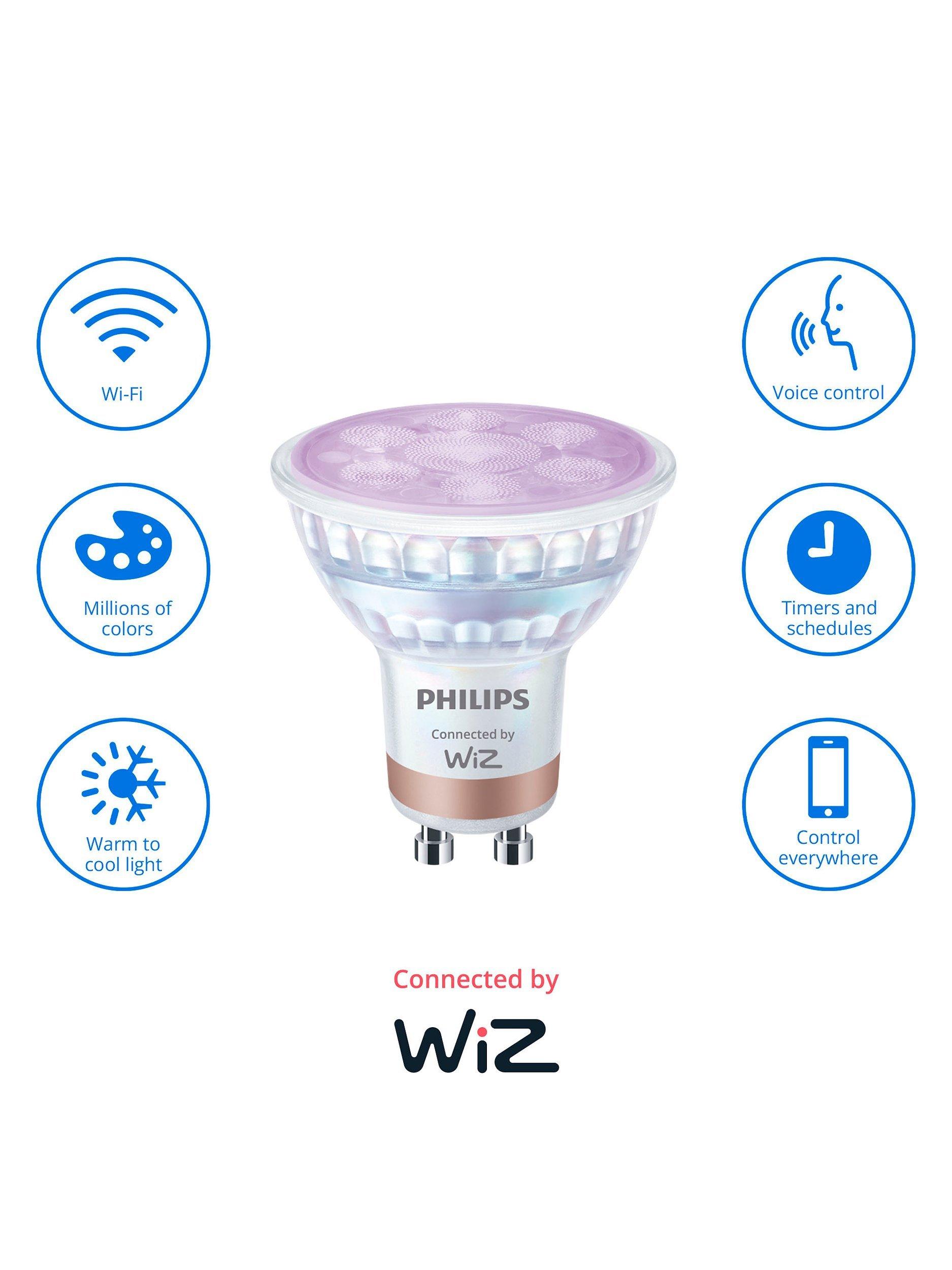 Enjoy more convenience in everyday life with this pack of two Philips GU10 Smart LED light bulbs connected by WiZ. These bulbs give 16 million colours that dim to your desired brightness level via app or voice.