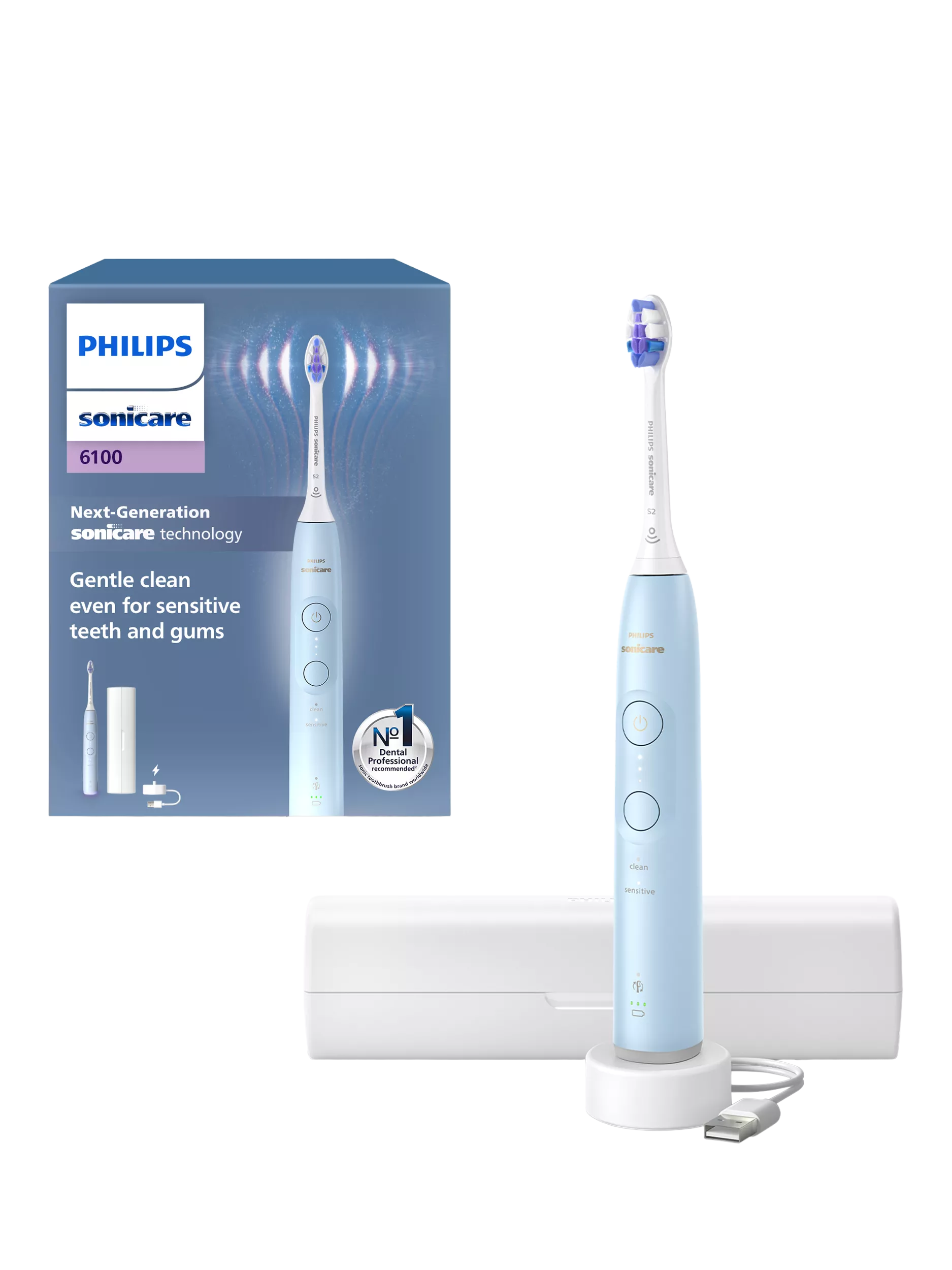 The Philips Sonicare Series 6100 Electric Toothbrush delivers a gentle brushing experience, perfect for sensitive teeth and gums. With the new S2 Sensitive brush head featuring Sonicare's softest bristles, it is specially designed to gently remove up to 10 times more plaque in hard-to-reach areas compared a manual toothbrush*