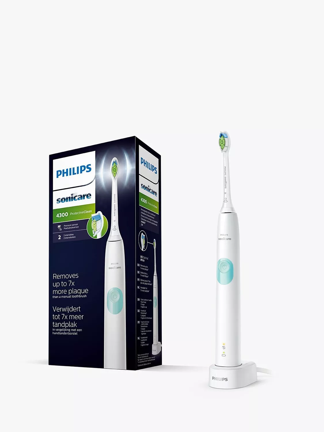 Philips Sonicare ProtectiveClean 4300 uses our unique sonic technology which drives fluid deep between teeth along with their specially designed brush heads to gently but effectively remove plaque in-between teeth and along the gum line. Simply brush with our Philips Sonicare ProtectiveClean 4300 for 2 minutes twice a day for increased plaque removal for healthier teeth and gums in just 2 weeks*.