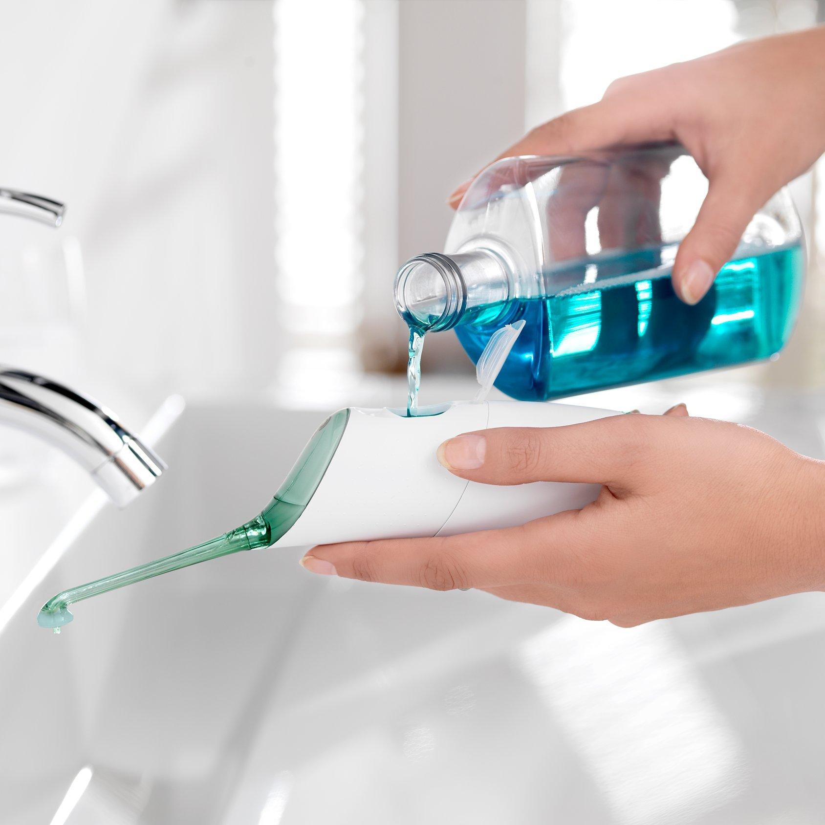 - Fill the reservoir It just needs two teaspoons of water or your favourite mouthwash for two full uses