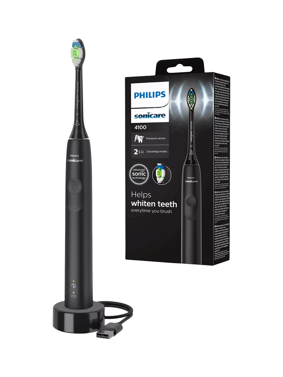 The Philips Sonicare 4100 electric toothbrush is designed to help you take the best care of your teeth and gums with 2 adjustable intensity levels to suit your dental care needs. Whether you prefer a boost of cleaning power with the high setting or a gentle yet thorough clean with the low setting, the Philips Sonicare 4100 has you covered.