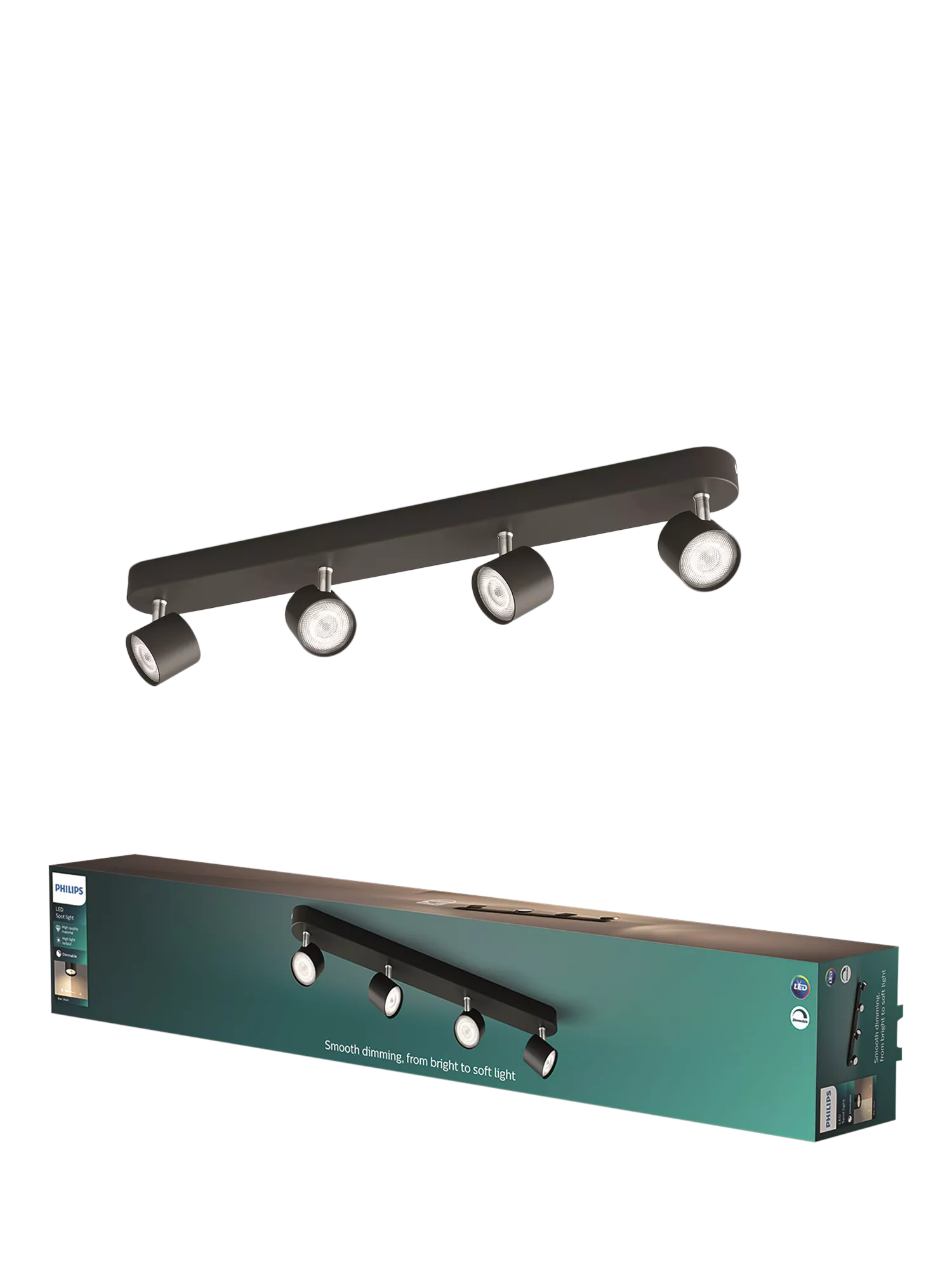 This Philips myLiving Star LED spotlight has a timeless elegance due to the chrome arm and a housing with a dark powder coating. With the Philips dimmable spot, you can easily dim to the right light level across the four spotlights. From functionally bright for everyday tasks, to a softer light for relaxation.