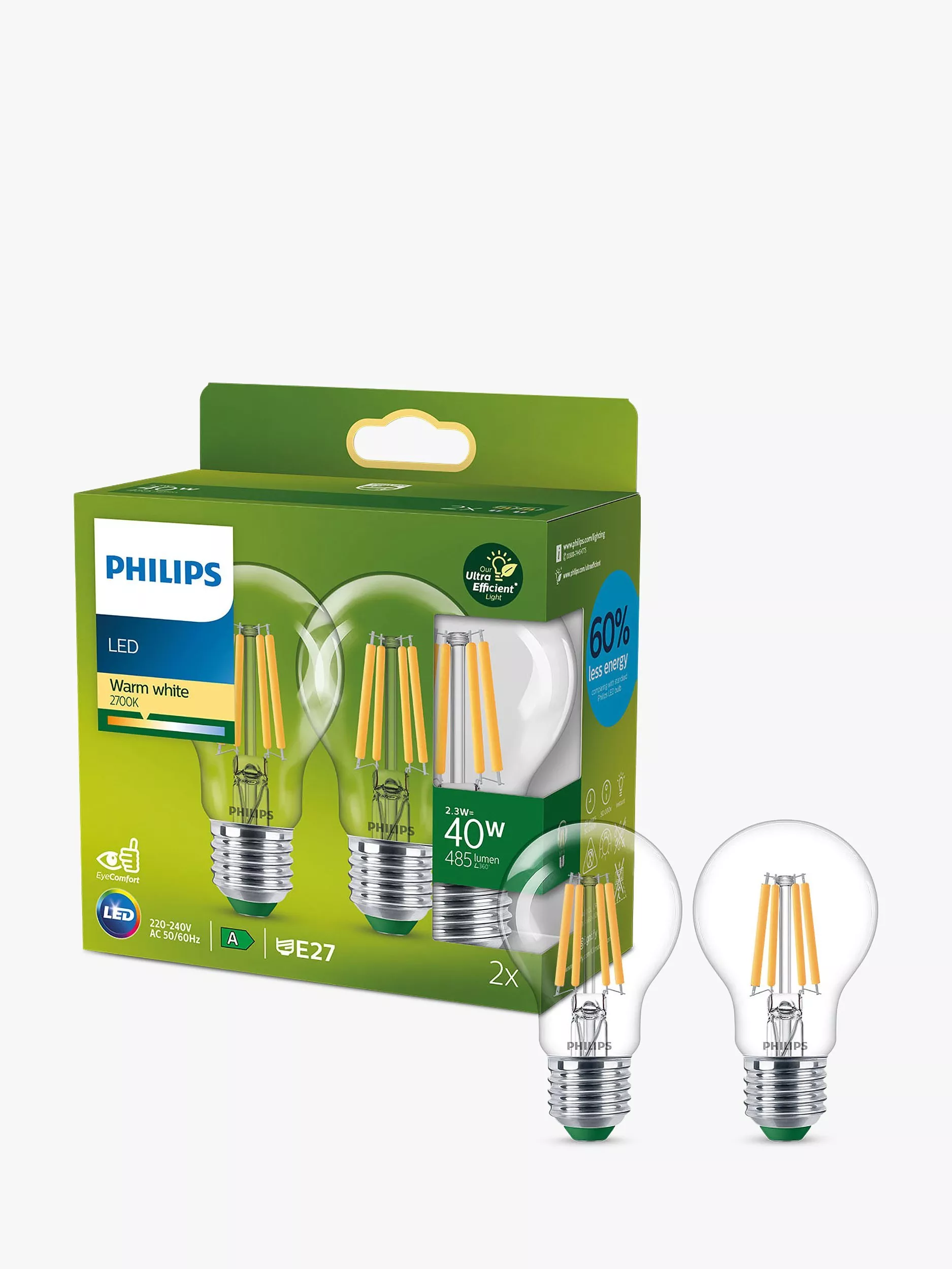 Part of Philip's Ultra Efficient range of LED bulbs, these two powerful bulbs are a brilliant replacement for your old incandescent bulbs. Each one uses 60% less energy when compared with a standard Philips LED bulb and provides a beautiful, warm white light, with an exceptionally long life and immediate, significant energy savings.