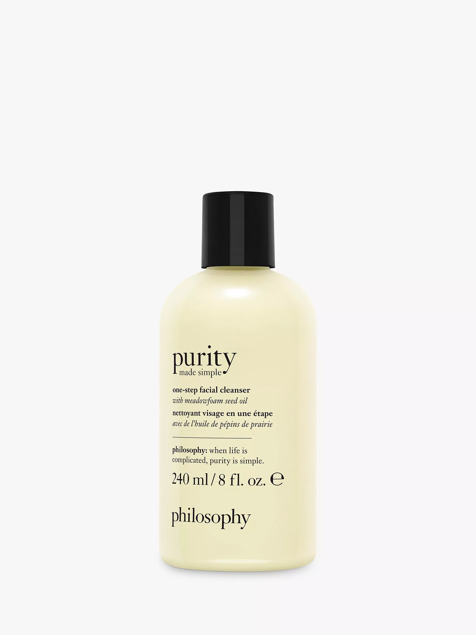 Purity Made Simple One-Step Facial Cleanser with meadowfoam seed oil is an award-winning cleanser that melts away dirt, oil and makeup. It tones and lightly hydrates in one simple step for skin that feels perfectly cleaned and comfortably balanced. Formulated for normal-to-dry skin types and gentle enough for the sensitive eye area, it deep cleans pores while the meadowfoam seed oil extract helps condition the skin.