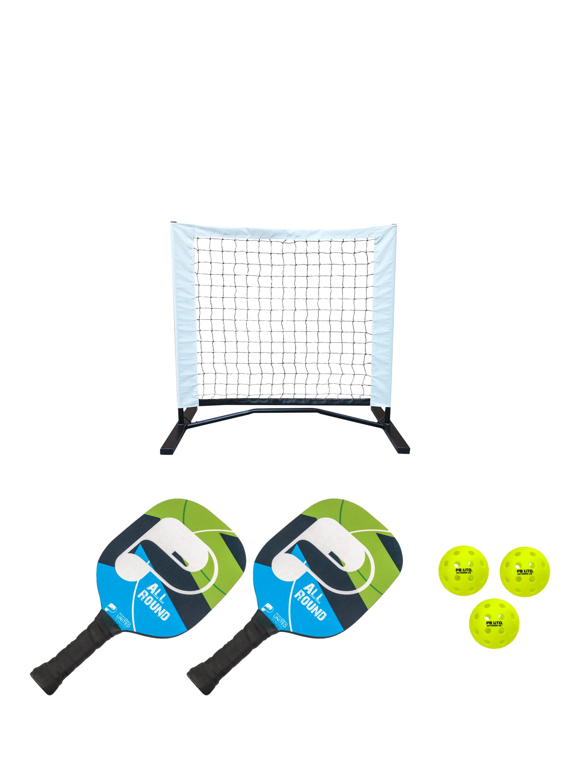 The Pickleball United 3ft Dinking Set consists of 2 All Round paddles, 3 Freedom outdoor balls and a 3ft driveway net.