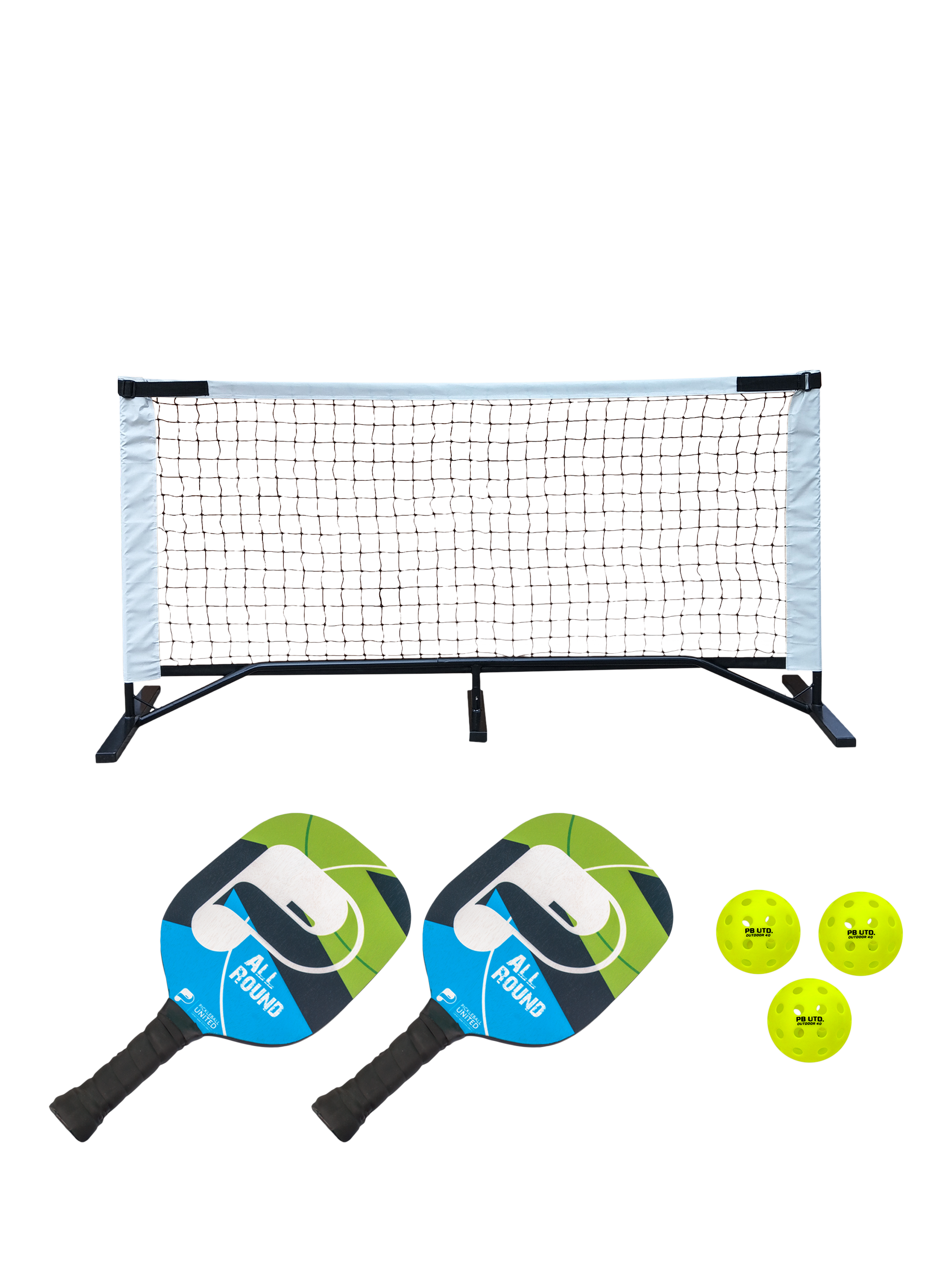 The Pickleball United 6" starter set consists of 2 All Round Paddles, 3 Freedom outdoor balls and a 6" driveway net.