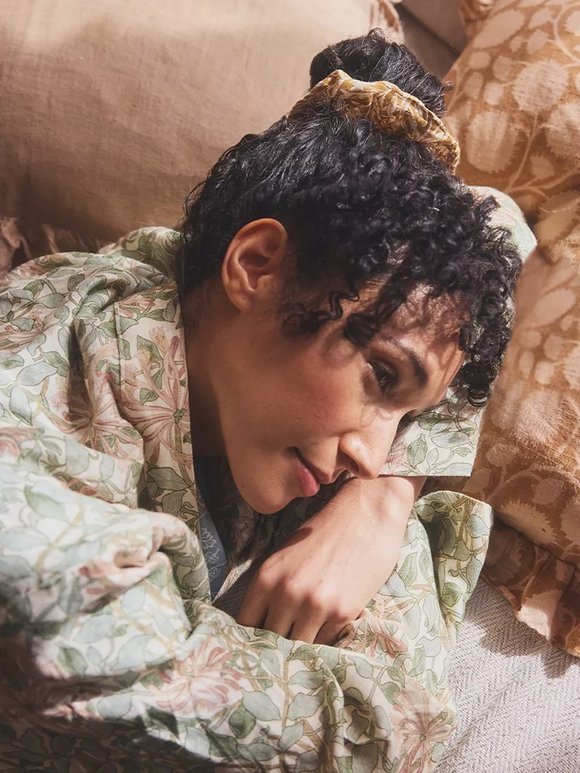 A beautiful pure linen hair scrunchie showcasing one of Morris & Co.'s iconic designs.