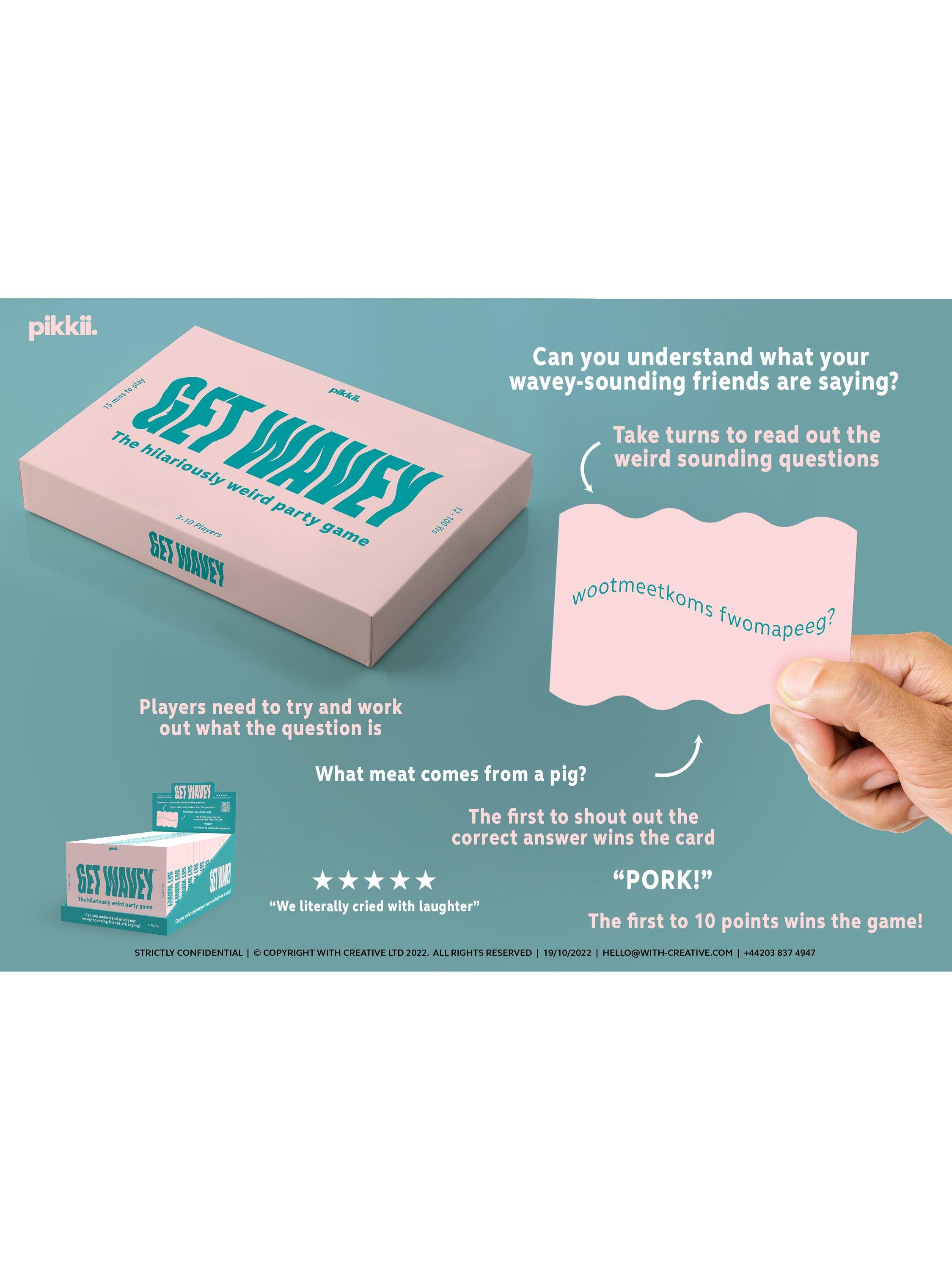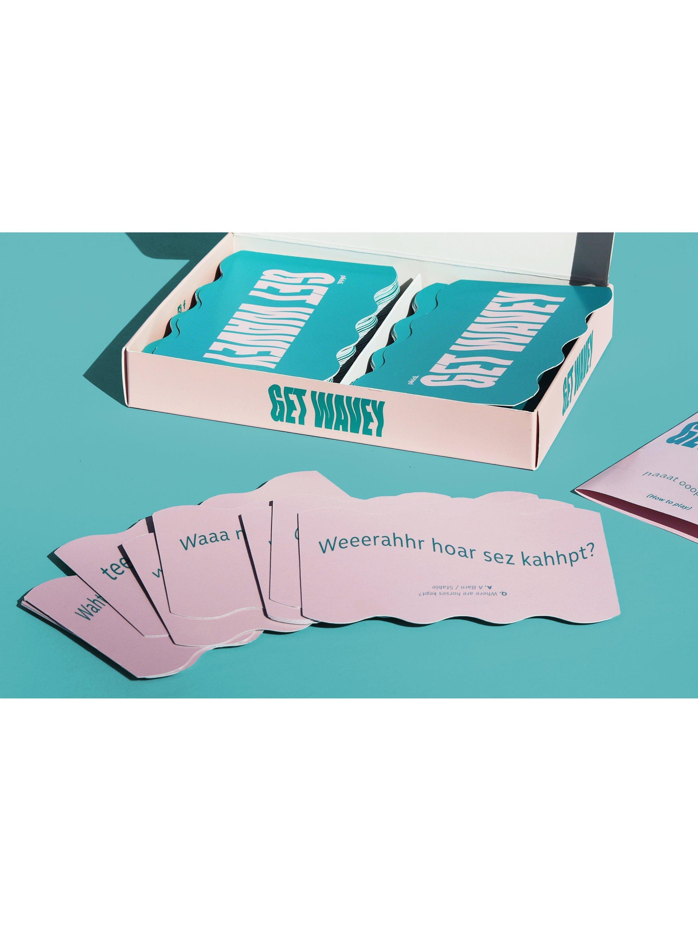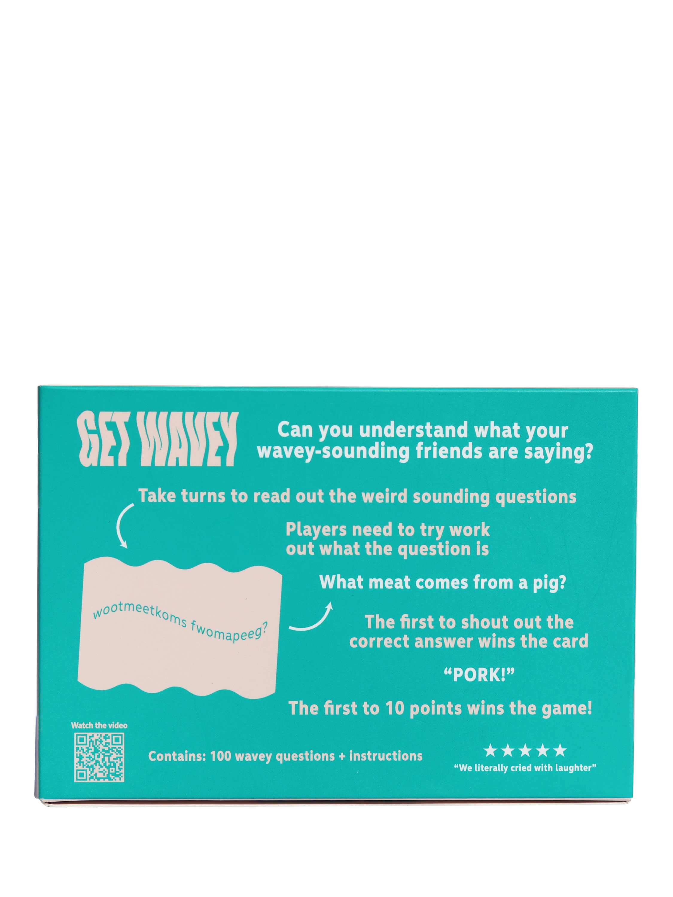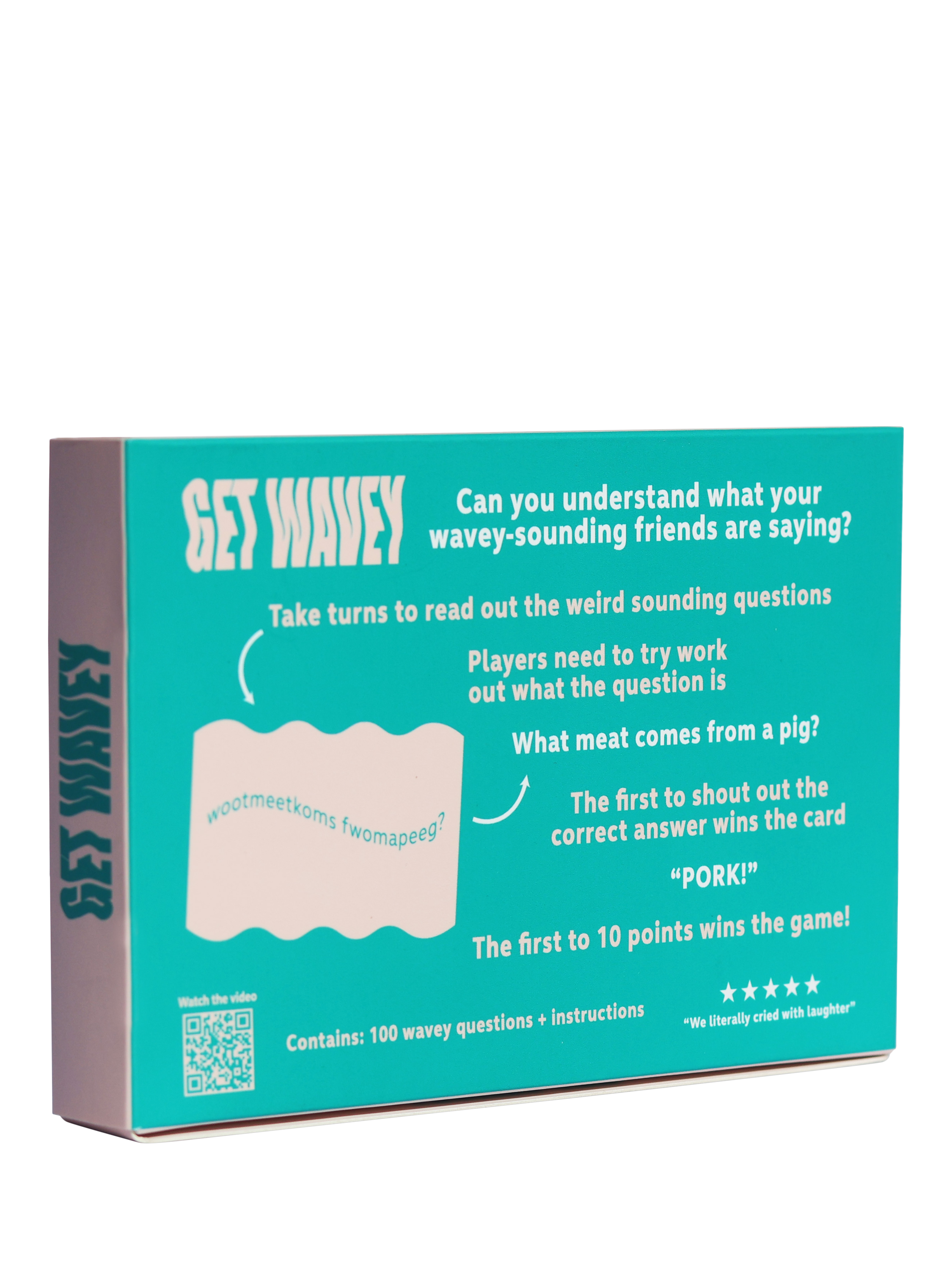 Get Wavey is the ultimate family party game of general knowledge with a wavey twist! You're about to get wavey...This hilarious new party game will have you feel like you're slurring your words as you attempt to read out wavey-sounding questions that will totally throw off your opponents. Can you guess what your wavey-sounding friends are saying?