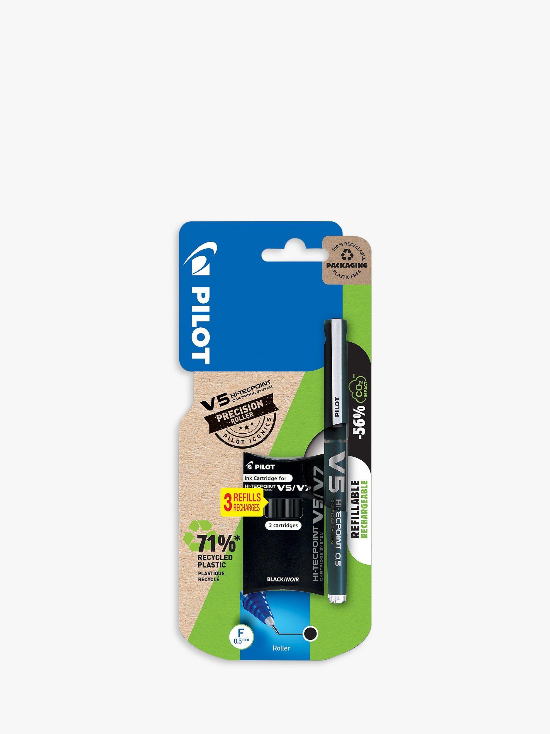 The Pilot V5 black liquid ink pen is made partly from recycled material and has a refillable liquid ink cartridge. Its Hi-TechPoint tip allows for clear precise writing and there's a visible ink level so you can see when it's ready to top up.