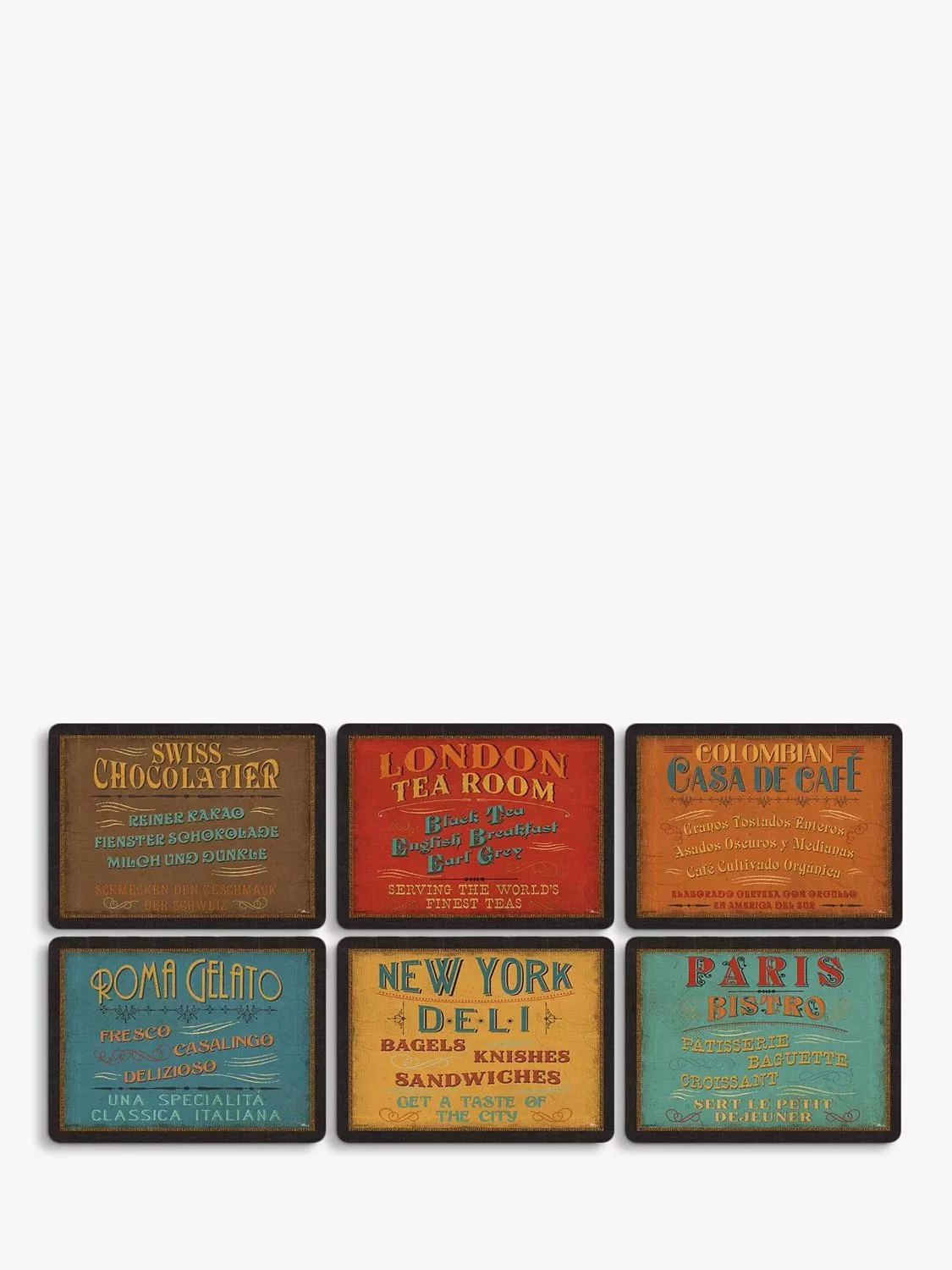 A set of six placemats and six coasters from Pimpernel, with vintage-inspired 'Lunchtime' signs, from tea in London, ice cream in Rome to bagels in New York.