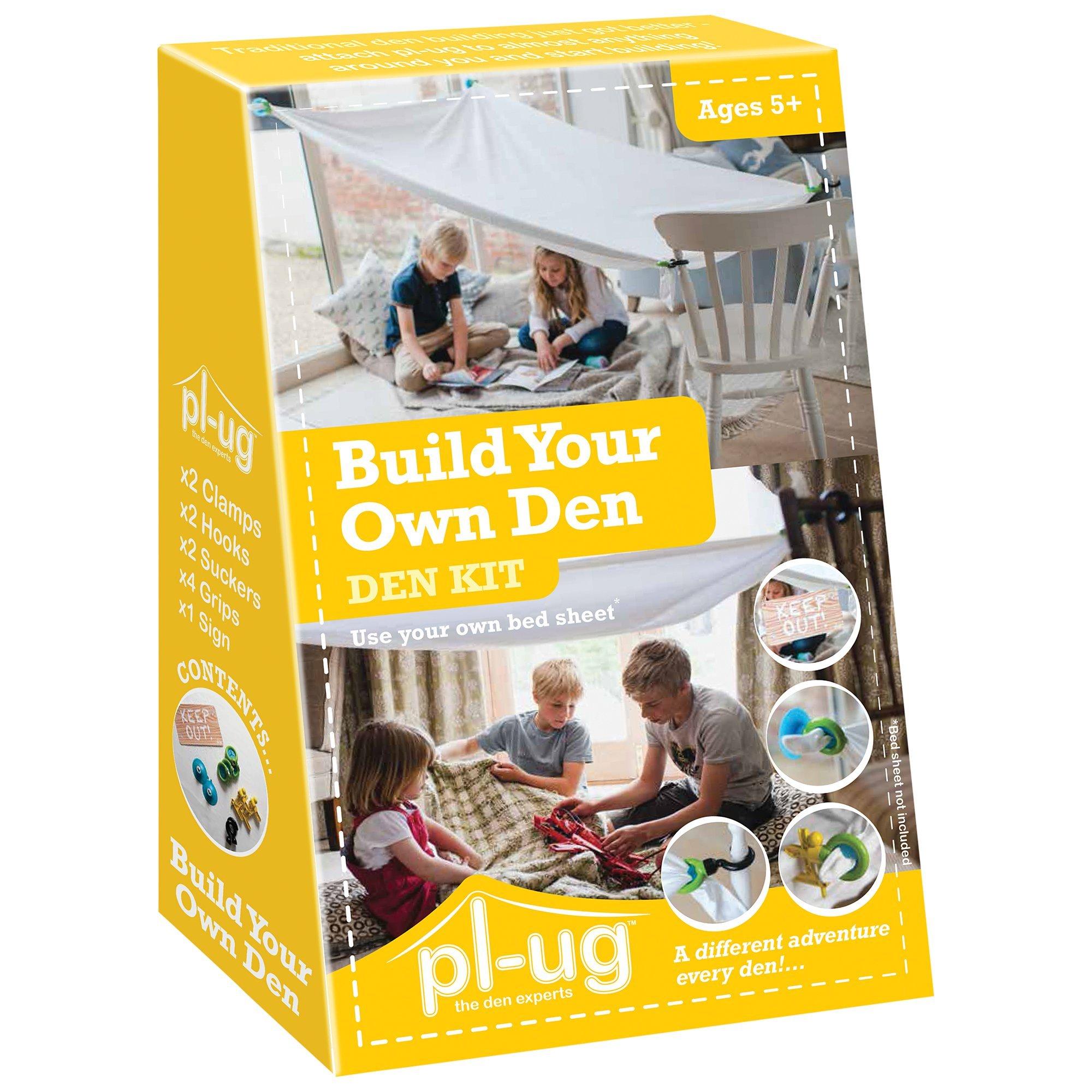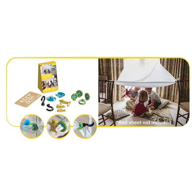 The PL-UG Den Kit allows children to build almost any den they imagine. All PL-UG components are designed to connect together, and be attached to different objects around the house such as tables, chairs and windows. Once you have a structure, all you then need to do is secure your own bedsheet over the top and put your 'keep out' sign on the door!