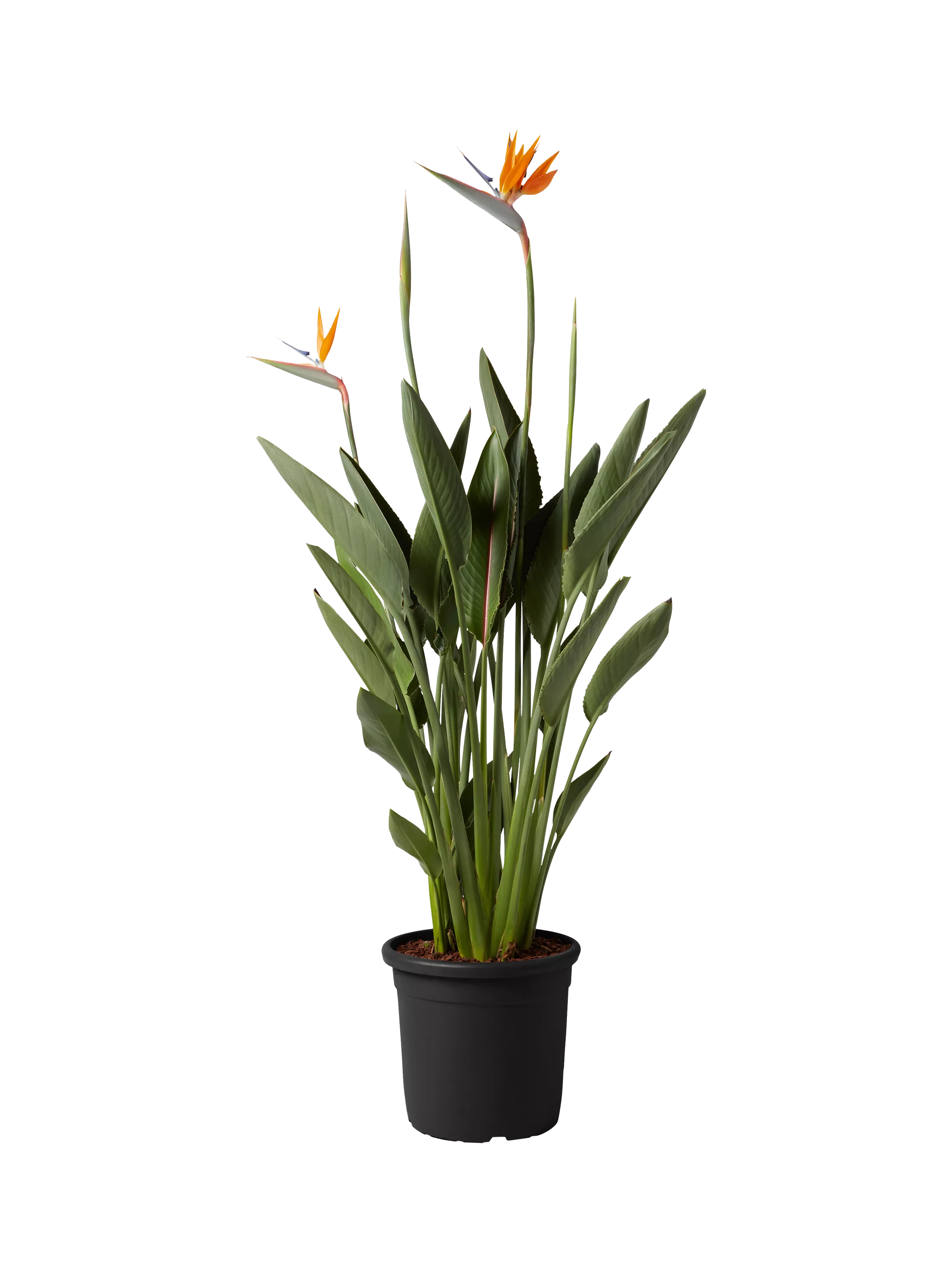Orange Birds of Paradise 140-150cm. Striking orange flowers and silver pointed leaves, this Strelitzia has more of an upright form. Not currently flowering. Plant height is 140-150cm. Decorative pot not included.