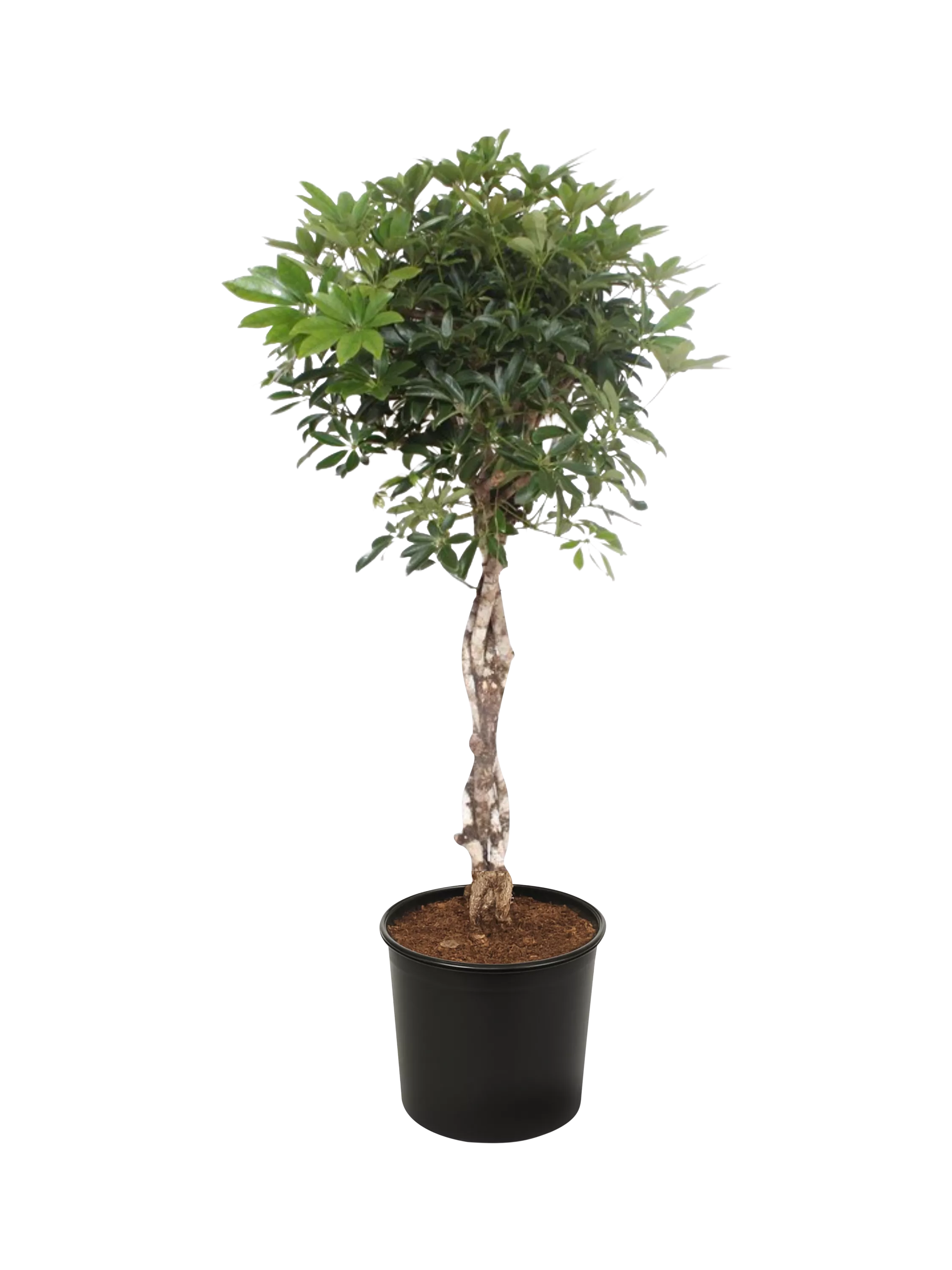 150-160cm tiwsted stem umbrella tree. The umbrella plant has large glossy green leaves that freshen and detoxify the air. Plant height is 150-160cm. Decorative pot not included.