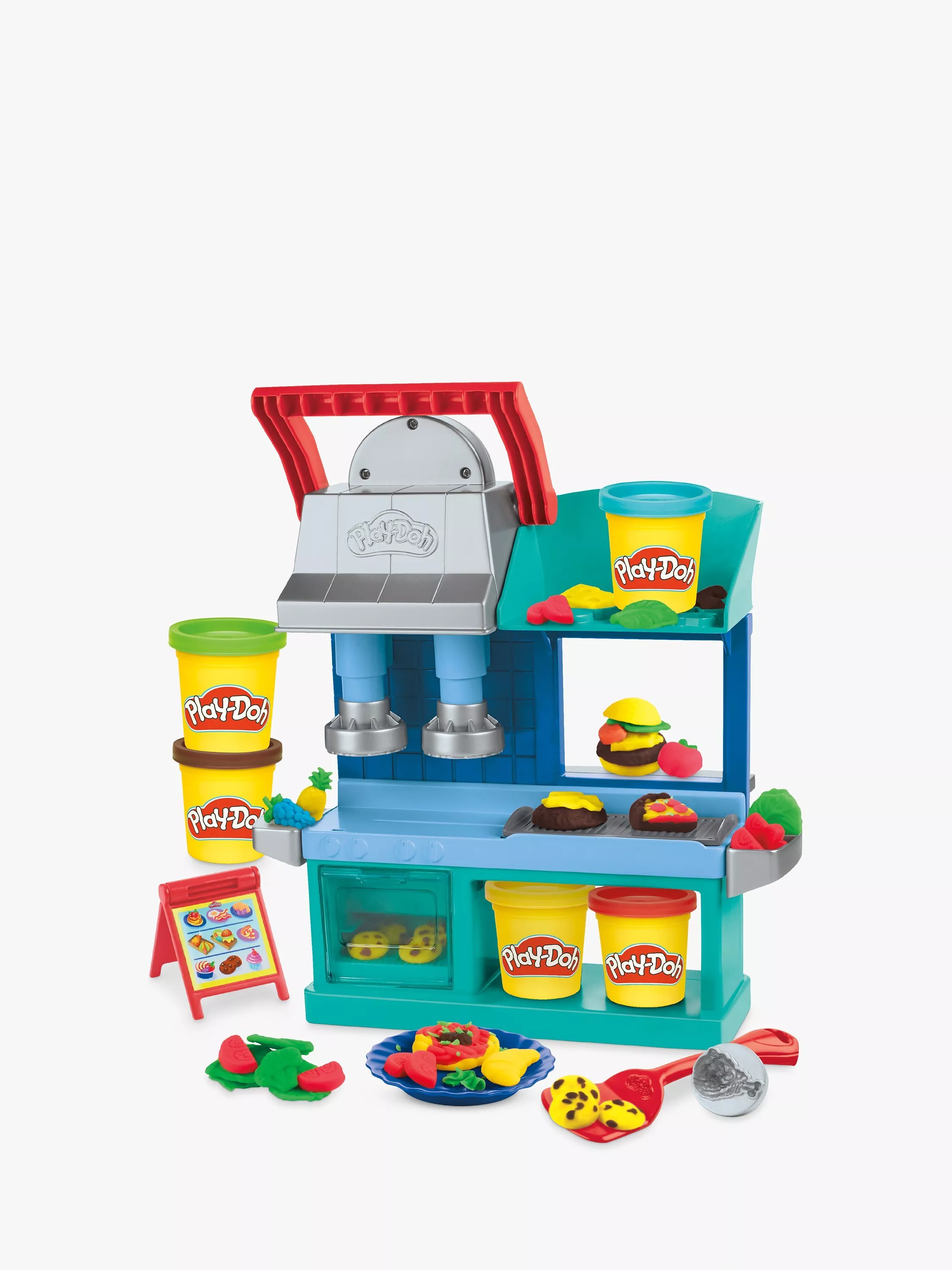 This playset lets kids feel like they're running their own restaurant as they create, customize, and share amazing Play-Doh food creations with pretend customers! Kids can easily attach the stampers to make pretend pizza, burgers, pasta, or chicken and press the lever to stamp 2 play foods at a time! Then, watch the griddle slide over to the prep station as they release the lever! Create make-believe burger toppings, fantastical fries, crazy cookies, and more pretend foods using the half-molds on both sides of this kids playset. Plate creations and pass them through the window to let friends know it's order up! The mini menu board and other toy kitchen accessories add to the imaginative play fun