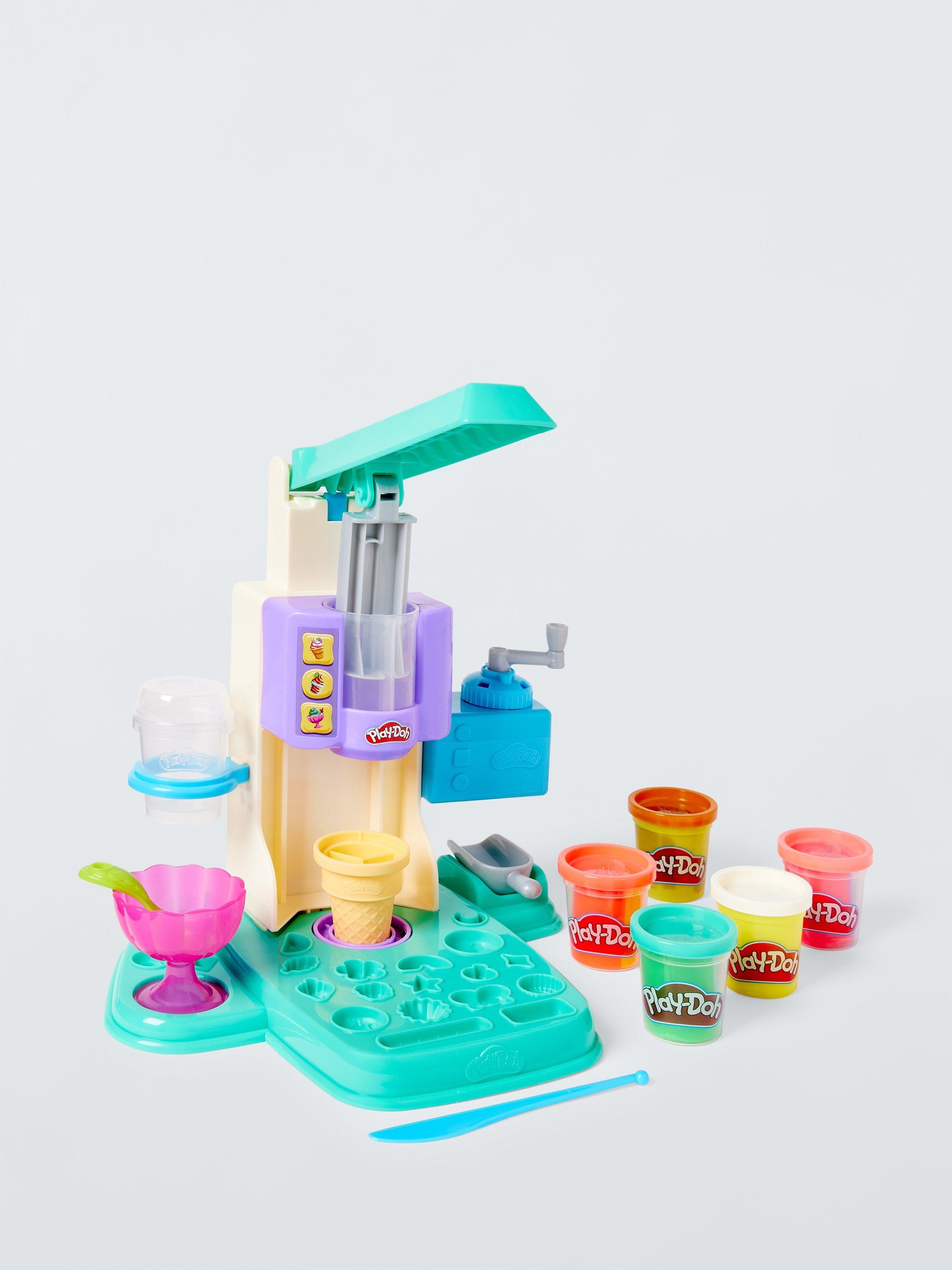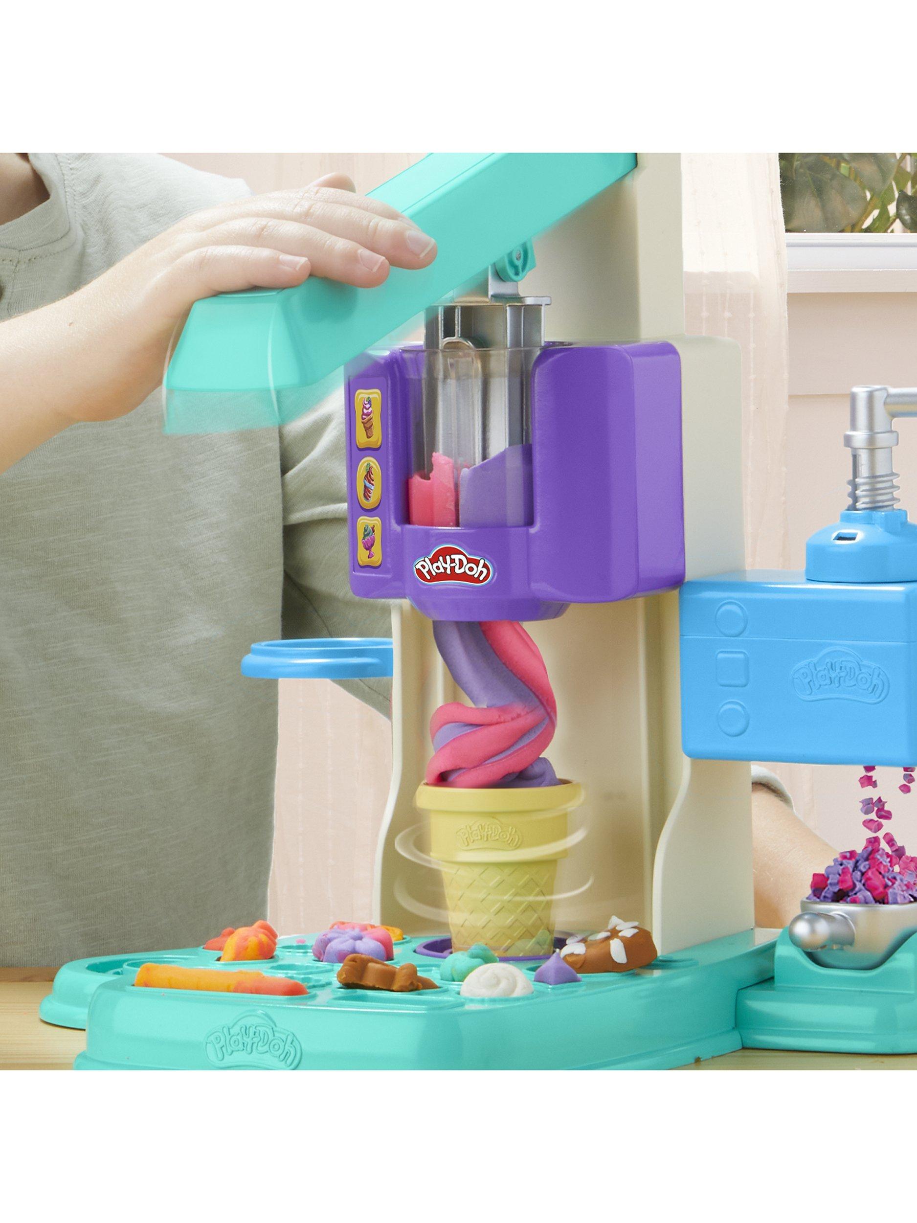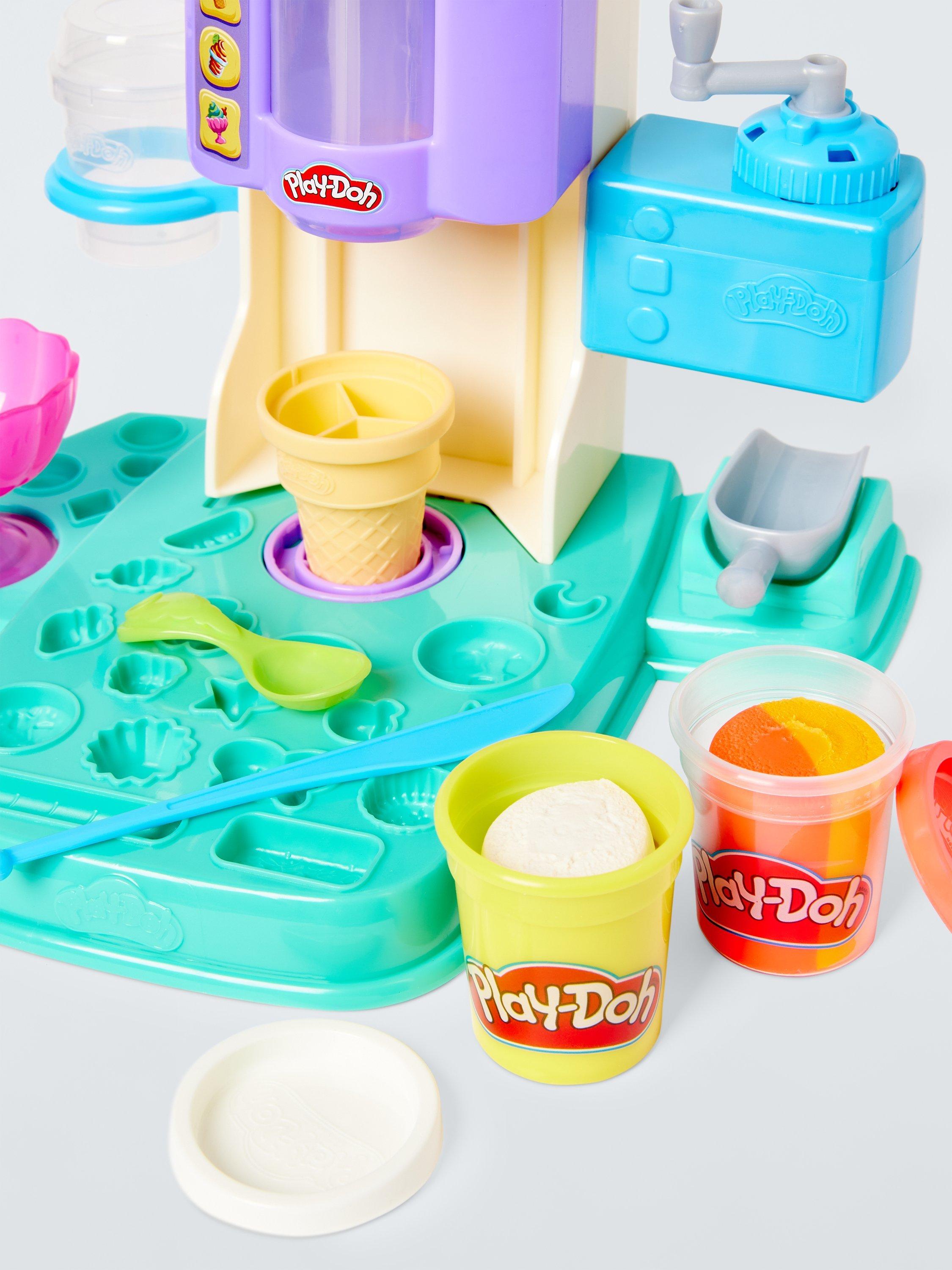 Twirl into imaginative play with the Play-Doh Rainbow Swirl Ice Cream Playset! Load the machine with two or more Play-Doh colours and press the handle to fill the spinning cup or cone with rainbow-edged pretend soft-serve. Create make-believe sprinkles and other Play-Doh food like pretend pretzels, fanciful fruits and crazy candy cups to decorate creations.