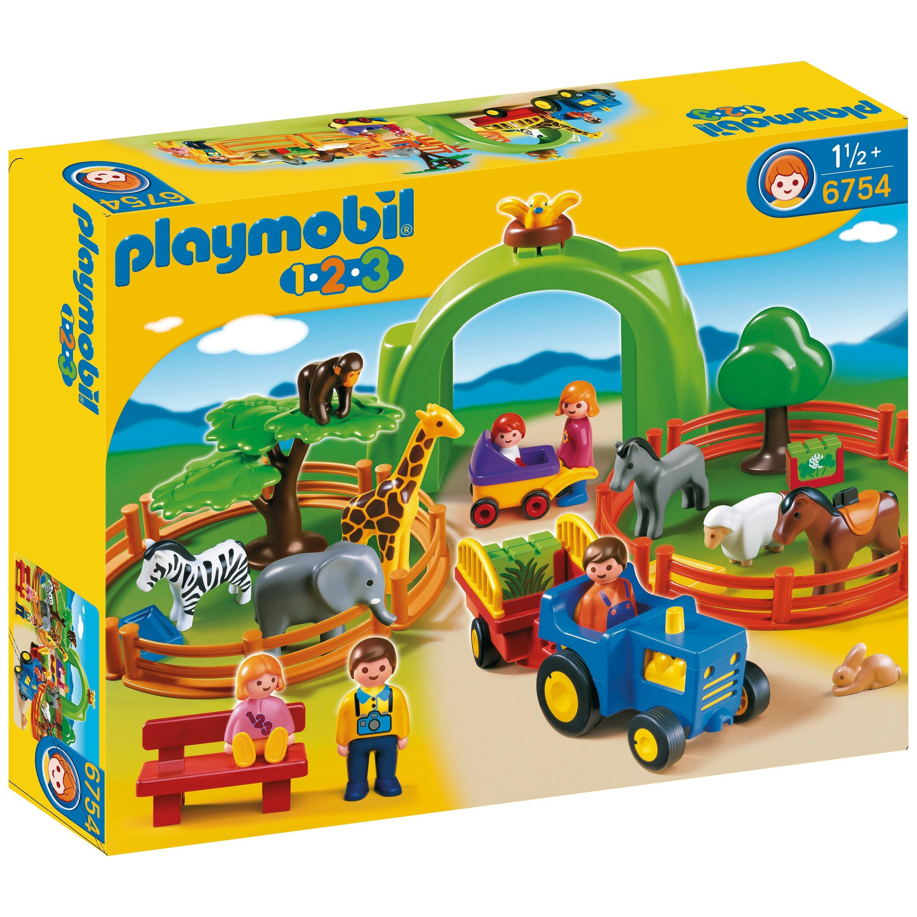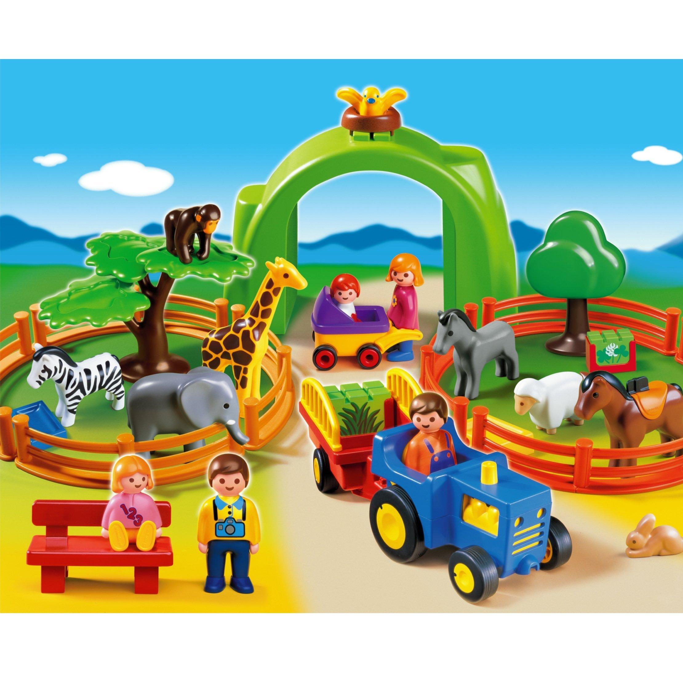 Enjoy a day at the zoo with Playmobil 123! Explore two large enclosures where you'll find all of the interesting zoo animals. The keeper feeds the animals from the trailer on his tractor while the visitors watch the animals at play.