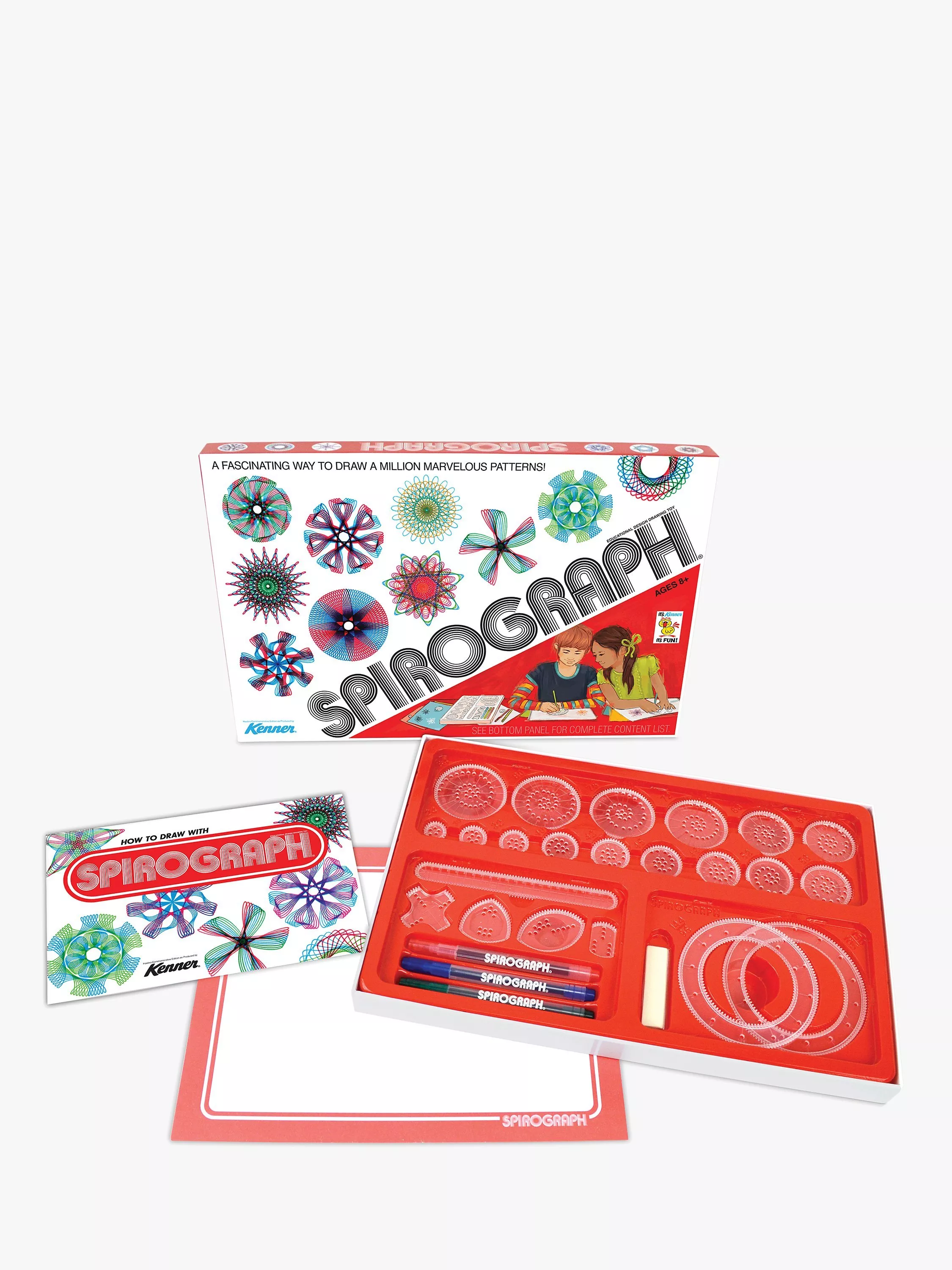This commemorative edition Spirograph set is a reproduction of the original - just like you remember - featuring throwback packaging and retro graphics!