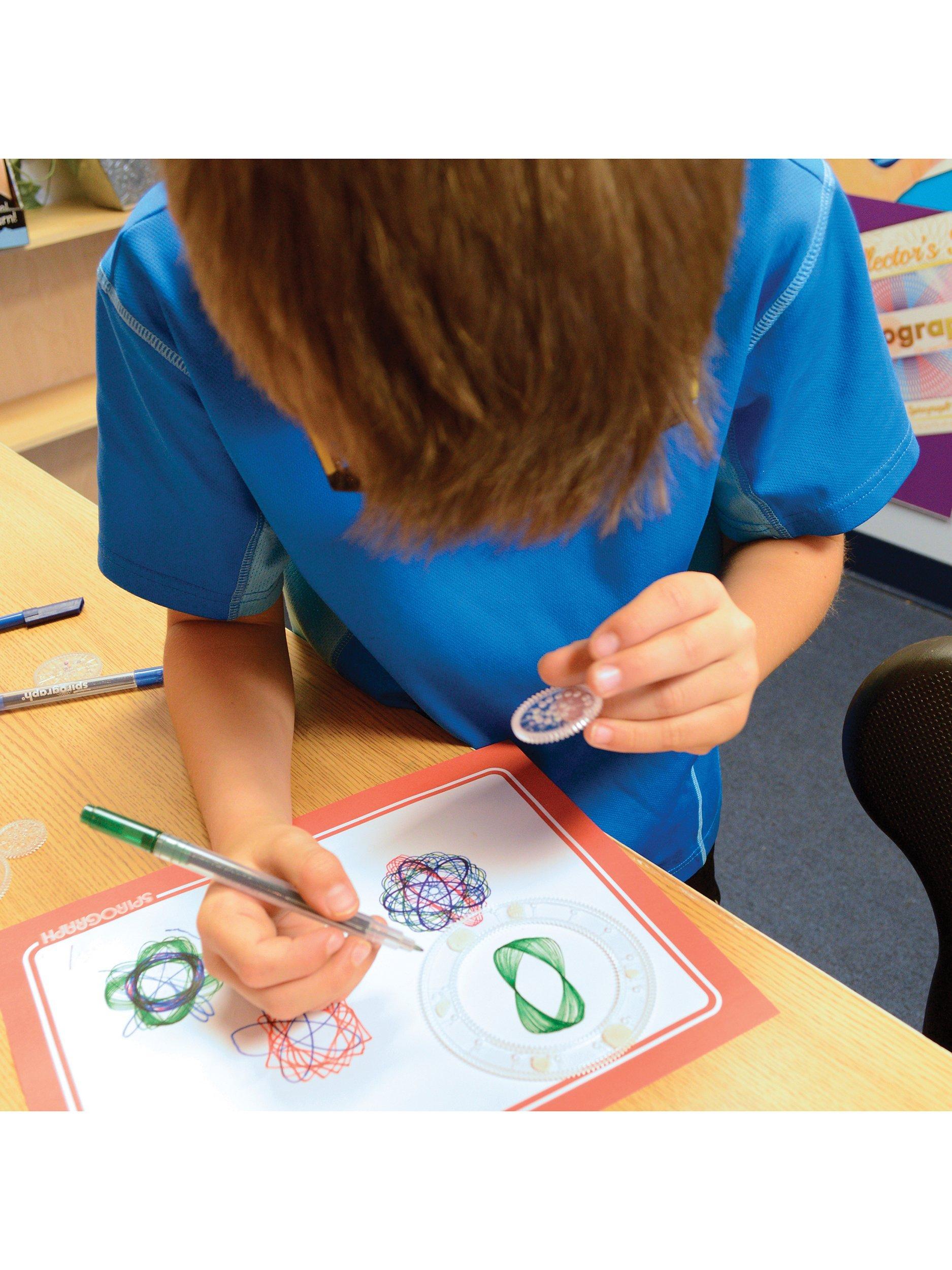 With all the iconic wheels and rings of the original, the precision engineered Spirograph gears work with the three design pens included, as well as with most standard pens, markers and pencils. Spirograph uses a perfect combination of art and mathematics to create beautiful designs.