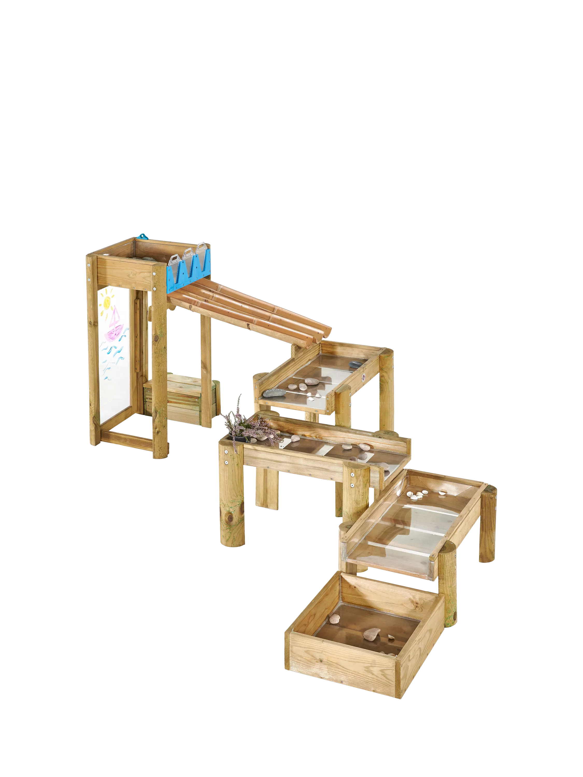 Inspire endless outdoor adventures with the Plum® Discovery Water Run, with three levels and five wooden reservoirs that are lined with a transparent watertight liner for added durability and fun!