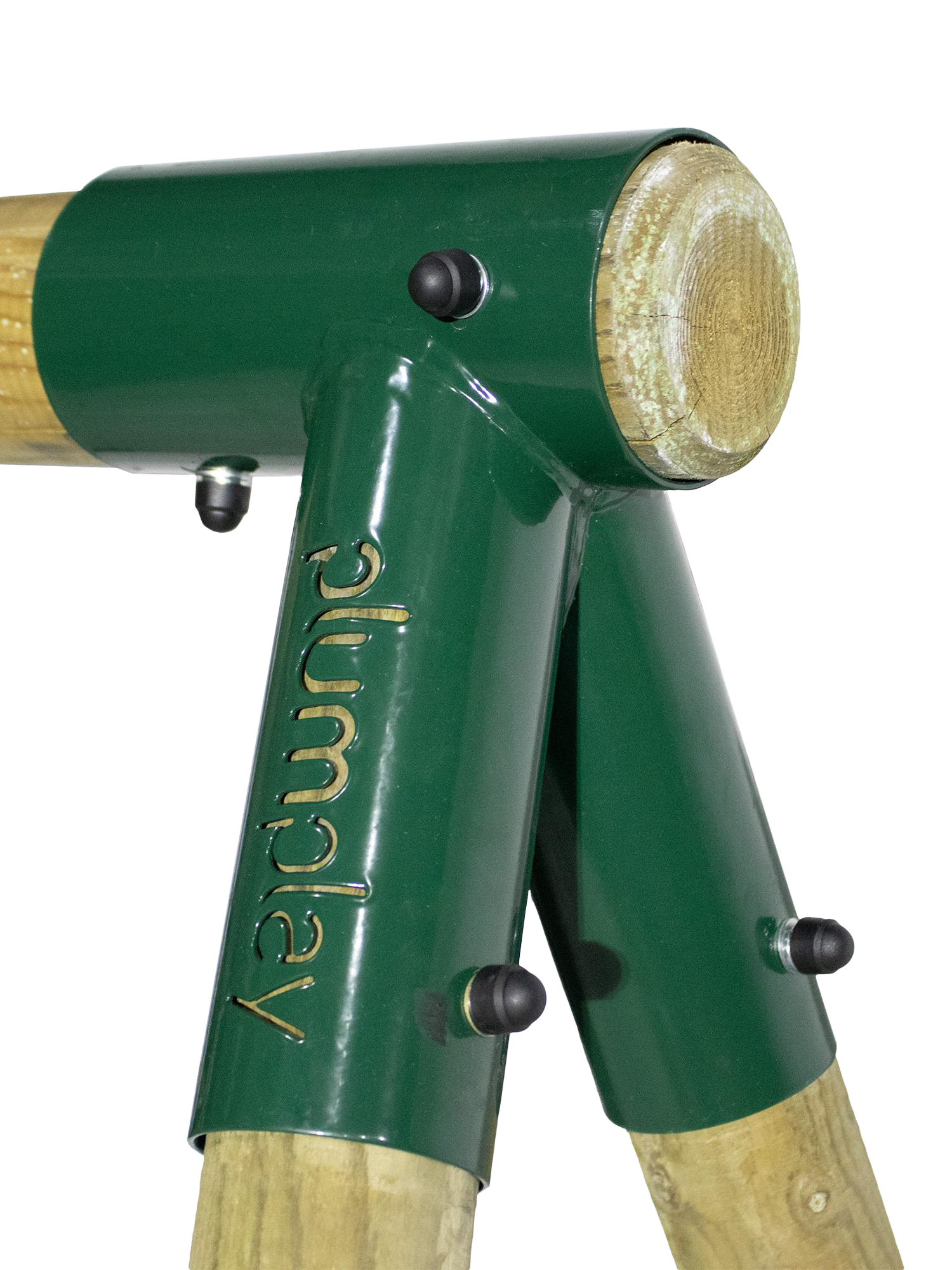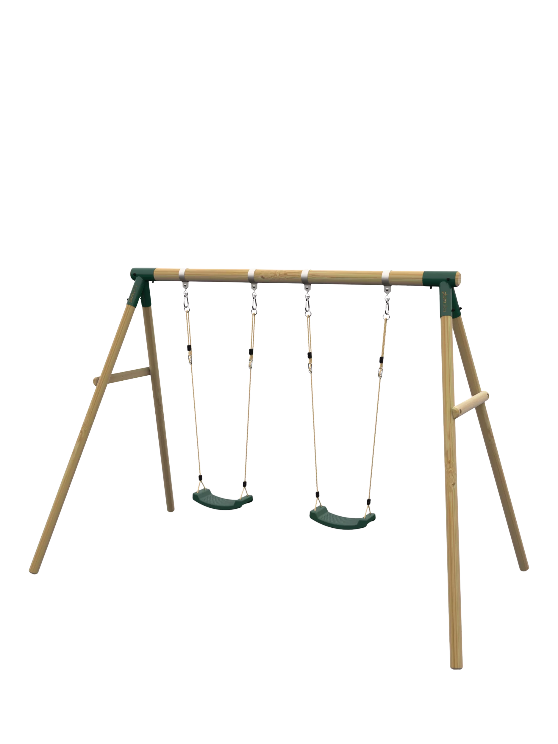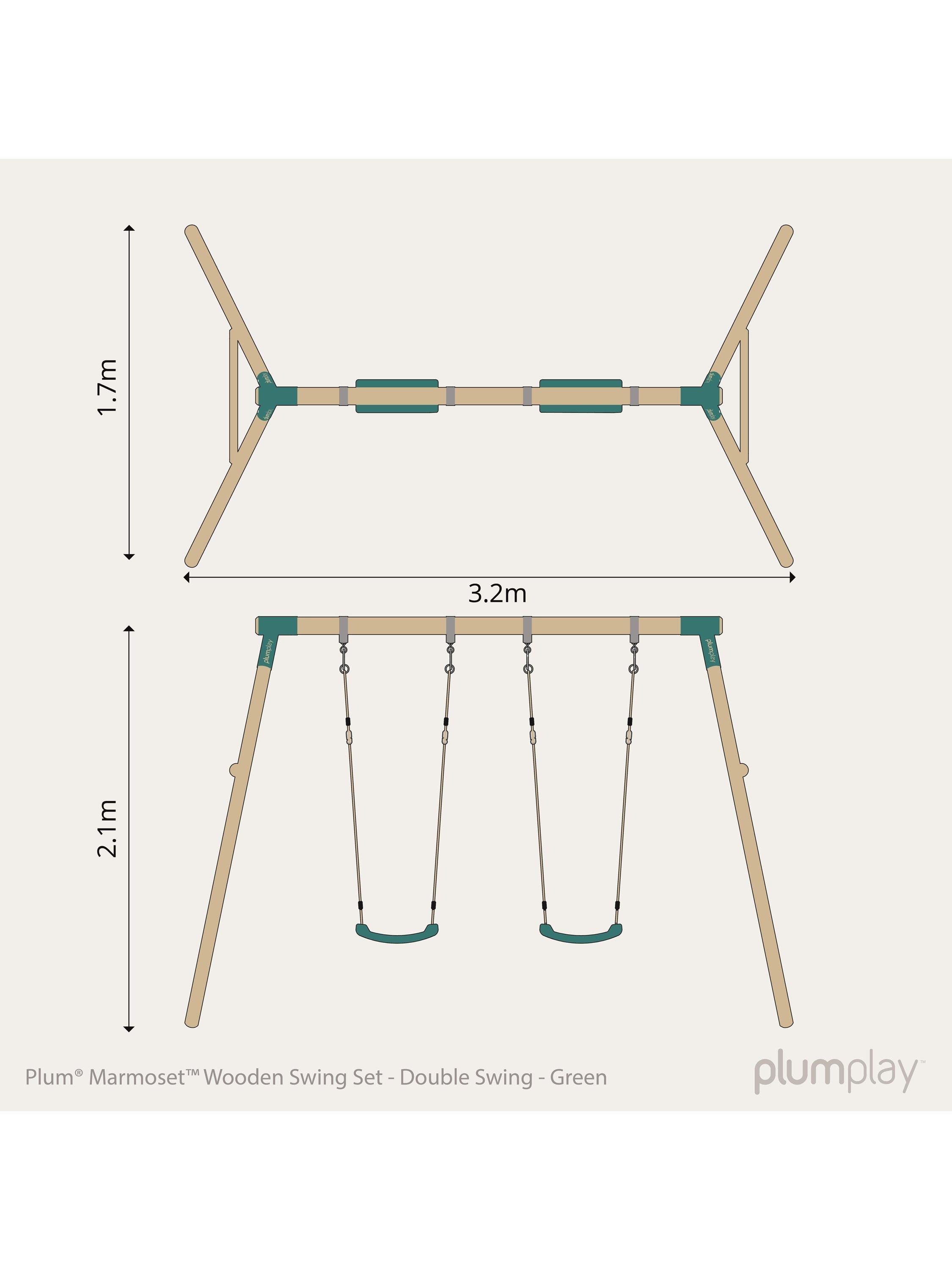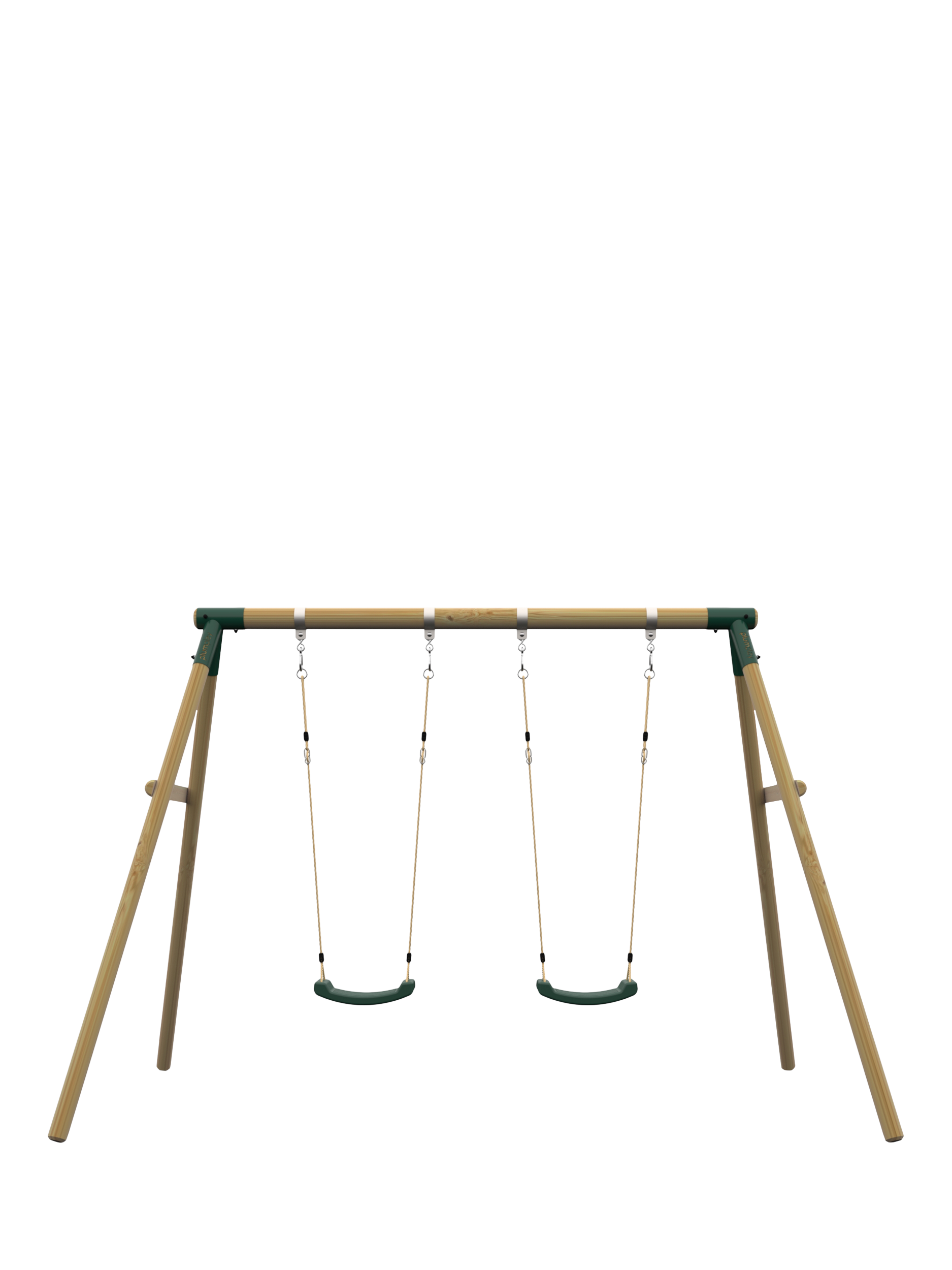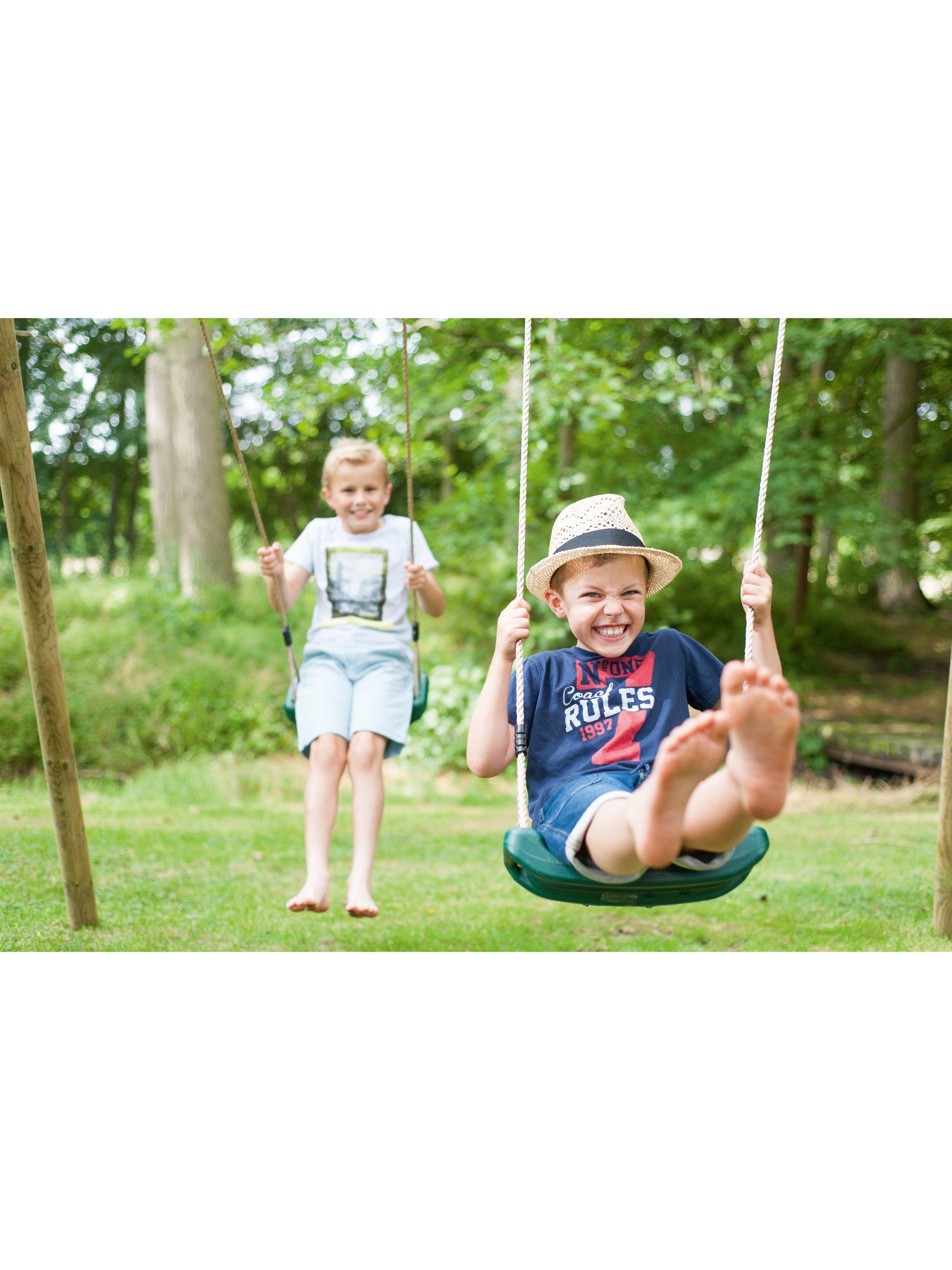 This wooden swing set from Plum® offers two swings, which use soft feel ropes and heavy duty blow moulded seats for extra durability. The round wooden pole is pressure treated for extra strength. The swing set top bar is 90mm in diameter and the legs are 70mm in diameter making the frame highly robust. Metal swing attachments encircle the pole so no drilling is required, maintaining the strength and integrity of the timber. The sturdy frame also has wooden cross braces giving the swing extra stability.