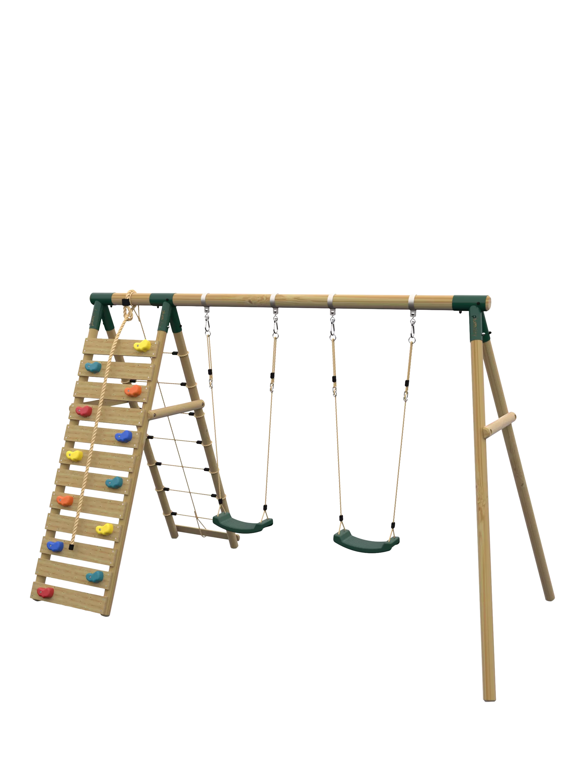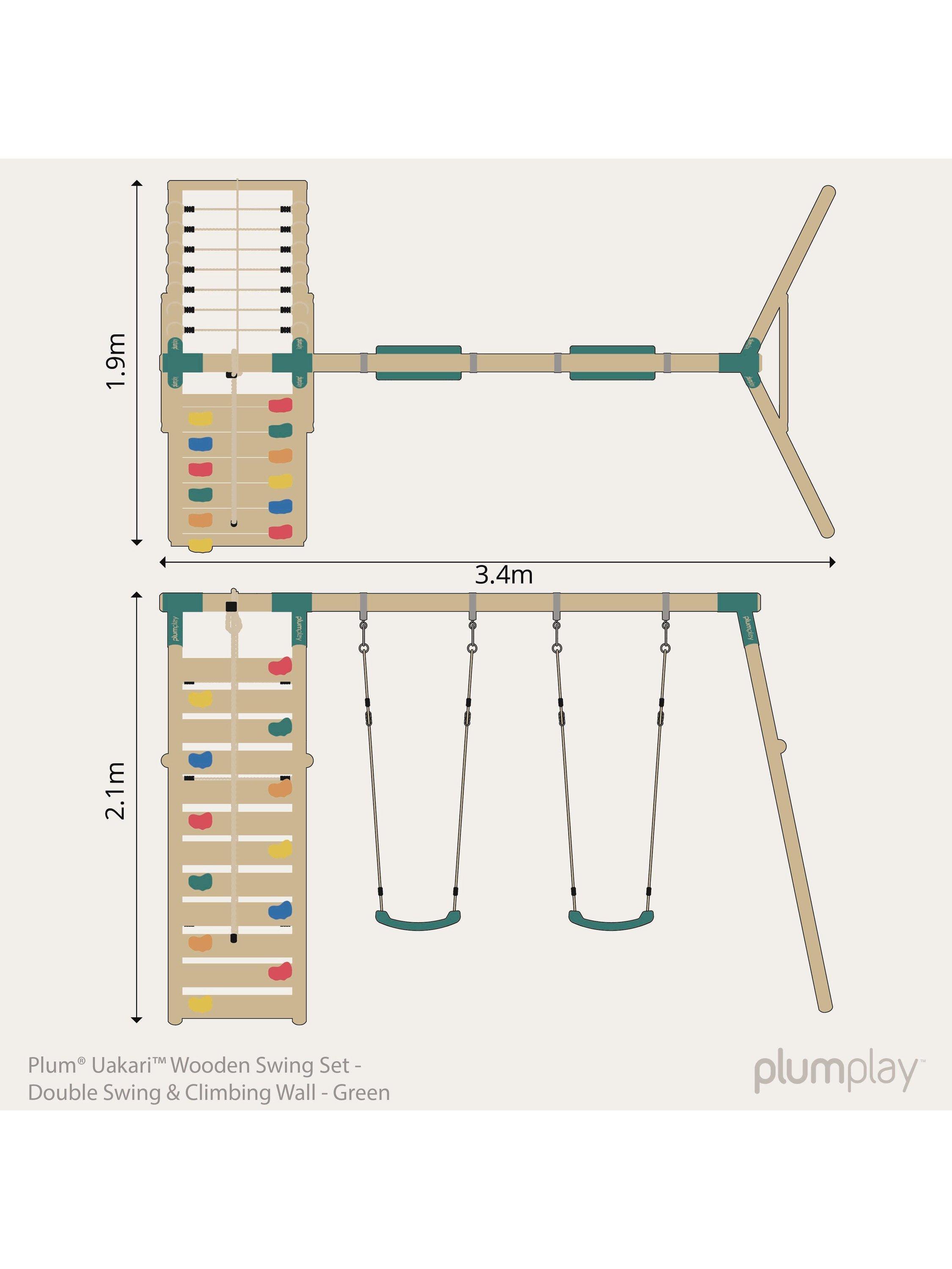 The amazing Uakari™ Wooden Swing Set from Plum® is perfect for agile and active outdoor play. This fantastic garden swing set features double swings, rock wall with coloured hand and foot grips and a soft feel cargo net. The wooden swing set provides plenty of space to socialise and play with friends.