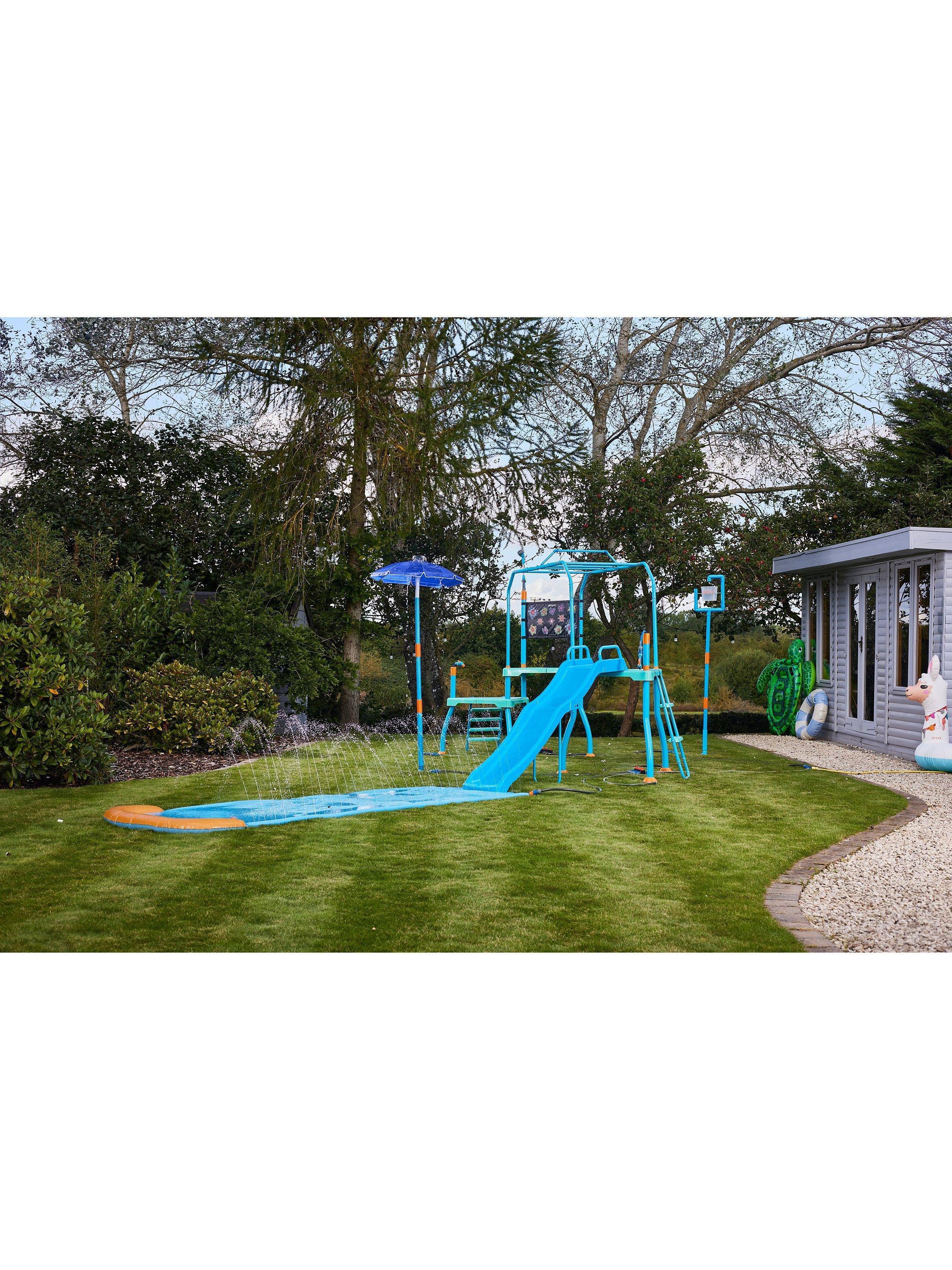 Other features include the Tidal Tipper bucket, which fills with water and tilts to create a big splash. The Umbrella Fountain cascades a refreshing rain shower, so take cover or embrace the downpour – it’s your choice! Kids can have even more water play fun with the water reveal target wall. Aim the water blasters at the wall to reveal numbered targets and battle it out to get the highest score. Whizz through the watercourse by swinging along the monkey bars, and swoop down the 6ft water slide. Then slide along the water chute - complete with sprinklers - for an epic splashdown! This play centre is ideal for both wet and dry play, bringing endless year-round fun.
