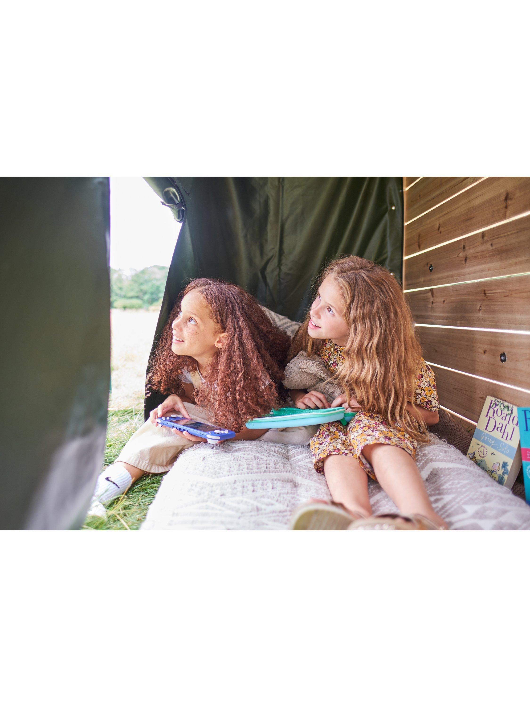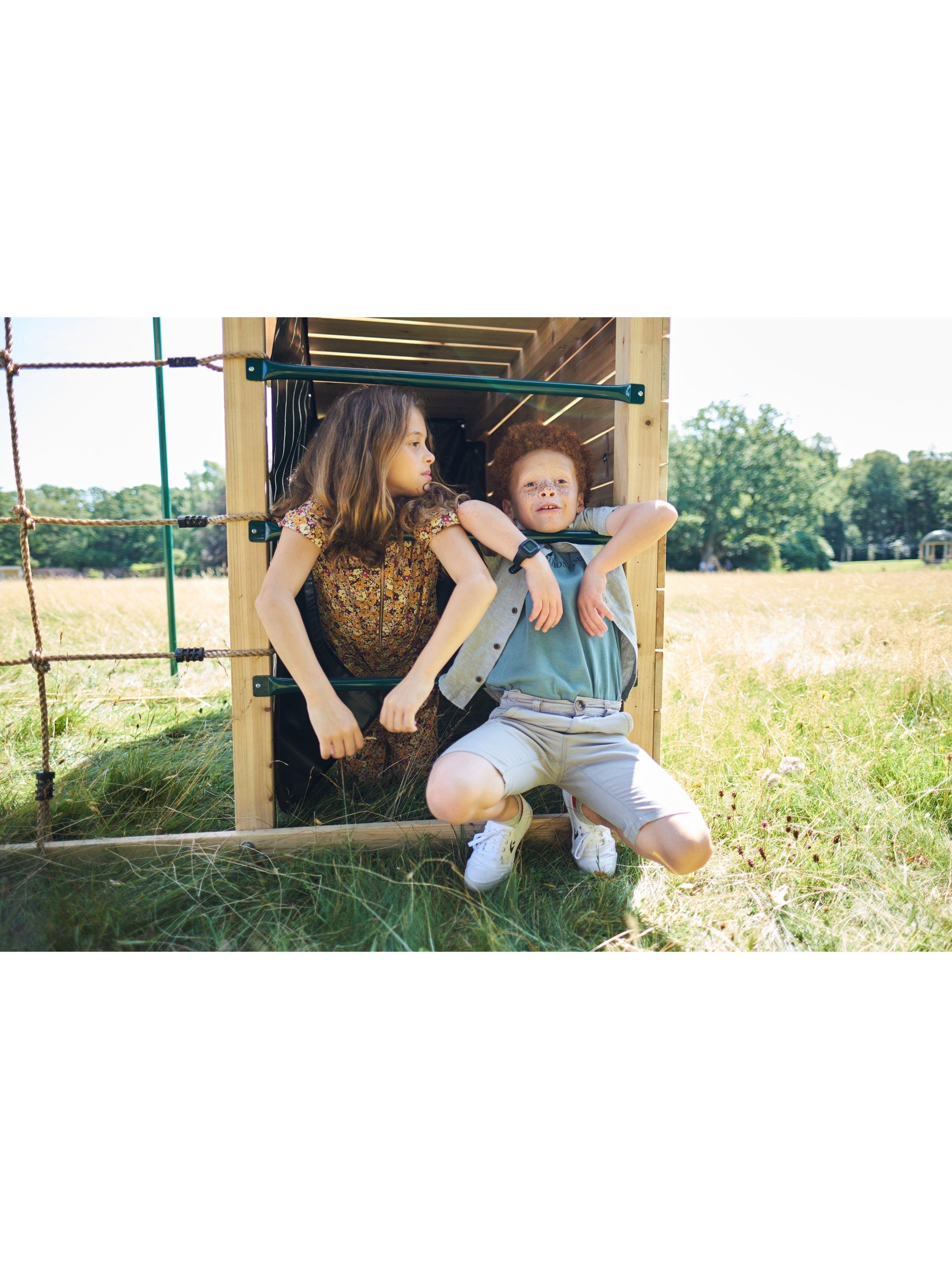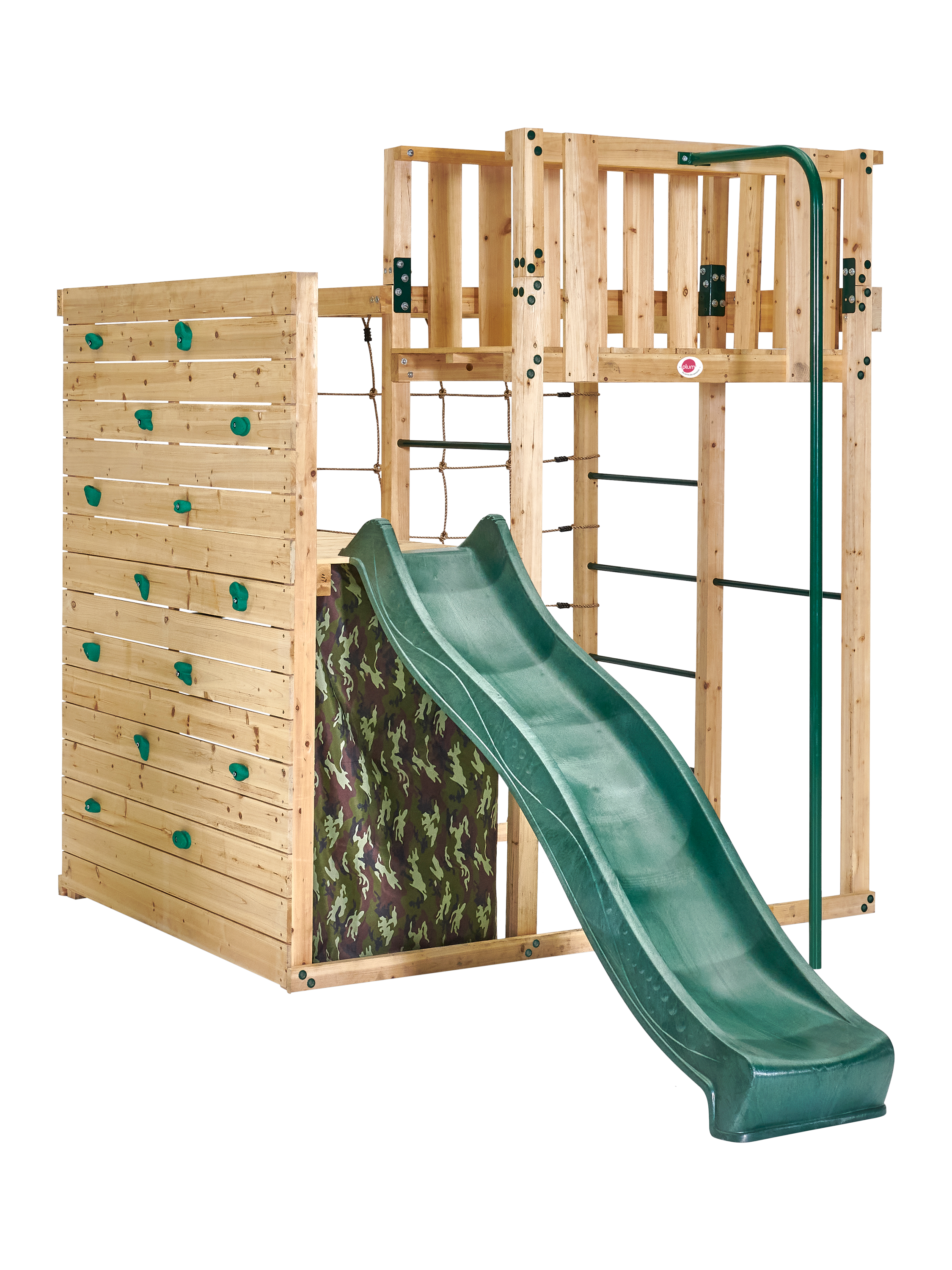 The camouflage fabric den is ideal for imaginative role play and creates a large secret play area, great as a rendezvous point on secret missions, or as a kiddies' HQ! A wooden crow's nest lookout with a 2.5-metre fireman's pole makes the Climbing Cube extra-large.