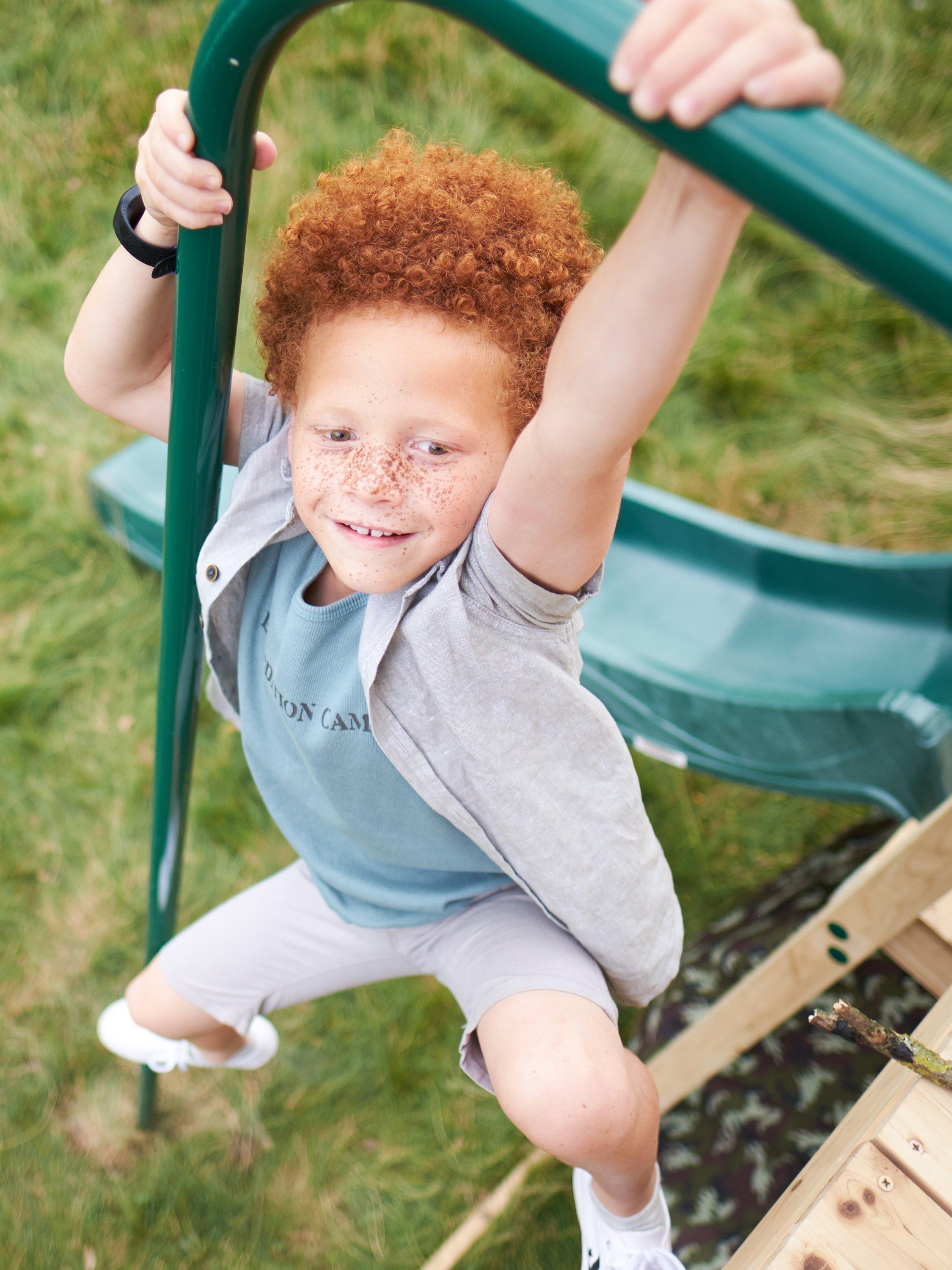 Climbing features include a wooden platform with an 8-foot (244cm) wave slide, ladder, monkey bars and trapeze with metal rungs, for swinging and hanging. As well as a rock wall with hand and foot grips and a cargo net. Strong and sturdy, it's built to last for years to come.
