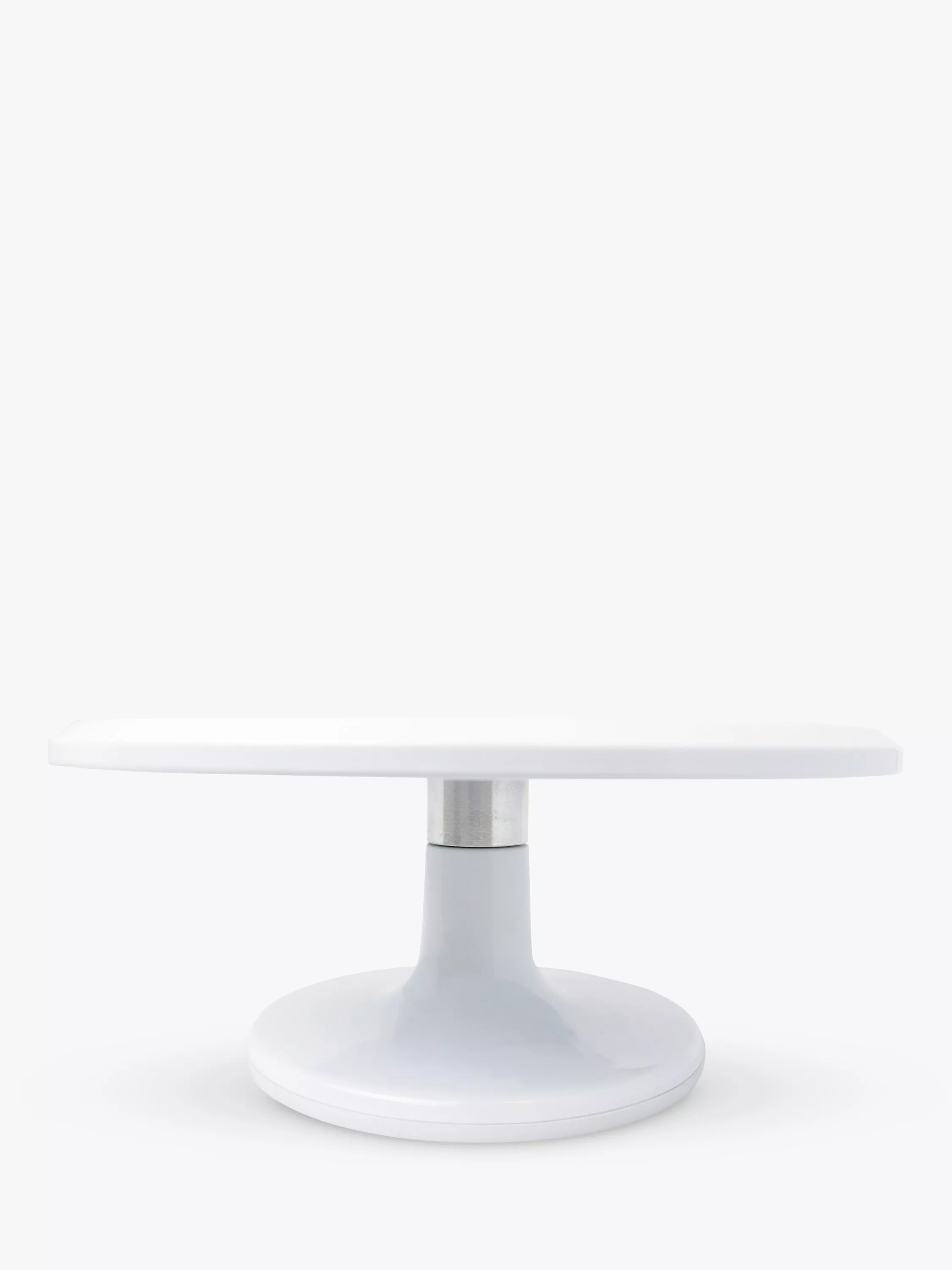 It doubles as an elegant cake stand with its food-safe white coating and at 13cm/5-inch tall to raise your cake to the perfect height. The top is 12-inch/30.5cm in diameter with a flat surface and dipped edge for easy access to the bottom of your cake without catching the piping bag on the turntable.