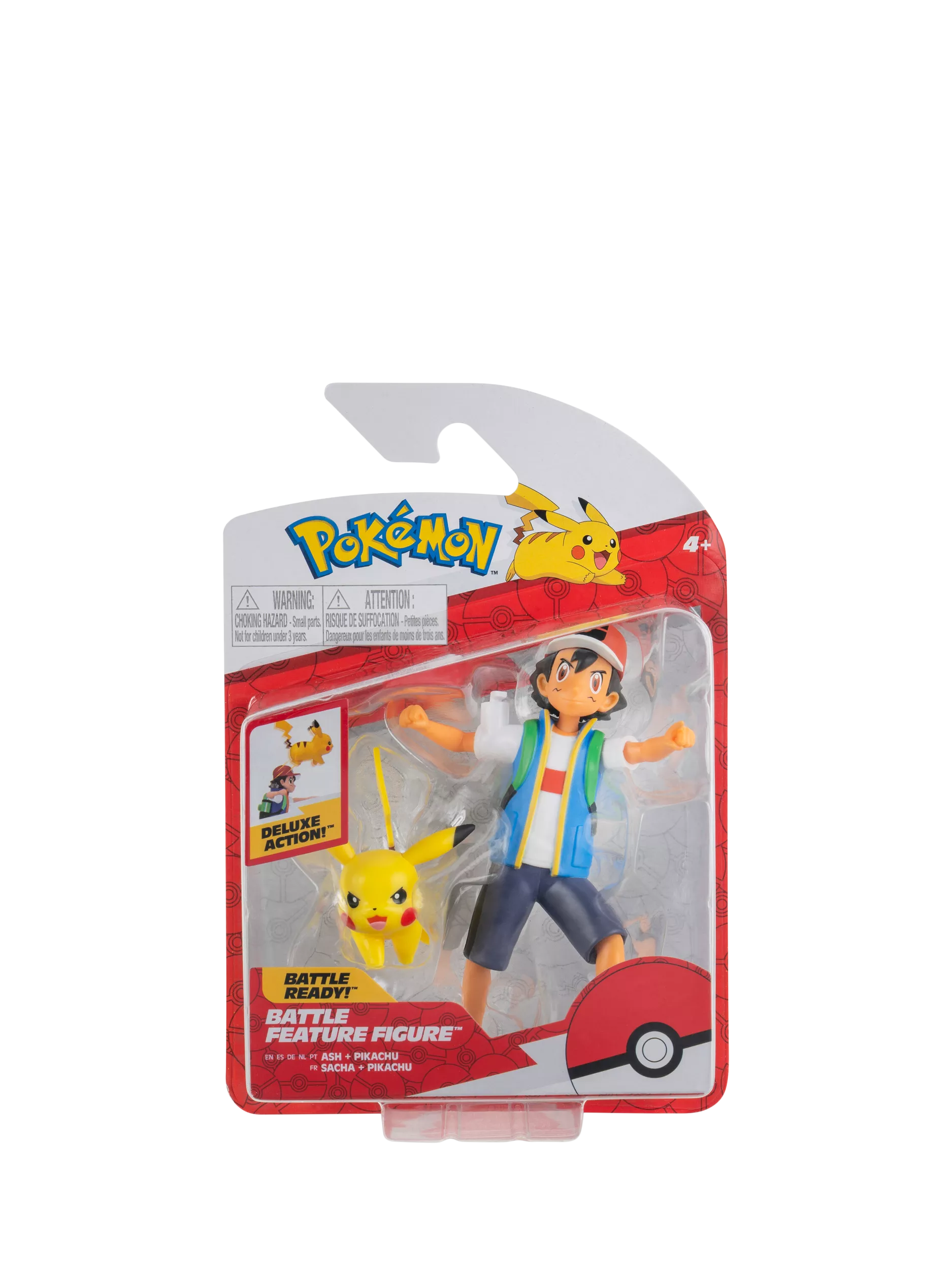 Choose it or lose it with the Ash Ketchum Battle Feature Figure! Featuring numerous points of articulation and a two-inch (5cm) battle figure of Ash's Pikachu, this 4.5-inch (11cm) figure is made for play and display. It also includes a special trainer move which launches Pikachu into battle. It was designed with authentic details and looks like it jumped right out of the Pokémon Animated Series.