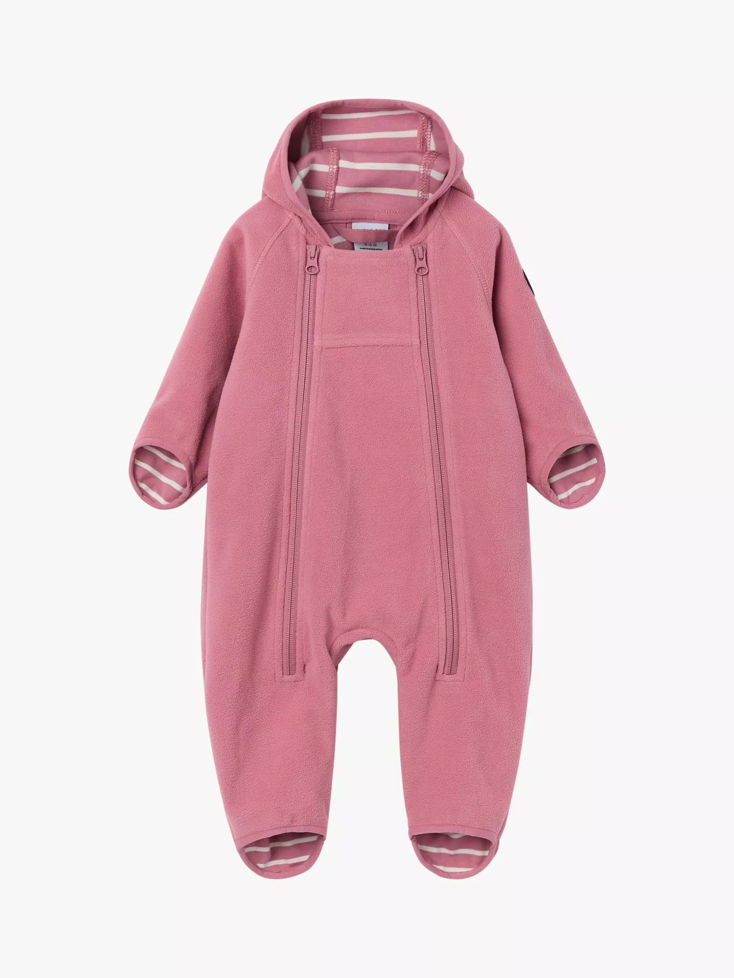 This fleece pramsuit will protect baby from the wind and rain. Made in 100% recycled polyester it is water-repellent making it ideal for light showers while the organic cotton jersey lining gives added comfort. It features double zips with chin guards and a storm flap to protects against the cold.