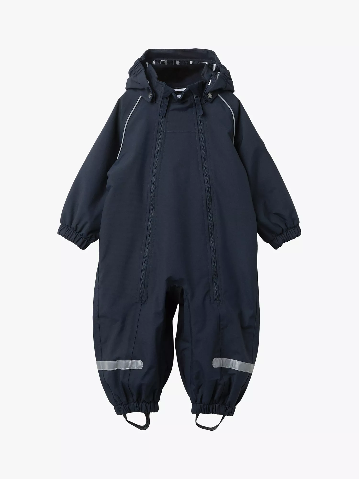 Torrential rain is no match for this wind and waterproof shell overall from Polarn O. Pyret. In durable fabric with recycled polyester lining this functional overall has fully taped seams and a detachable hood with elastic edging for best fit. Finished with soft fleece on the inside of the collar and cuffs an anti-chafe chin guard on the zip. A storm flap gives extra protection against the cold.
