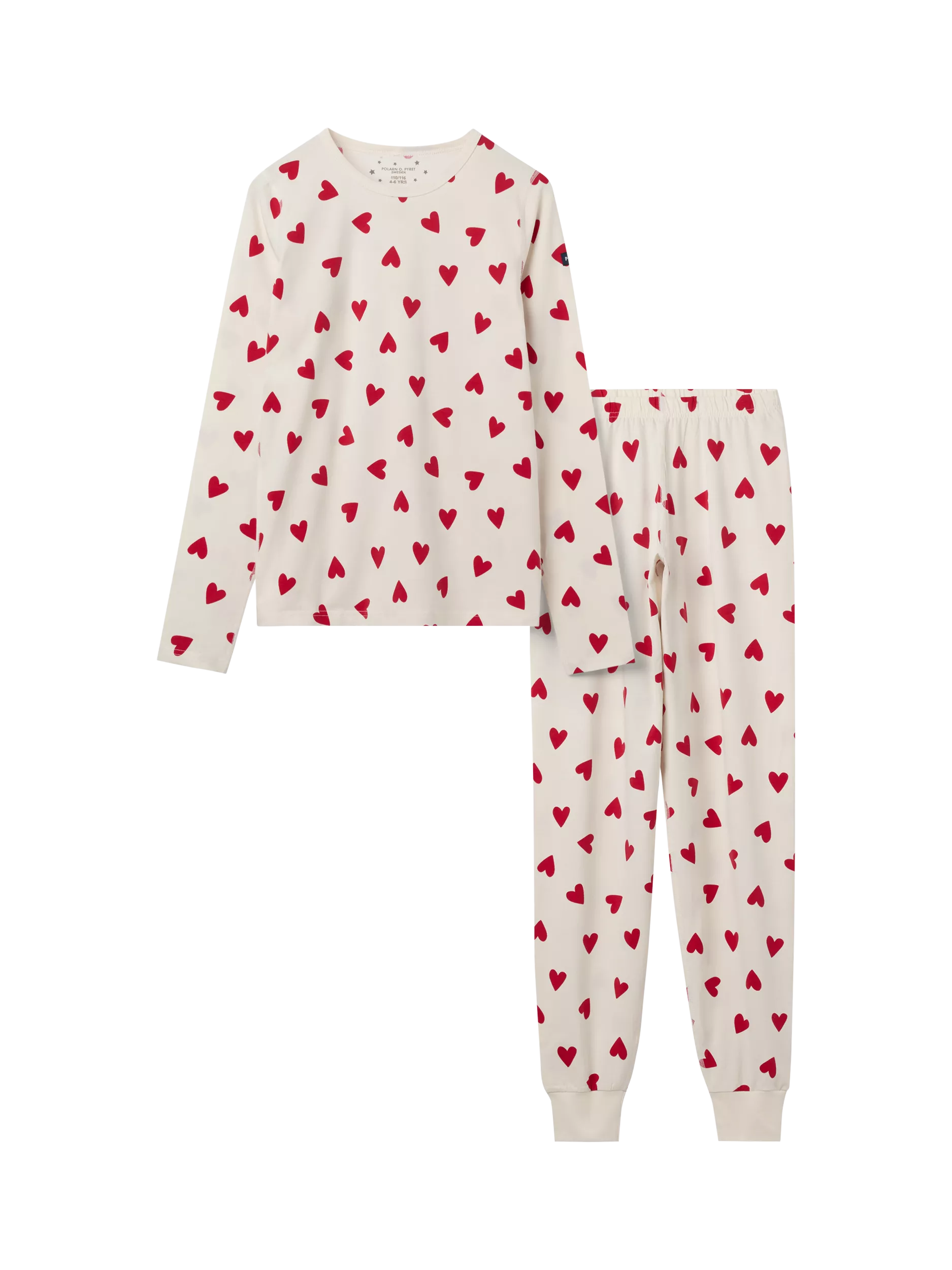 Get the whole family together in coordinating pyjamas in Polarn O. Pyret's kids and adult sleepwear range. Sweet dreams are guaranteed in these soft cotton blend pyjamas. The long-sleeved top has a pretty heart print and comfy crew neck while the matching bottoms have an elasticated waistband for a comfortable fit, finished with plain coloured cuffs.