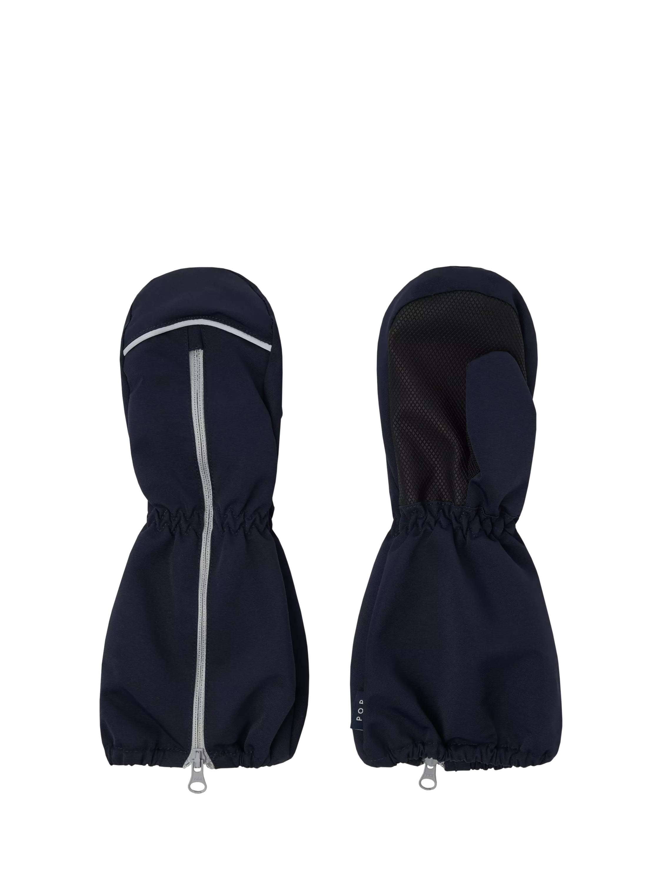 Wind and waterproof mittens with a comfy fleece lining and a long zip on the upper side to make them easy to put on and take off. The mittens have reflectors at the front and a grip-friendly surface on the palms. The zip is not waterproof.