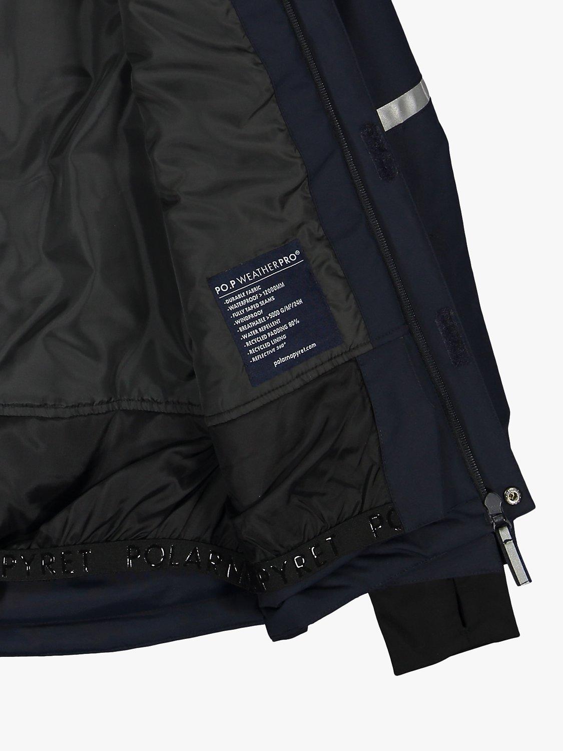 Functional winter coat from Polarn O. Pyret, wind-proof and waterproof with warm recycled polyester padding for harsh weather conditions. Perfect for all winter activities, including skiing, this practical piece comes with an adjustable waist and pre-shaped sleeves for a better fit and freedom of movement.