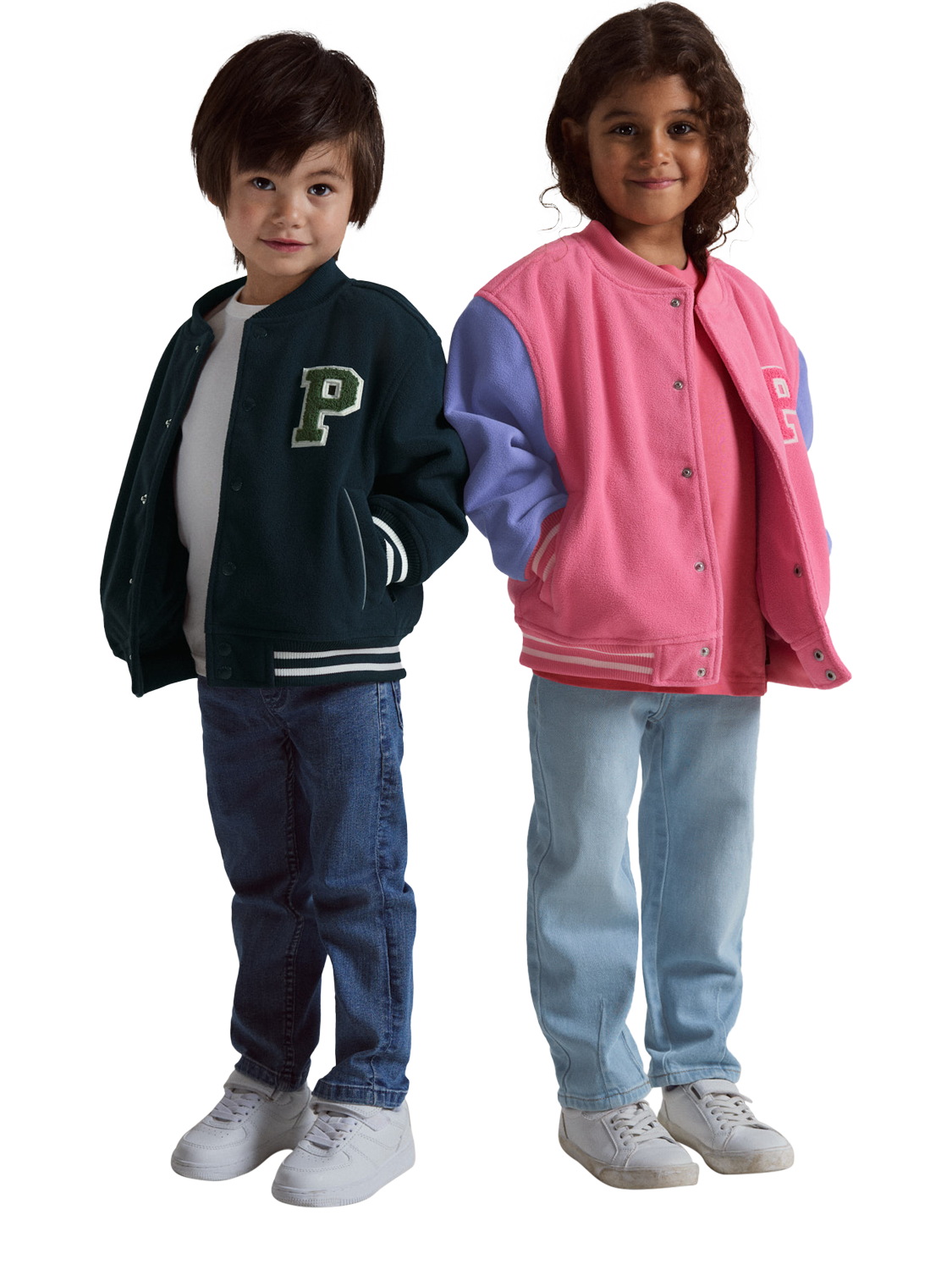 Varsity jacket made from soft, windproof material that keeps out the chill. A versatile jacket that keeps your child warm throughout the seasons. The jacket features ribbed cuffs and hem for a perfect fit and closes with front press buttons. Includes two pockets and reflective detailing.