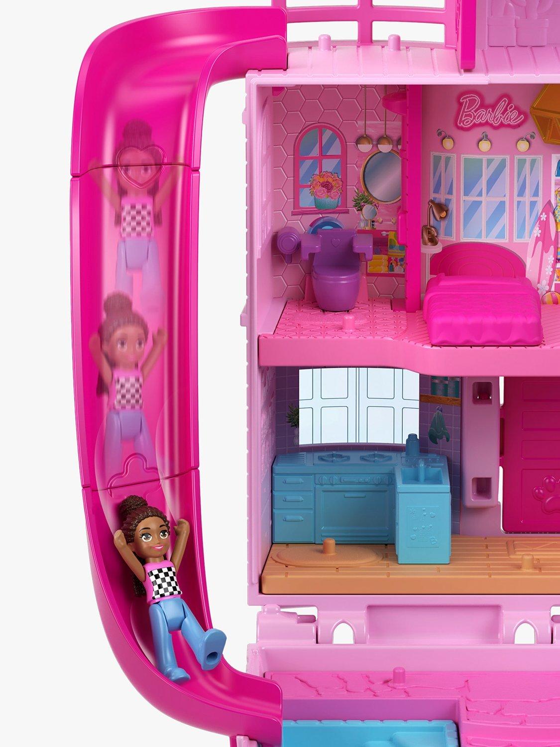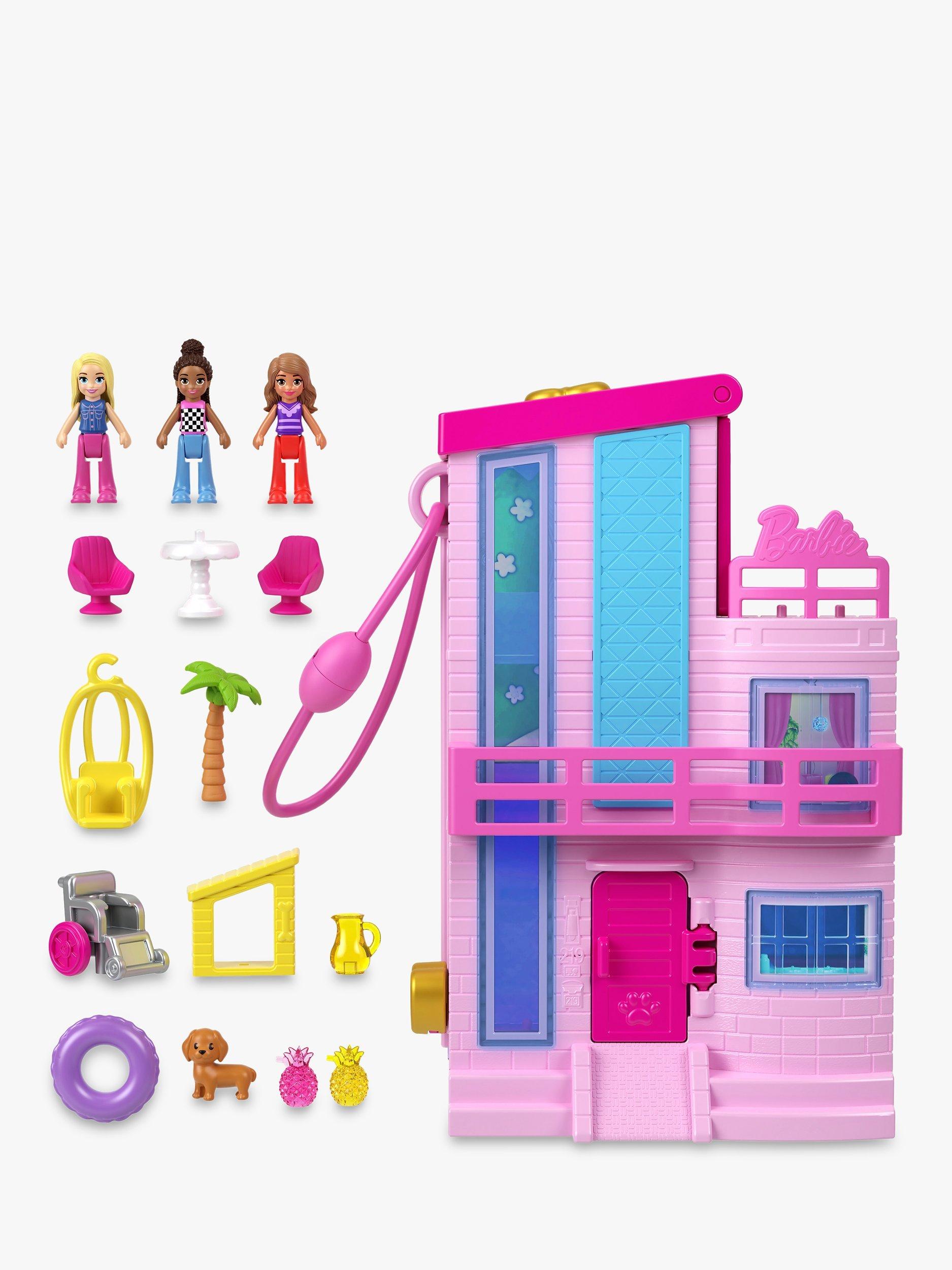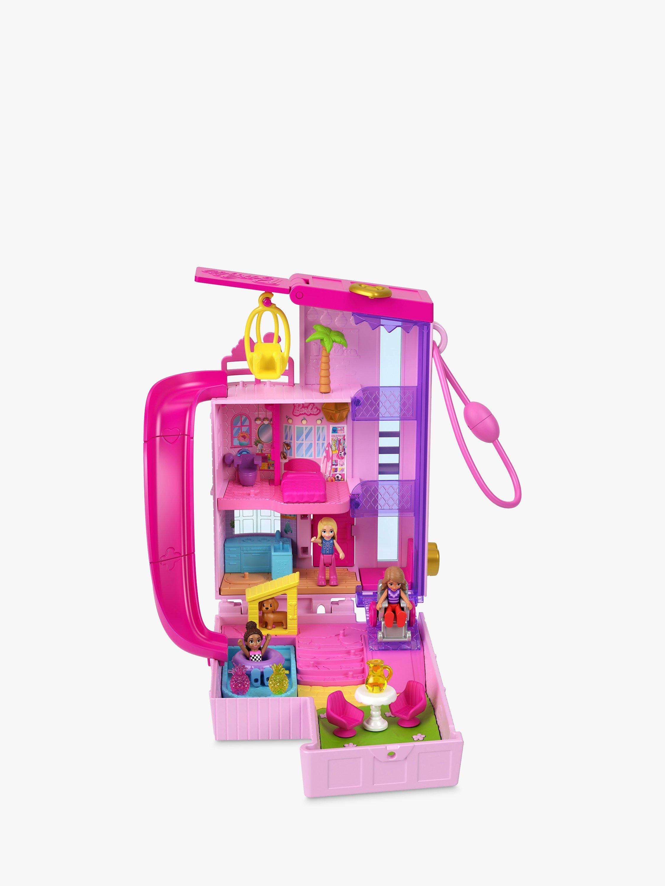 The Polly Pocket Barbie Compact playset resembles the iconic Barbie Dreamhouse in micro Polly Pocket form. There are three stories inside as well as an outdoor play space and an elevator to take Barbie and two friends from floor to floor.